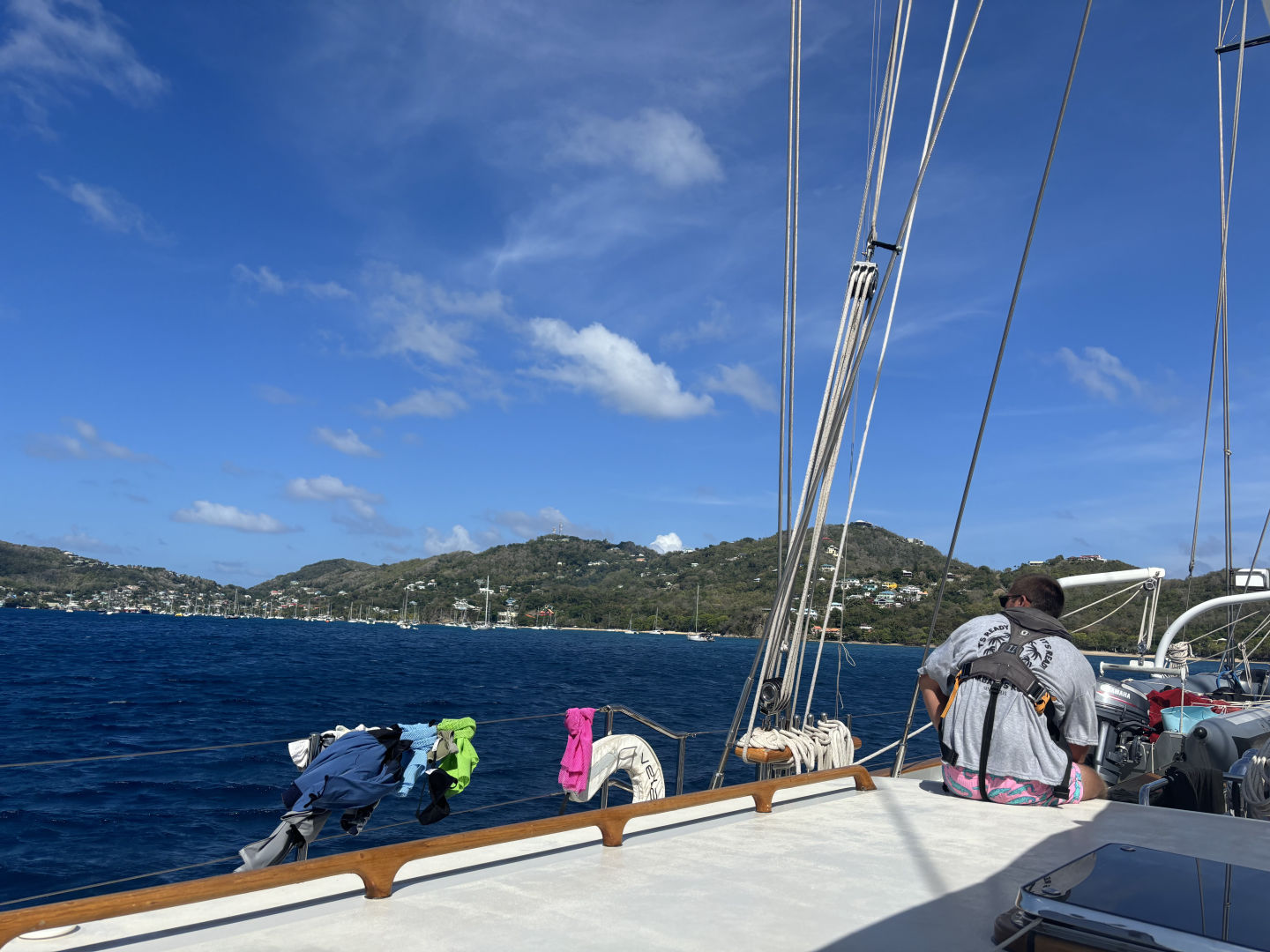 We wasted no time getting going, with sail-covers coming off and sails put up. And we are off (again)! This time to Bequia. We students had an interesting discussion about whaling in marine biology today. Whaling is a common practice in Bequia (where we are now) and part of their culture. Some great points were made. Is it still ethical to whale? Even if it’s done sustainably and has been for centuries? What if it’s an integral part of their culture? Can we allow some whaling and make it illegal somewhere else? Where is the line drawn? Lunch came at the perfect time to end the discussion.
