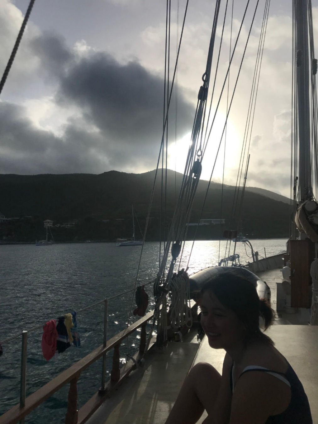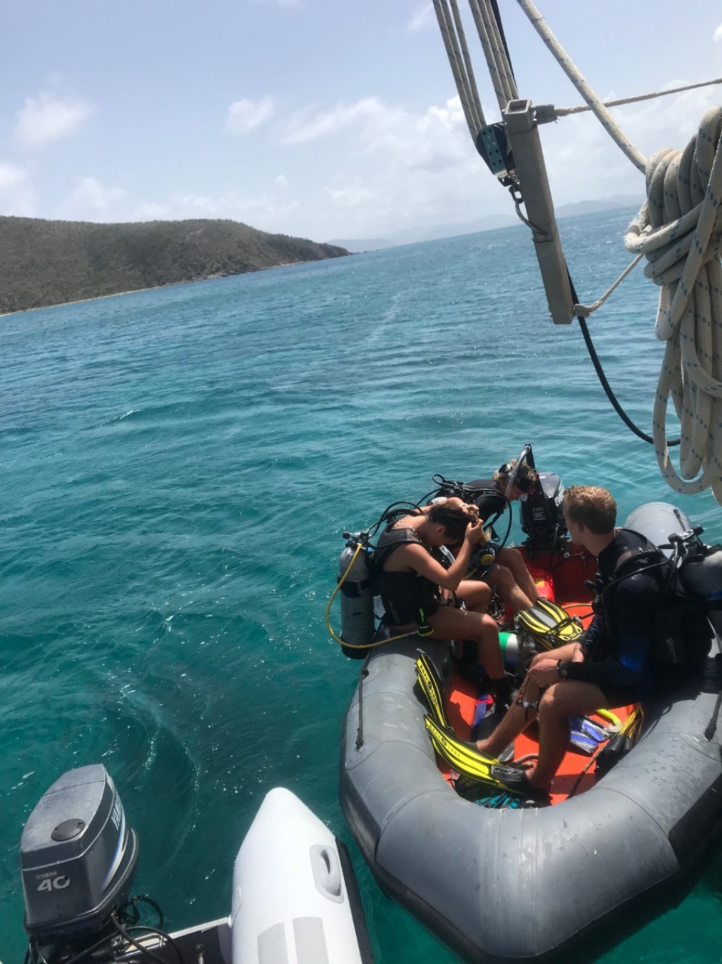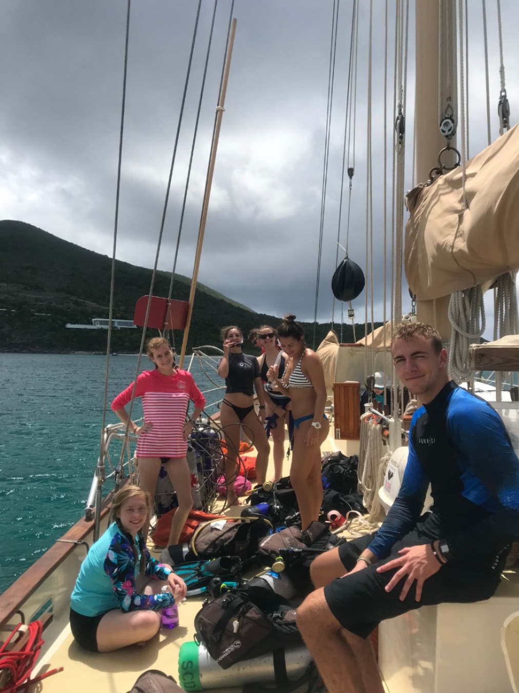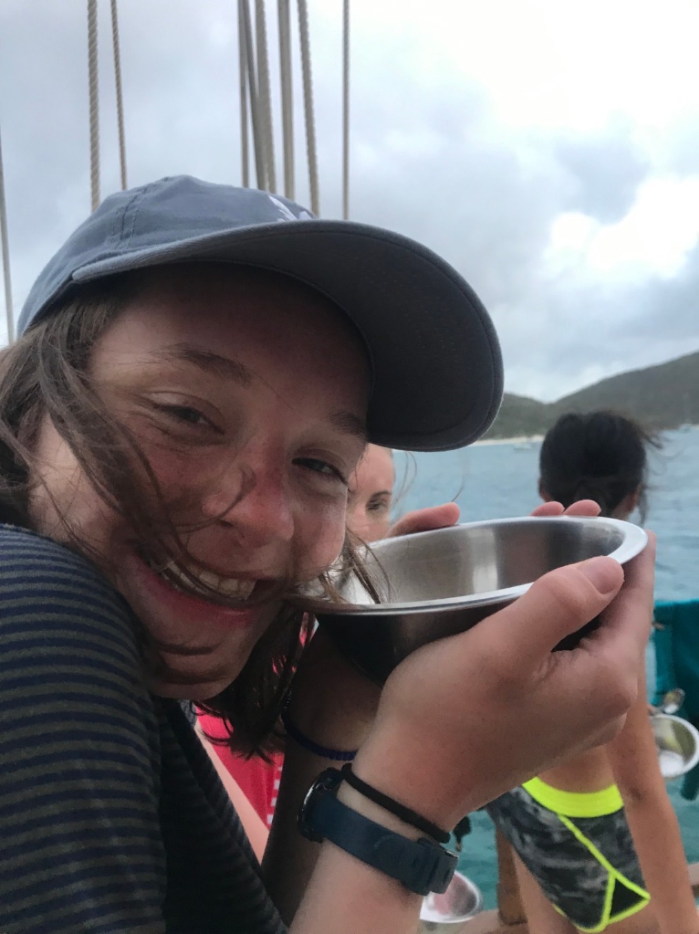 Today was a day of many firsts for the majority of our crew. Many of us started with our very first late night or early morning anchor watch, which meant that the boat was solely our responsibility for one hour. Then we woke up to a delightful bowl of oatmeal (yum) and cereal and began our introduction to the exciting scuba experience. Most of us had our first breath of air underwater today, and the pros went on a refresher dive, touching up on their dive skills. There were a lot of emotions when scuba diving, but the teamwork and effort paid off in the end. We went through all the possible risks and skills that come with scuba diving, and in the end, felt like pros. We ended the strenuous but rewarding day with a quick soapy “shower” in the ocean and then ate some delicious curry to end the night.