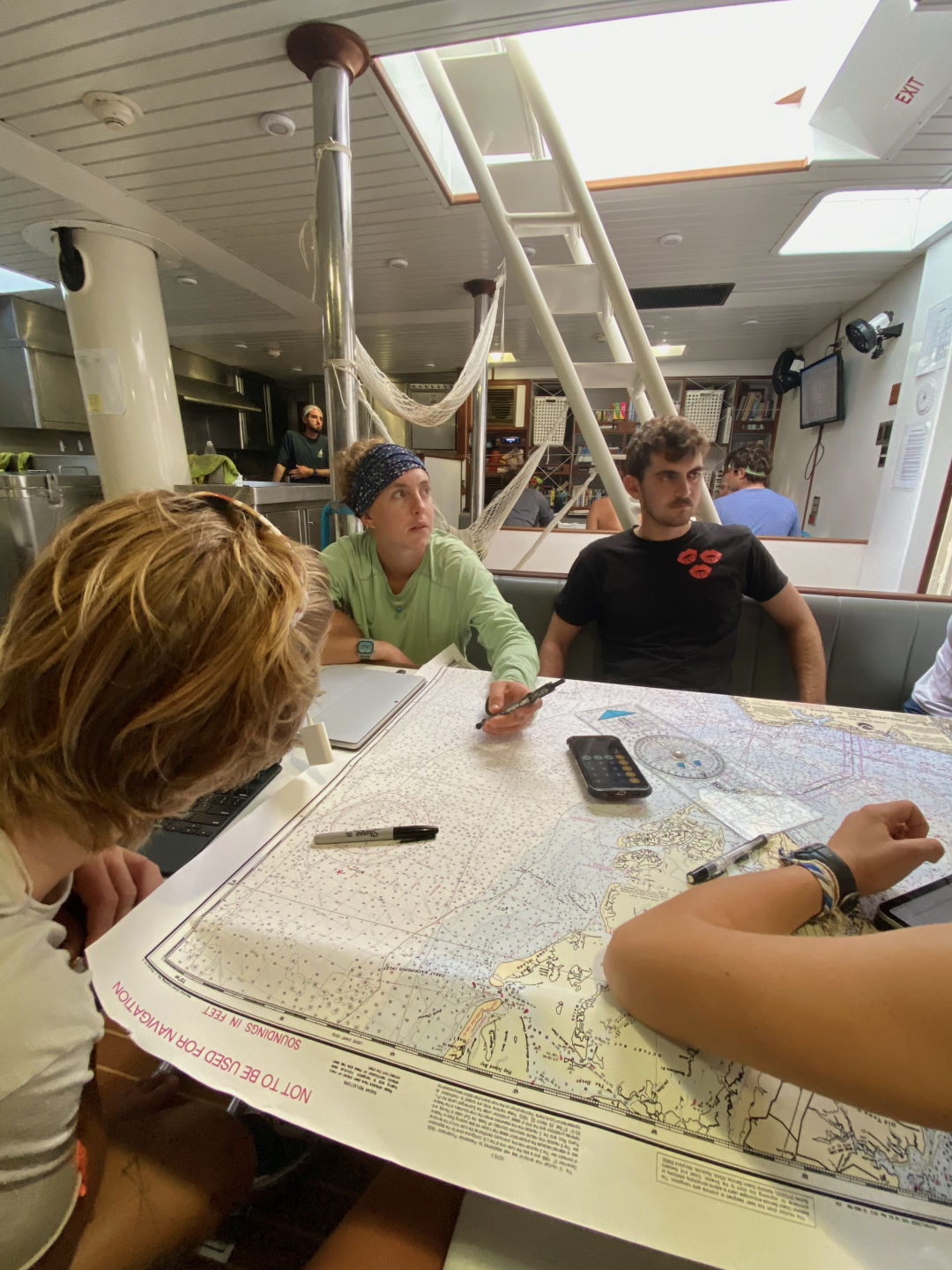 Lunch was followed by two classes, oceanography and seamanship. We learned the final lesson of our Nav Master course, and Gabe taught us our 7th knot of the voyage. Nerves are high in this regard as our Knot Exam is in two days. Hopefully, we remember each knot and their funky names: shout out Alpine Butterfly and Clove Hitch. After class, me, Celia, and Cate made an enormous batch of brownies in celebration of Gabe. We rewarded ourselves and our laborious baking experience with spoonfuls of raw batter:)