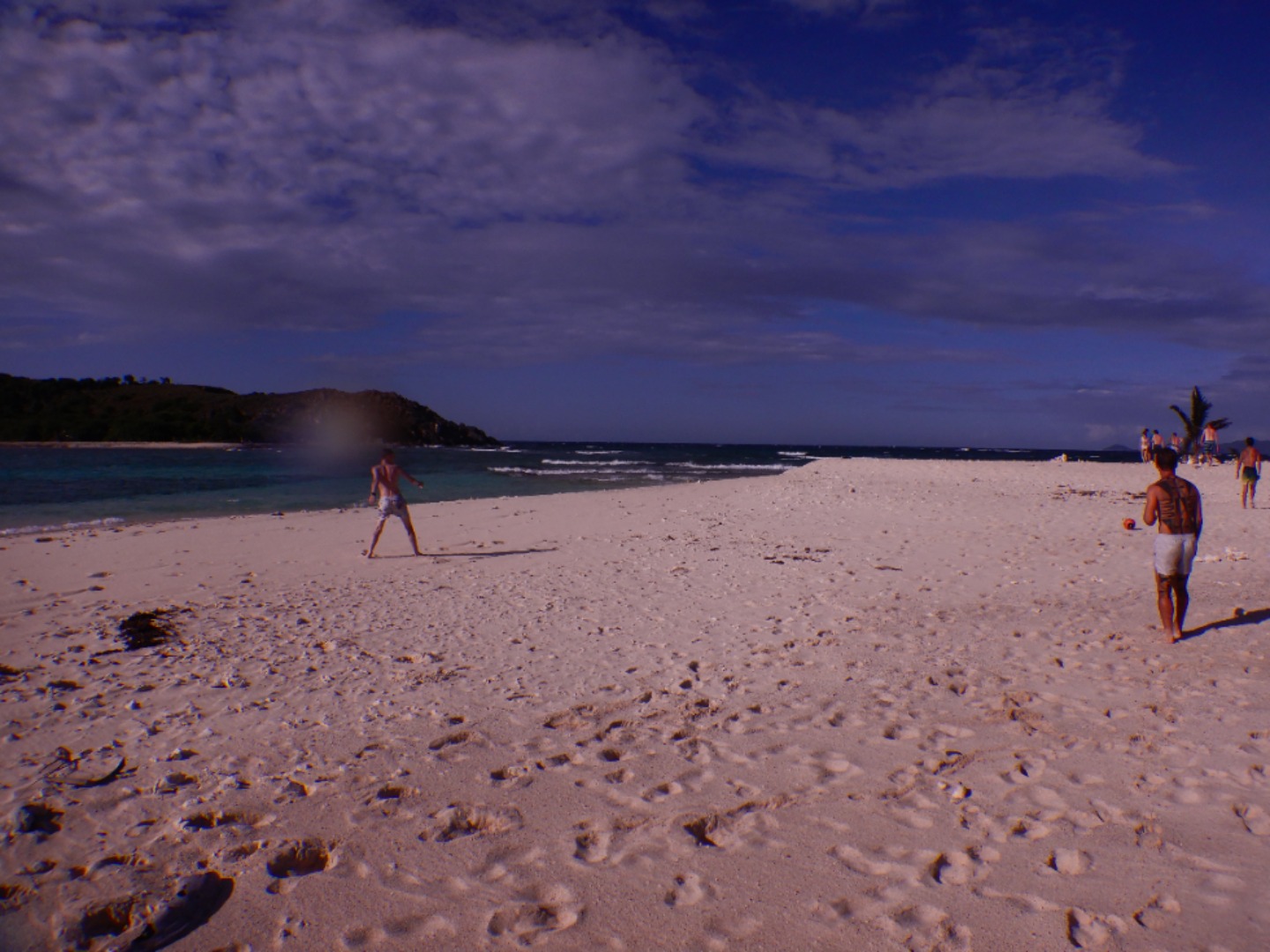 2 pictures of Sandy Spit – Ben and Capt Tom throwing the ball!