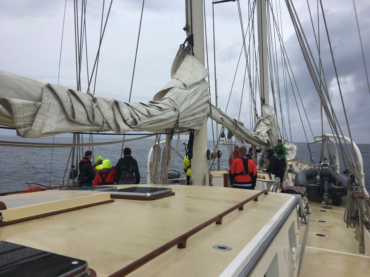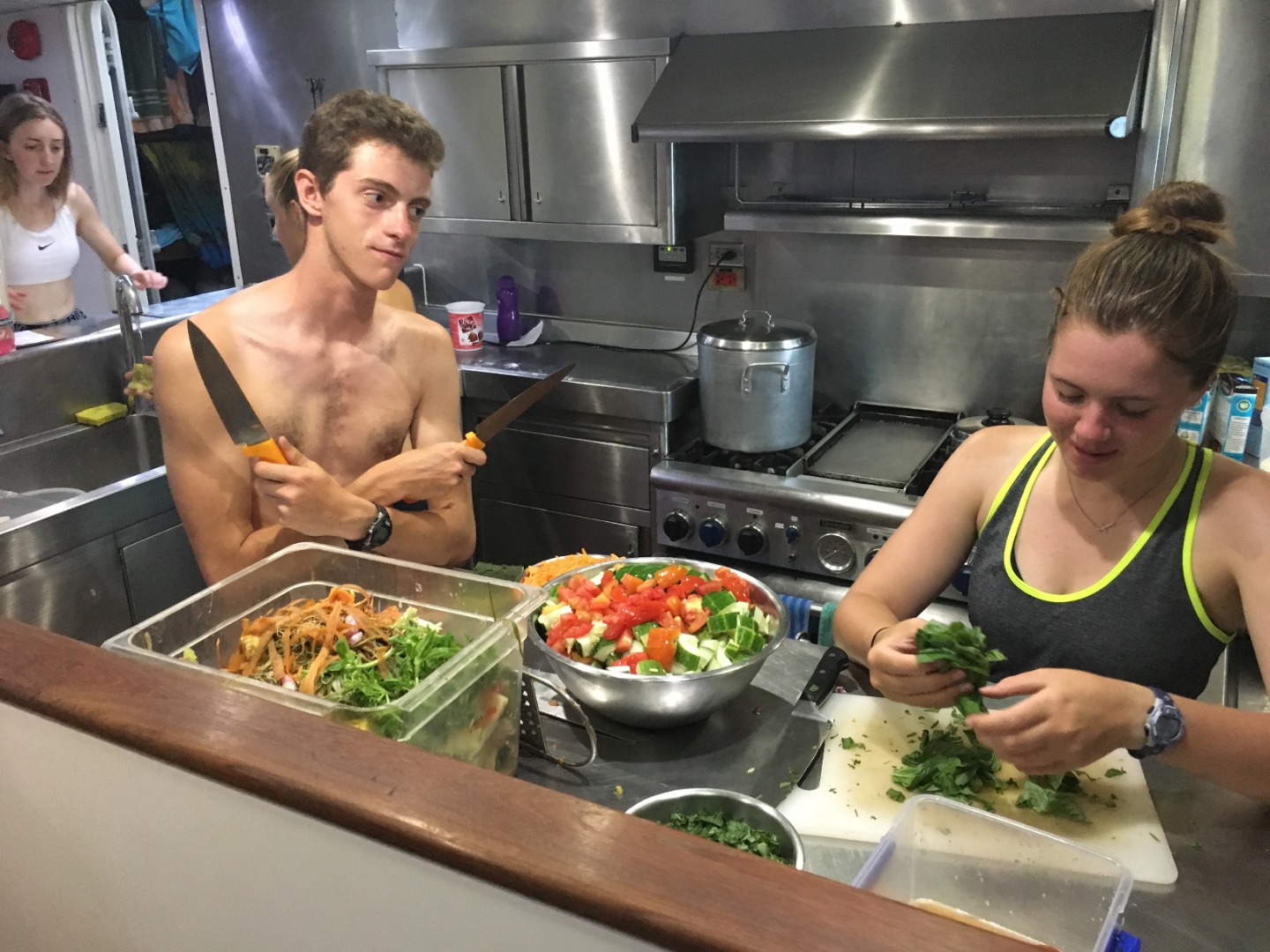 Passage prep was interrupted by customs officials who cleared us out of Bali, but the whole crew worked hard to make sure we were ready to leave by mid-afternoon. Our first rain shower on board gave everyone a chance to break out their foul-weather gear and move lunch below deck. After a leadership class, we had free time until dinner, which was definitely appreciated by those of the crew who had been feeling seasick. Lindsay made us an awesome meal of buffalo chicken, veggies, and cheesy rolls. Overall, it was a long day, but a lot of people are excited to be getting back to sailing and the routine of passage life.
