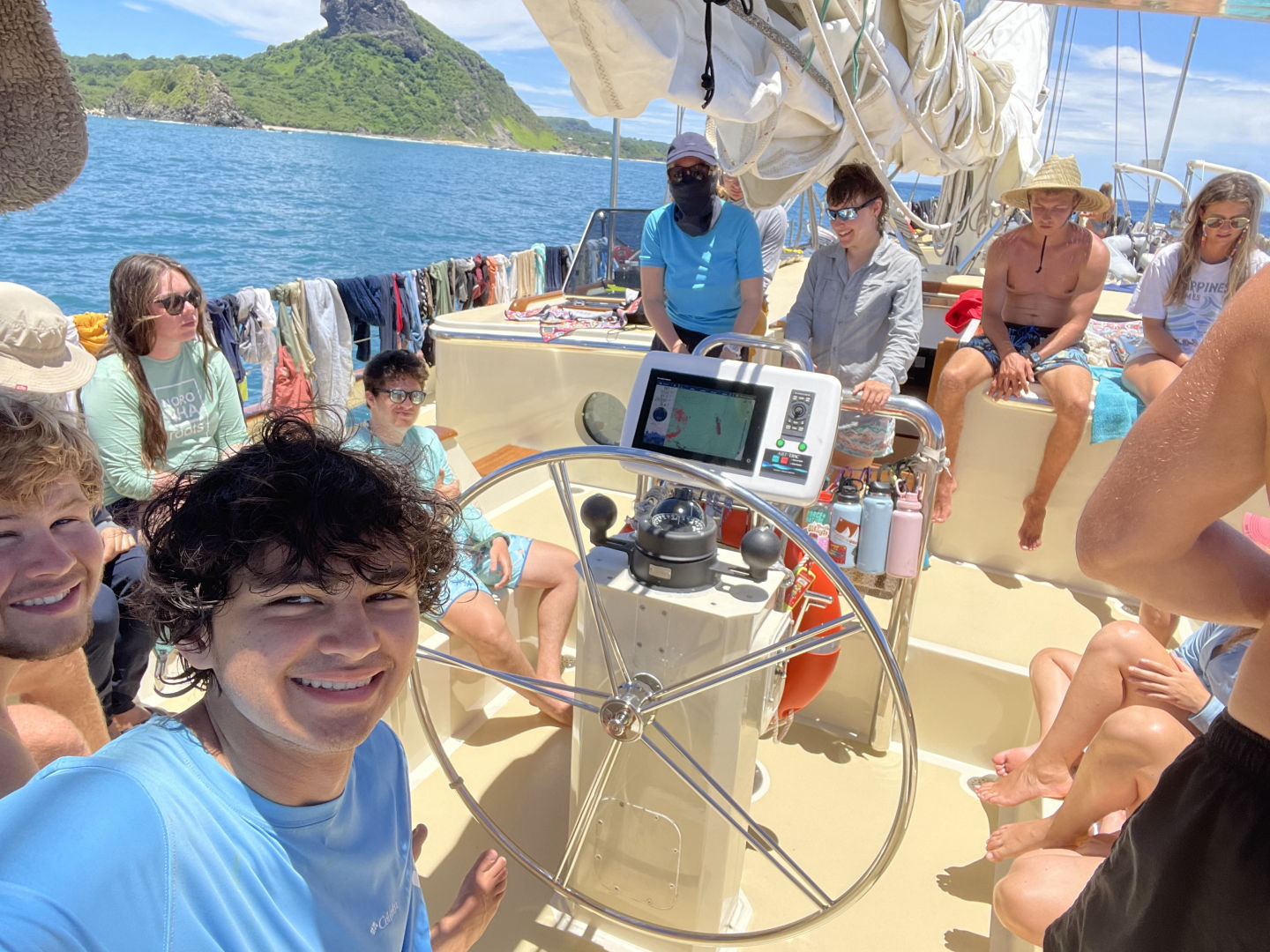 Today started out very rainy again, and students were slow to roll out of their beds when I did wakeups at 7 am, but the promise of freshly made french toast eventually got them moving. We had a cozy breakfast down below in the salon, and it wasn’t long before the rain eased and the sun came out! After breakfast and cleanup, we started on passage prep. It is a long checklist of things that need to be checked, completed, and secured before we can get underway. Today’s passage prep was a little extra intense today, because we had a kedge anchor out behind our stern, and we had to pull in the mile-long (almost) line and bring the large aluminum anchor up into the dinghy to bring it back to Argo. Amanda Shuman and Claire had a great time on that task while I was pitching in with Tim in the galley making lunch. We had SO much guacamole made from local avocados! The fresh fruits and other produce have been a big treat for us. After lunch, we split into our NEW WATCH TEAMS! It’s always bittersweet when this happens, but usually, within a day or two, everyone is loving their new watch team just as much as their old watch team. The new teams are Watch Team 1: Peter, David, Gabe G, Brina, Nat, Will, and Elisabeth; Watch Team 2: MG, Nick, Elene, Beau, Audrey, Gabe D, and Zoe; Watch Team 3: Katie, Ellie, Emma, Max, Nolan, Tim. In our new watch team this afternoon, we went over the station bill, which is what specific tasks to do in the event of an emergency like a fire, man overboard, or abandon ship scenario.