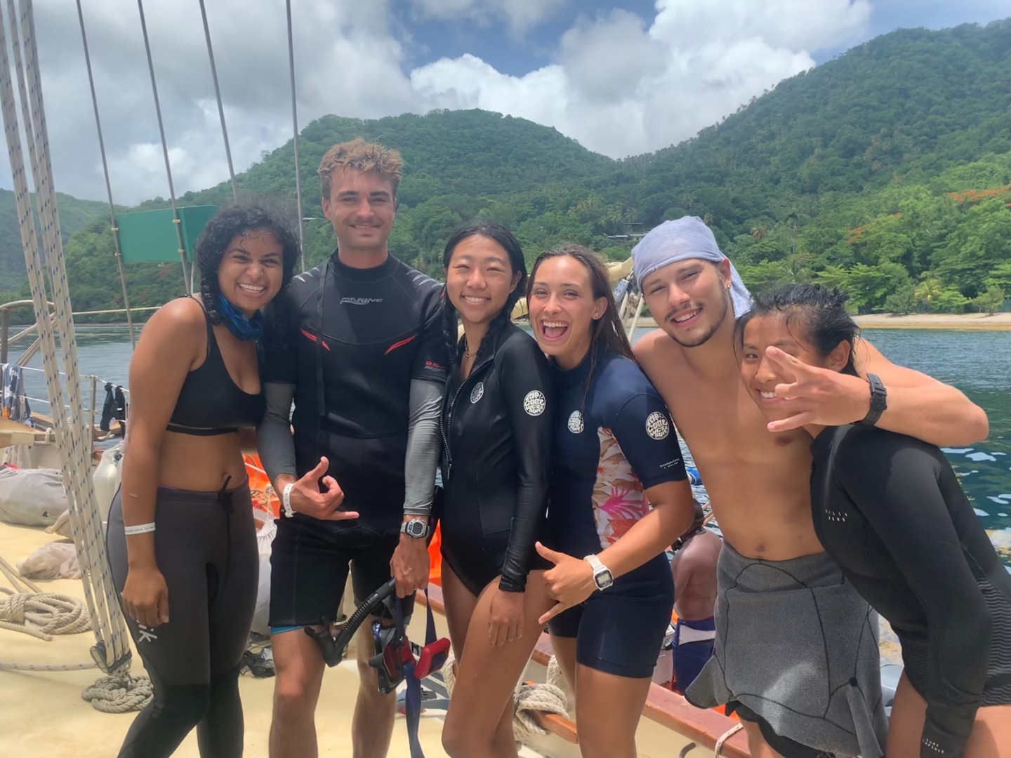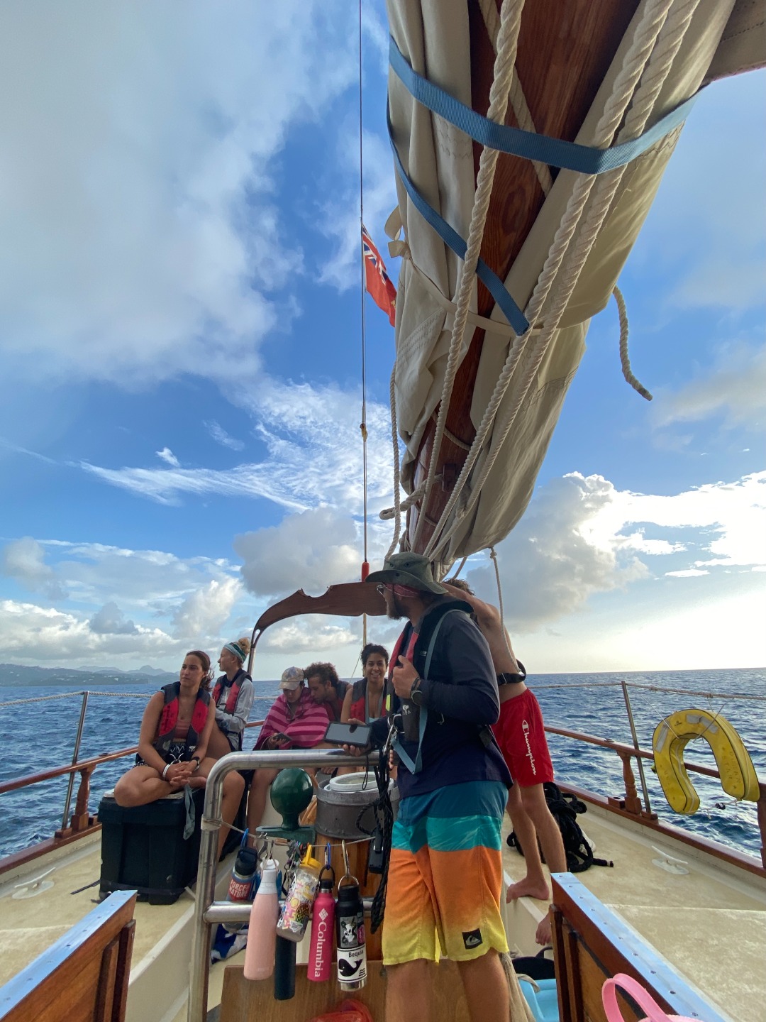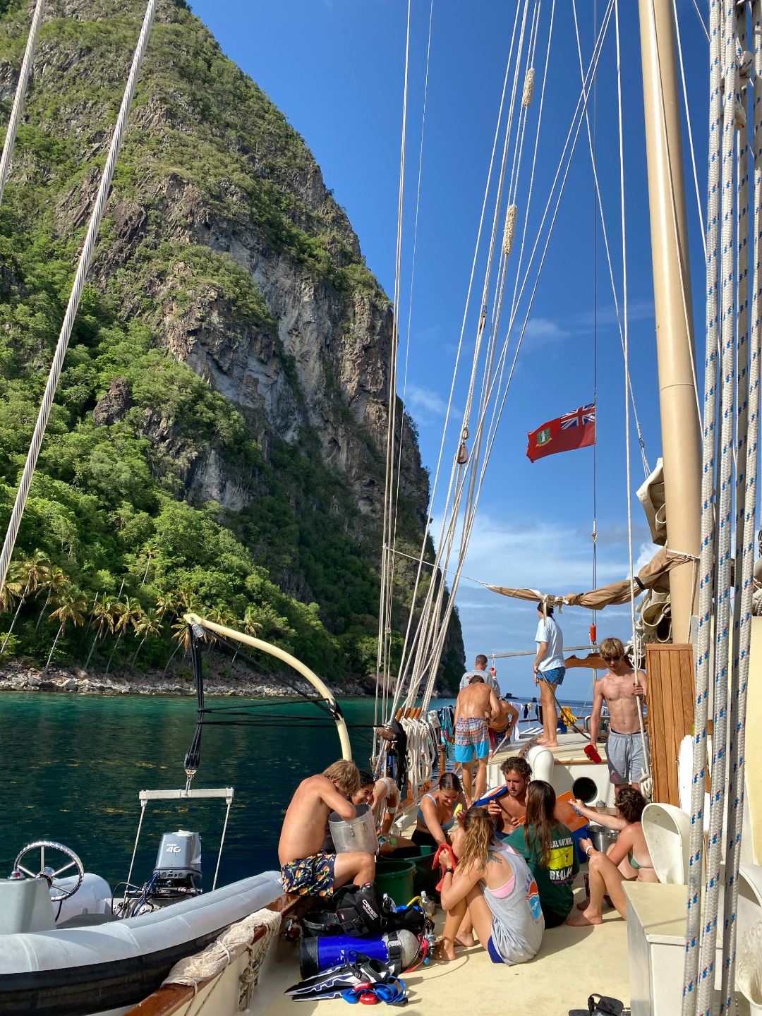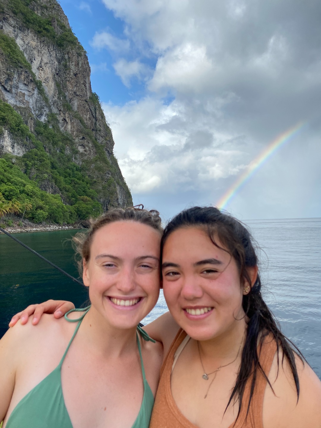 Good morning to our last day at the pitons. Greeted with a rainbow, had an early wake up at 5:30 to have a sunrise snorkel. Eels, lionfish, and squid were spotted as we swam through masses of sargassum. After an oatmeal bar breakfast, we split up into dive teams. Group one did fish id, and group two did deep dive, both at the piton dive site. In group one, Maria was super excited spotting fish, and Joel was persistent in making bubble rings. Thanks to Peter and his crew! After a fantastic lunch med bowl, we sailed over to Rodney Bay. Broke up into watch teams for one-hour shifts and spotted so many rainbows. Docking was a breeze thanks to Jaden and his great dance moves and line catching. Then a burger dinner was served, and afterward, we were able to put the floodlights on without the fear of bugs swarming us. Back to the dock!