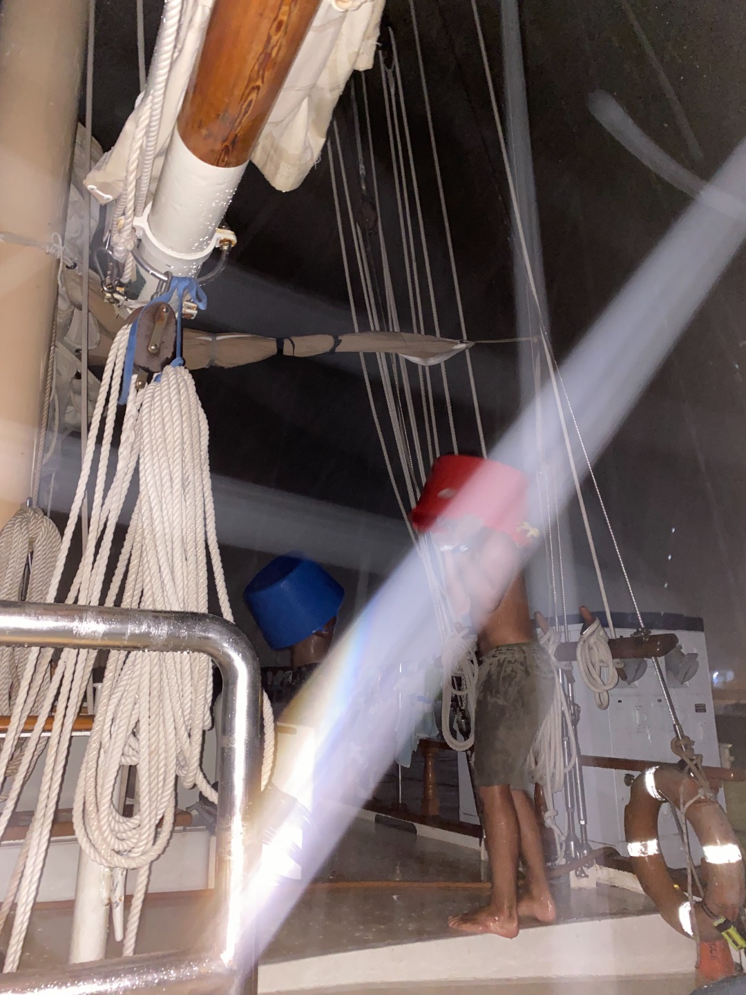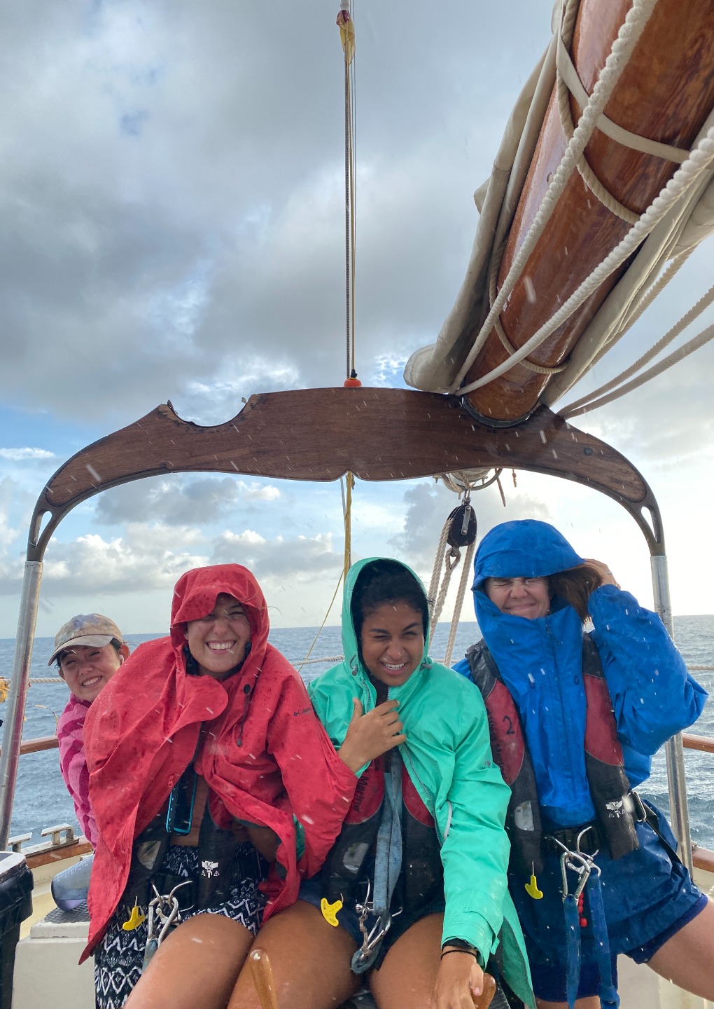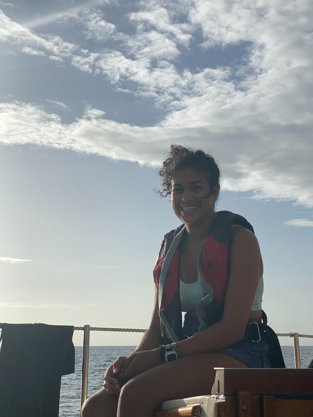 Good morning to our last day at the pitons. Greeted with a rainbow, had an early wake up at 5:30 to have a sunrise snorkel. Eels, lionfish, and squid were spotted as we swam through masses of sargassum. After an oatmeal bar breakfast, we split up into dive teams. Group one did fish id, and group two did deep dive, both at the piton dive site. In group one, Maria was super excited spotting fish, and Joel was persistent in making bubble rings. Thanks to Peter and his crew! After a fantastic lunch med bowl, we sailed over to Rodney Bay. Broke up into watch teams for one-hour shifts and spotted so many rainbows. Docking was a breeze thanks to Jaden and his great dance moves and line catching. Then a burger dinner was served, and afterward, we were able to put the floodlights on without the fear of bugs swarming us. Back to the dock!