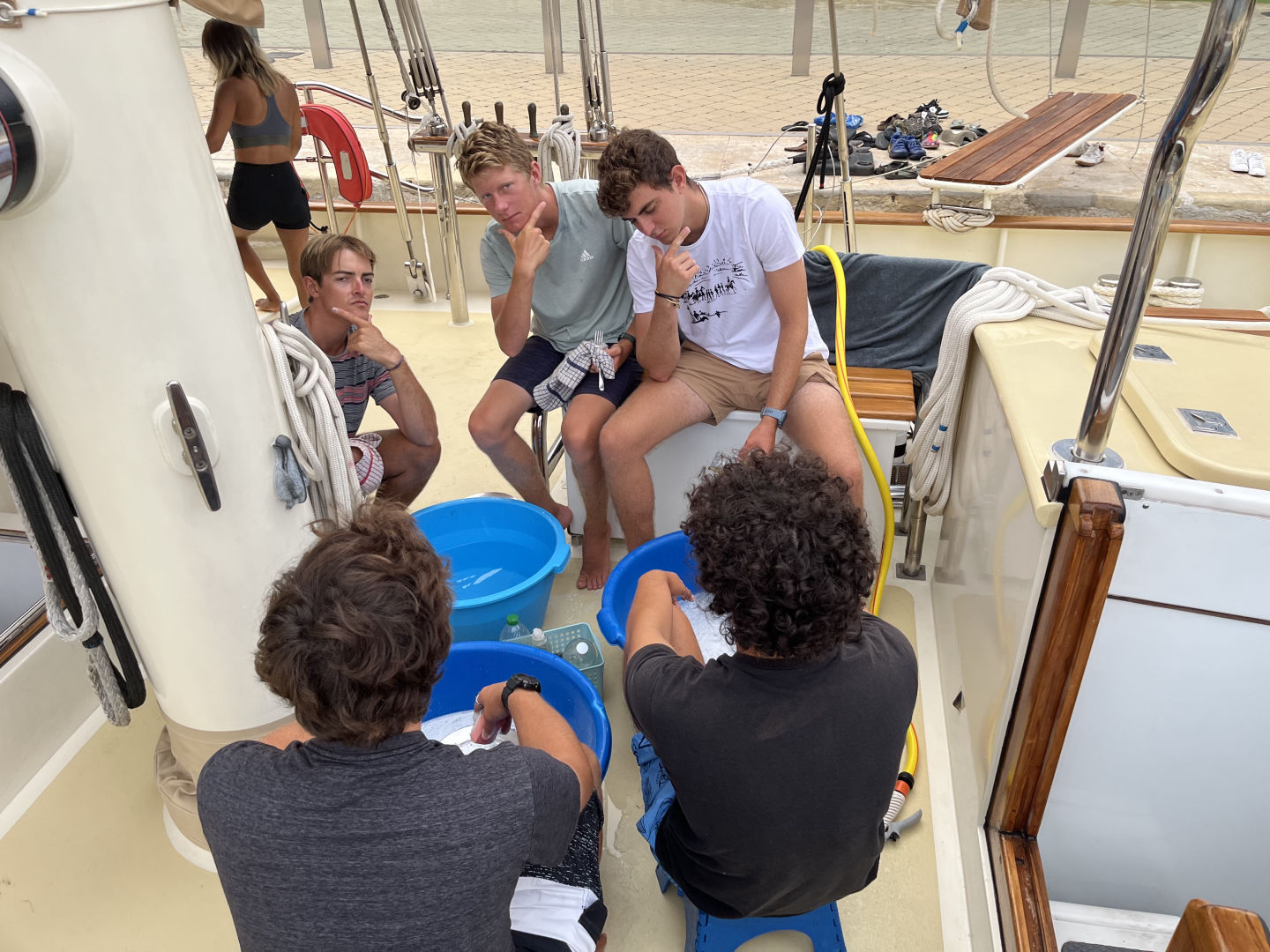 After lunch and lunch clean-up, we took our physical oceanography quiz focussing on currents, waves, and tides and began biological oceanography with a lecture on estuaries and the law of the sea (e.g., which offshore oil deposits belong to which country). Then we were released to have one last hour or two in Tarragona–of which many of us spent doing errands with varying success. At 5 pm on the dot under the scorching Mediterranean sun, the gangplank was raised, dock lines were thrown off, and we sailed back out to the (more or less) open sea. I must say, even though I’ve been land-based for most of my life, there is nothing better than leaving the land and feeling the first rush of a sea breeze on your face. However, it’s not Seamester without a twist, and as we sailed out from the coast, Cedrick, our honorary crew buoy, got too excited and ended up in the water. It was a much-needed practice run of our man-overboard drill, and though it took two attempts to launch our rescue swimmer Phoebe due to some tangles in the lines, our second attempt went quite smoothly, and Cedrick was successfully retrieved. On that somewhat exciting note, Watch Team 3 took the helm, and the rest of the crew dispersed to hang out and catch up on sleepoverall, a long but successful day–also known as a typical day on Argo.