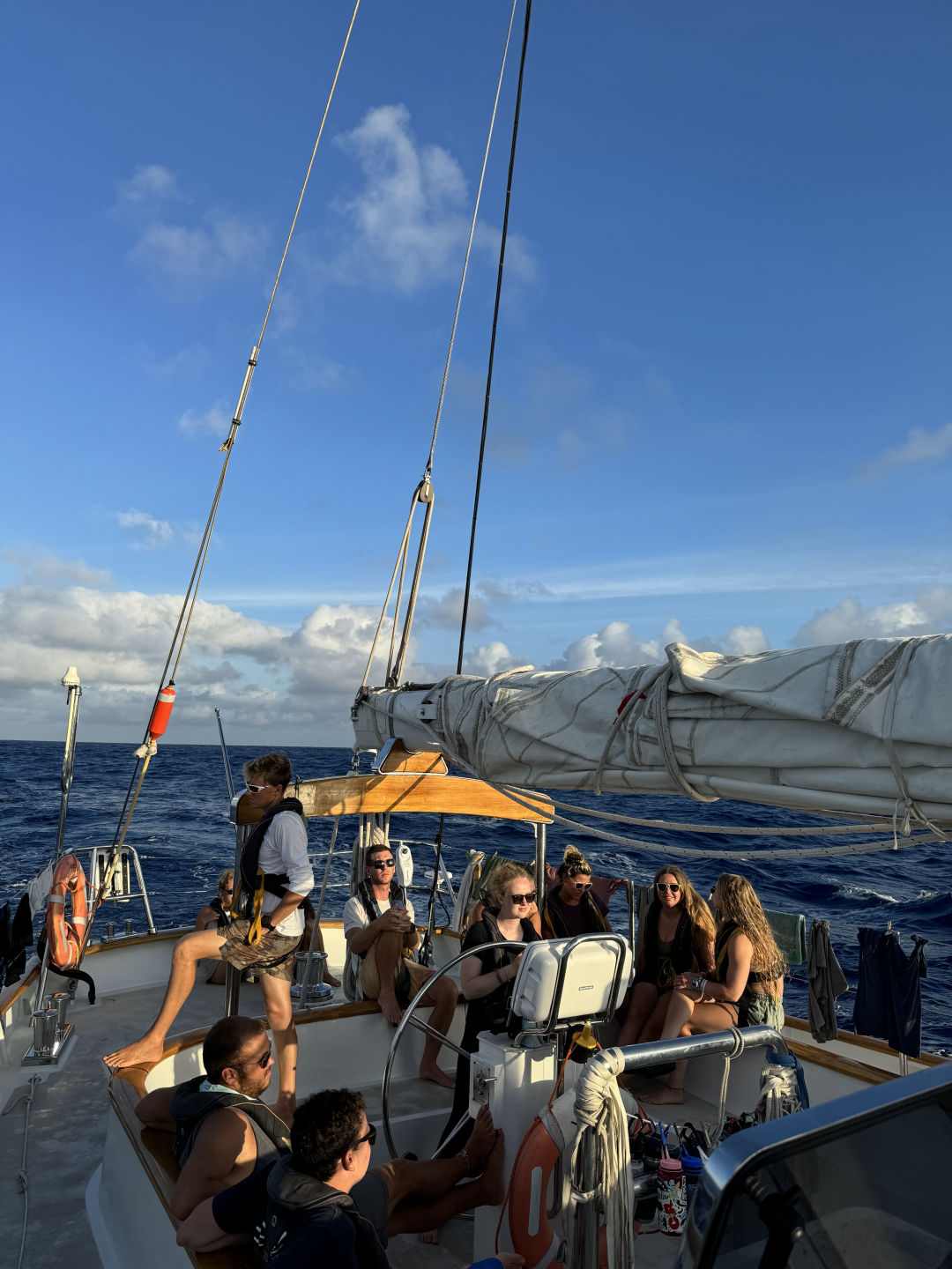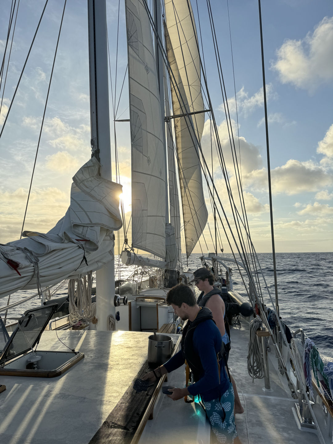 This morning, watch team one was woken up at 7:30 for their eight o’clock watch. Emma, Alva, Laszlo, Christina, Kaden, and I then spent the next four hours sail handling. We had been crawling for the past two days, and Freddie wanted to reconfigure the sails to see if we could squeeze some more juice from the wind. This meant setting up the running backstays to support the main mast, setting up the fisherman’s sail, taking down the fisherman’s sail, tacking the jib, raising the main sail completely, and finally bringing down the main sail when Freddie decided that the motor was turning on. After this, lunch was on all of our minds. Nick, Meg, and Benno cooked up twenty-three cheese toasties, which were paired well with tomato soup. I was nervous going into this meal, thinking that I would still be hungry, but the homemade bread baked by Alva was filling. I can usually handle four to five grilled cheeses with ease, but one was plenty today.