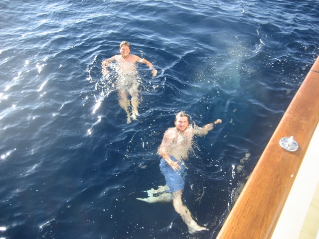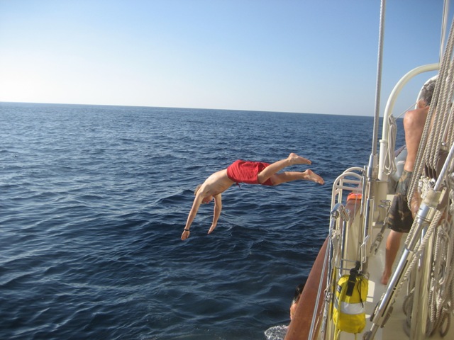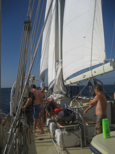 We were up early today at 6 am to leave Agadir. We cast off our dock lines and motored past the many small fishermen out in the bay at sunrise. Today was an important day for the crew; we switched up the watch teams and began the watch rotation with our new team members. After lunch, we had an MTE class and an OCE class. The Atlantic has been extremely calm today, like a lake, for most of the morning. It was a great time to sit out on the bowsprit, enjoying the company of our new watch team members. Following the lunchtime activities, we had a man-over-board drill. We practiced a different technique to last time when we launched the rescue dinghy today. We practiced the figure-8 maneuver under sail and sent in a rescue swimmer for the final grab. Phil volunteered for the task of rescue swimmer. We tied a line to him and kitted him out in a life vest before he dived in to rescue our large orange buoy! As the boat was moved, it was then a perfect time for a shower in the Atlantic. The water has been about 62 degrees for the past few days along the coast of Morocco, possibly due to local upwelling. Today, as we motored offshore, it jumped back up to our usual 70 degrees, making shower time pretty refreshing. We have just had dinner prepared by Bret and his team, and the watch teams will continue into the night.
