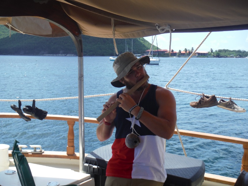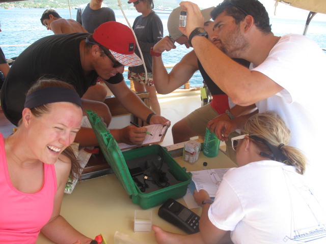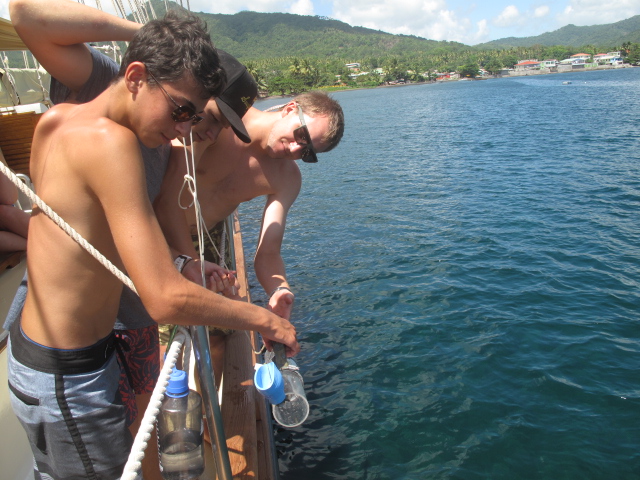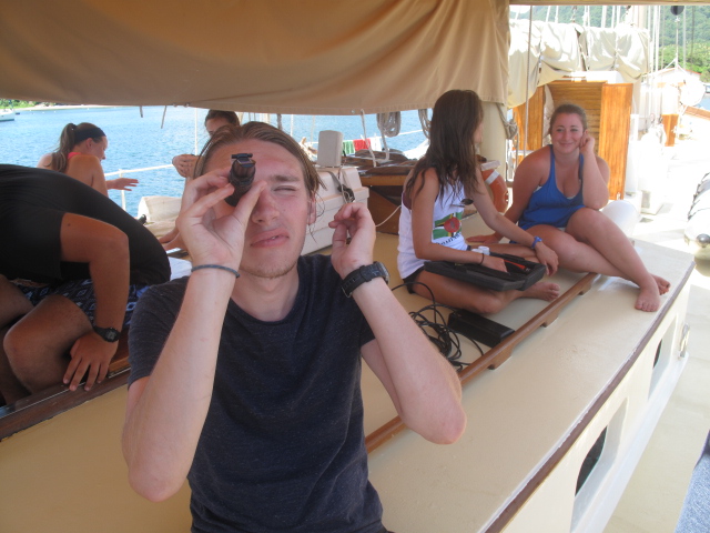 Today, we have officially completed a full cycle of our chore and watch wheel, meaning that I am the last “new” skipper. We woke up today at the usual time of 7 am to our boat already in full swing. While breakfast of some amazing pancakes was being served (of which Jared ate 12 and Penn ate 11), Ocean Star was underway. As we made our way back north to Portsmouth, many of us took the opportunity to rest up and catch up on some homework after the three fun-filled days in Roseau. After anchoring, we had a delicious and nutritious lunch (including our new favorite fruit canips) before having a class on the research instruments we would be using during our lab down the Indian River. We split up into two boats and began paddling upriver, testing the salinity and temperature as we went. Kevin, the coconut, made an appearance and joined us in our lab. One of the high points was seeing the set used in Pirates of the Caribbean: Dead Man’s Chest for Calypso’s house and actually being able to explore it. Following a couple of hours on the river, we headed back for our daily ocean shower and a delicious dinner. I would have to say that the high point was the surprise from our chefs of a tray full of cookies. We had a second oceanography class of the day. Tomorrow brings us to a new place and, of course, a new adventure.