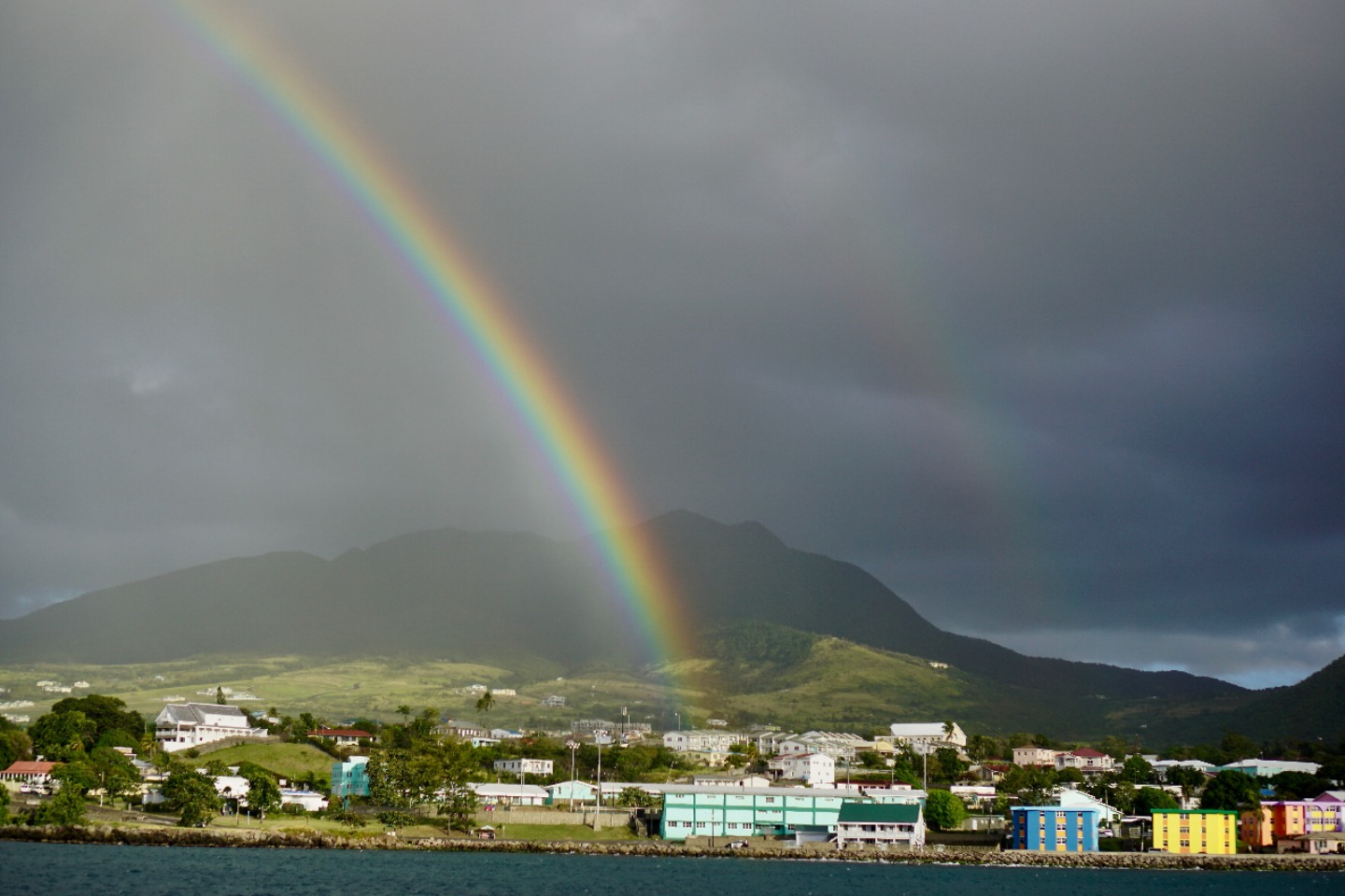 After a windy first night in St. Kitts, we started our morning out with some wake-up reggae. Coming up on deck, we did not find three little birds on our doorstep, but we were greeted with a double rainbow arching over the lush mountains on the shores of St. Kitts. Breakfast was served at 7:30, a nice helping of eggs and home fries put together by Matt and Steve. After a thorough cleanup, we headed down to the salon for our first academic class of the semester.