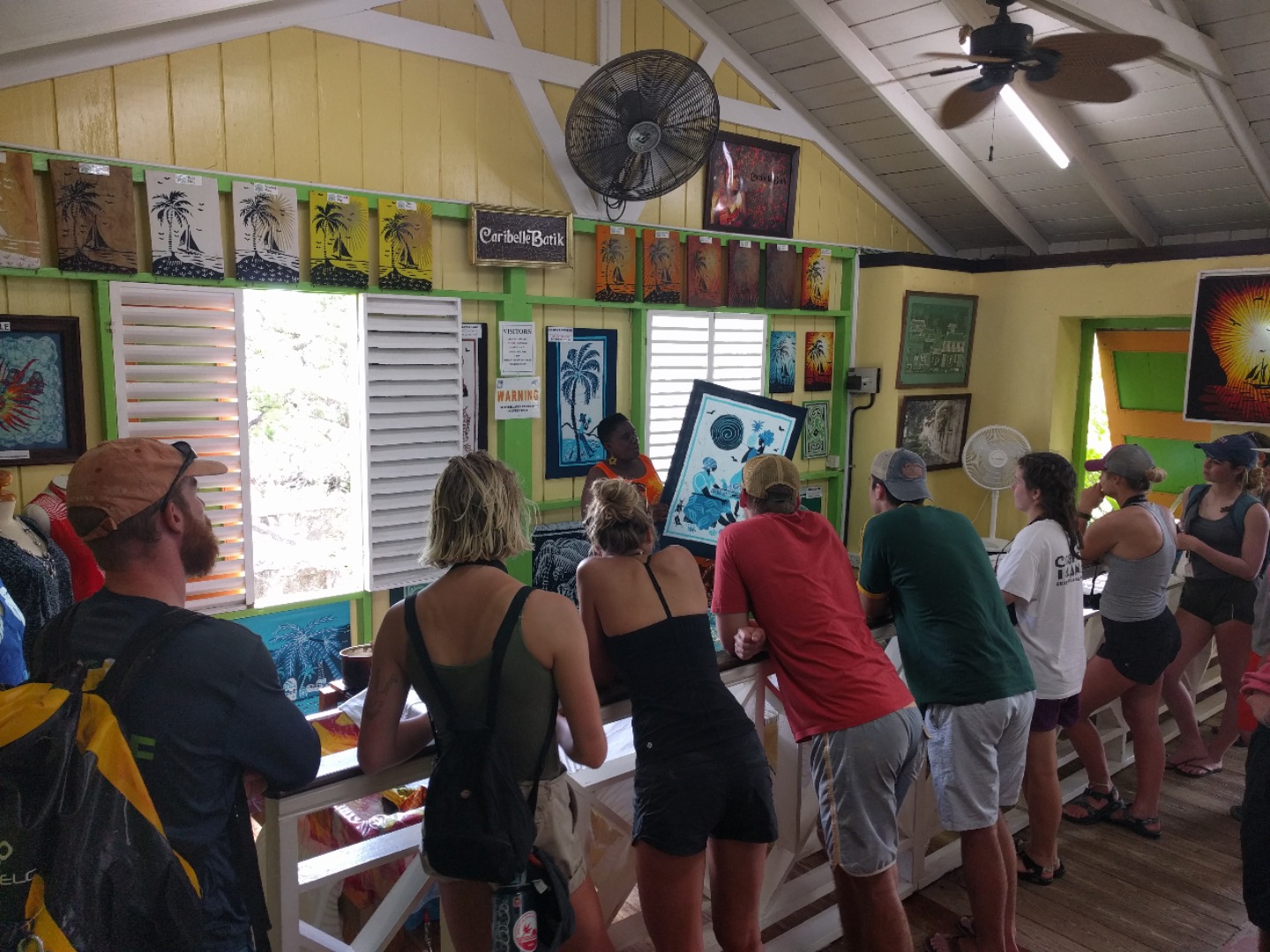 The next stop on the tour was at the Romney Gardens. Here we took in views of the lush vegetation found on the island. Apparently, the site was formerly home to a large slave plantation. There was a bell tower remaining that used to be used on the plantation. It is one of the few bell towers remaining on the island, as many were destroyed when slavery was abolished. We also got to see a batik fabric dying demonstration and learn about the history of batik on the island. Prince Philip visited this museum in the ’90s and received a beautiful batik portrait that he hung in the royal palace back in England.