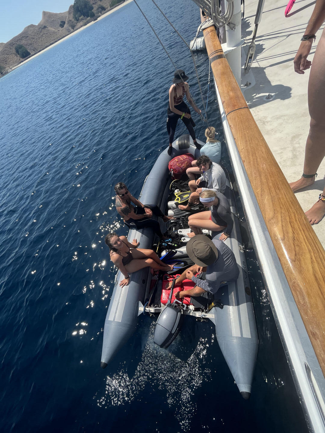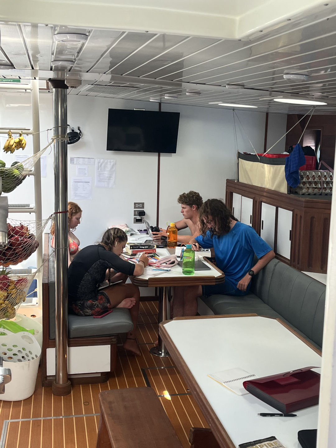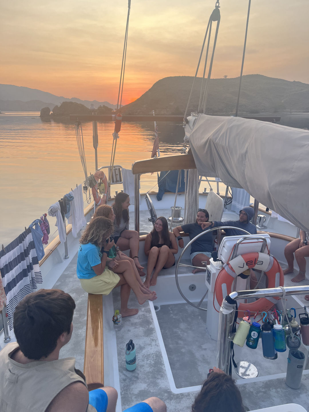 At approximately 6:30 a.m., the bacon set off the fire alarm. We all jumped out of bed like it was Christmas morning. Everyone grabbed their lifevests and emergency bags, and Finn even brought a bag of canned beans! No need to fret about a fire, though. We got an A+ from Captain Tom on our fire drill. After everyone was settled, we enjoyed a view of the morning sun over Lawa Darat, where we had just anchored. It’s so cool to wake up each day, walk up the companionway, and have a completely new landscape. We enjoyed breakfast tacos made with love by Lena. I really liked the fresh avocado in them.