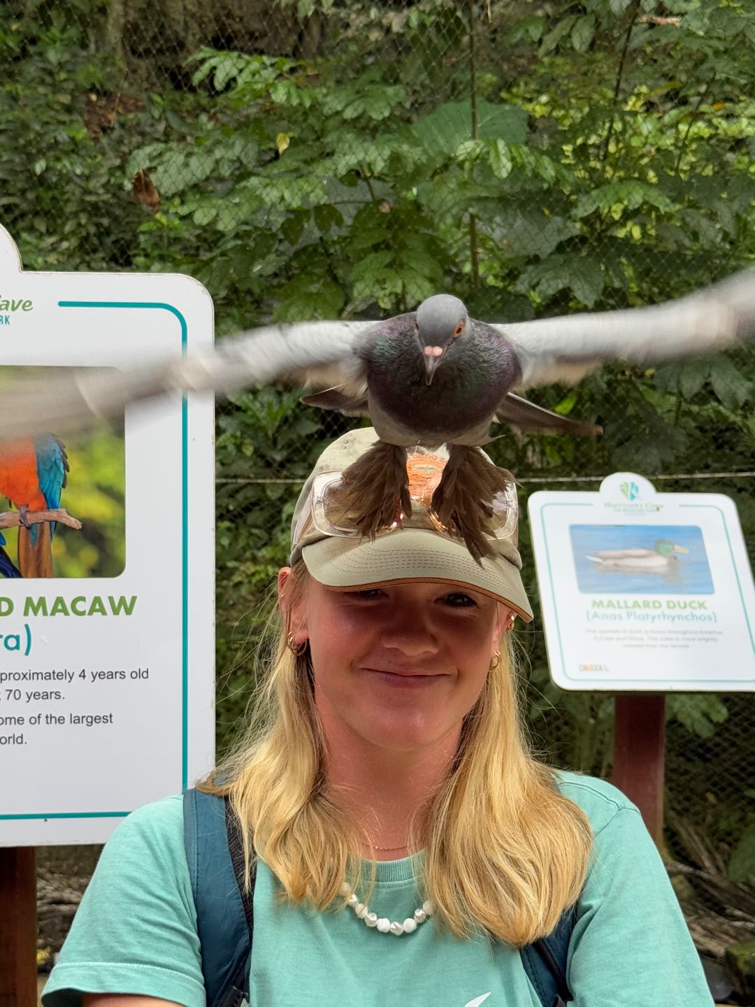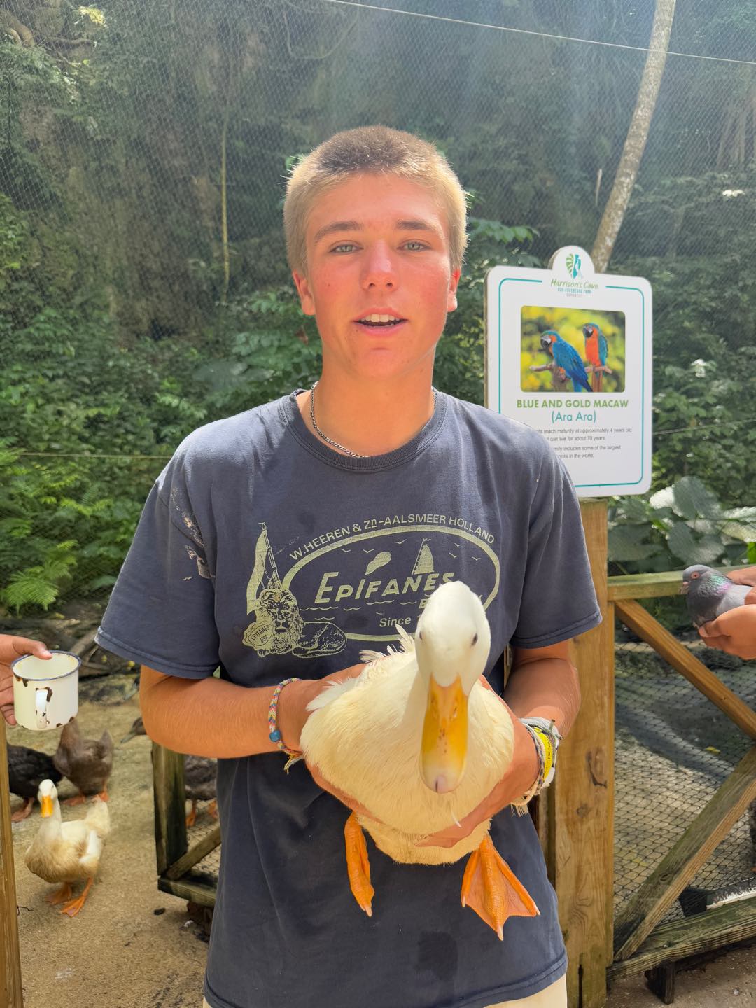 We breached the surface again and got out to visit the bird sanctuary in the gully. It was incredible to see some beautiful tropical birds like macaws and parakeets and have the opportunity to feed a peacock, but the real fun was feeding the ducks, chickens, and pigeons and picking them up; Nini set the record with two pigeons and a duck. We all got some lunch at the lunch shack in the gully, after the quick meal, it was back to Argo for some preparation for new sails! When the students got back, the main staysail was already down and being scavenged by Kackie, Kiki, and I worked on getting the jib down and cutting it apart for scraps, and Shane, Zac, and Maddy took off the forward staysail. Right as we got all the sails off, flaked, and cut them apart, Meg starting sending up her delicious chili with cornbread, she even made some amazing peanut butter chocolate bars for dessert!