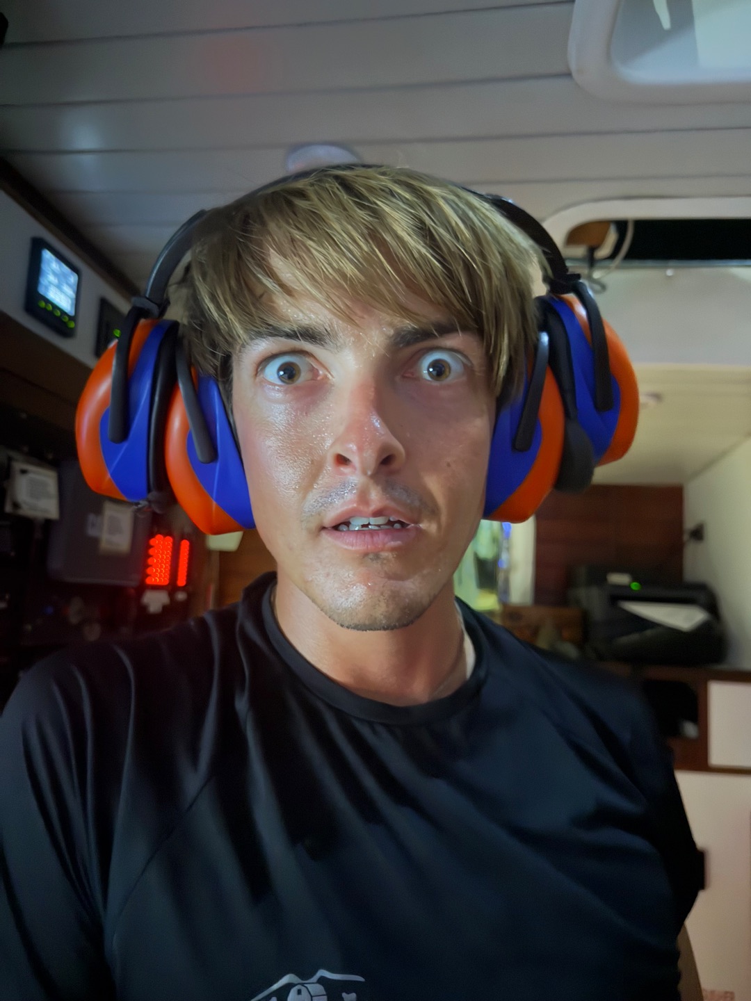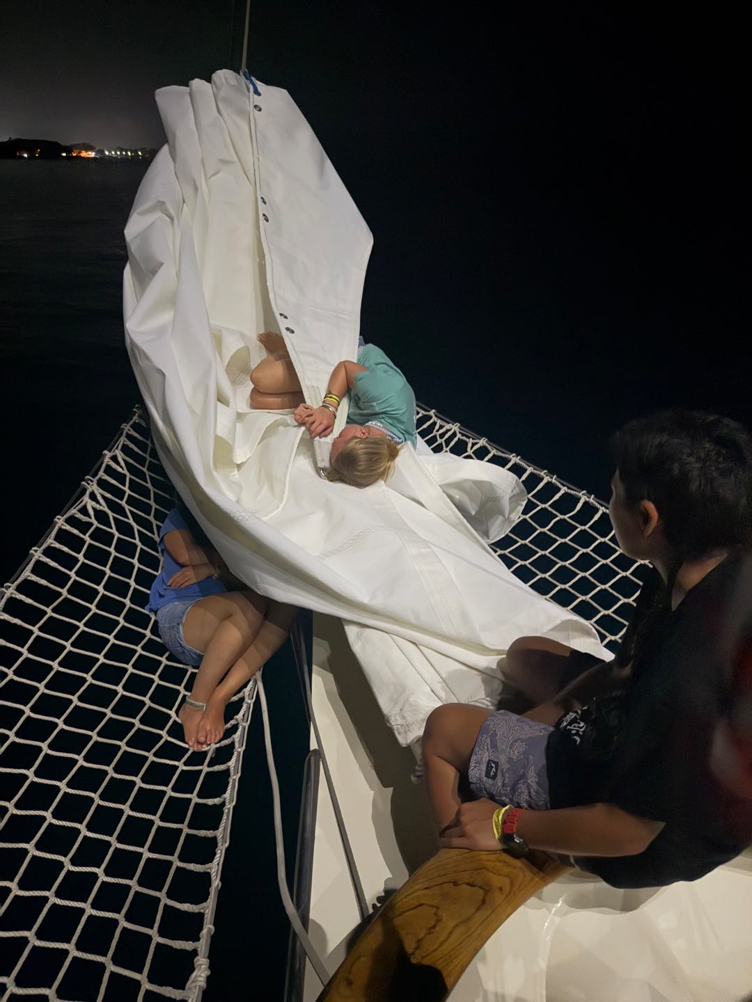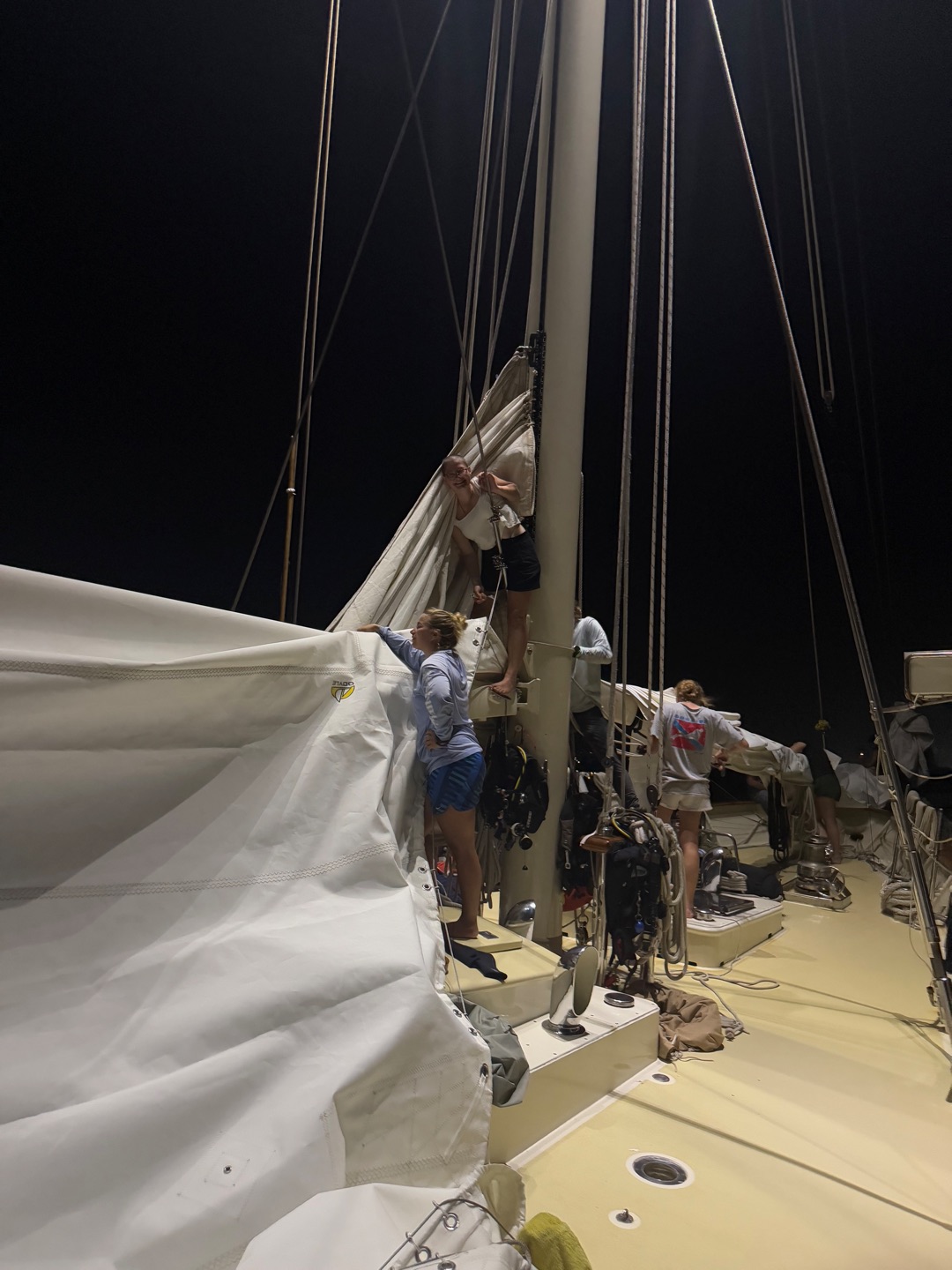 Post-meal and cleanup, our dinghy was sent out with Calum, Nini, and Eli to retrieve our new sails. It returned later with three sail bags and a new face, Skip. Skip is the CEO of Doyle Caribbean (the company that makes our sails) and came aboard to give us some information about our old torn sails and the new shiny ones we were about to put up. He explained the sails are made in Barbados and are some of the highest quality in the world, made from dacron material, and can take over 30,000lb of weight from the wind! For sail change, Darien, Nini, and Sylver worked on putting the jib up, Shane, Zac, Benny, Maddy, Kara, and I worked on the forward staysail, and Kackie, Olympus, Eli, Ben, Cecily, Talia, Kiki, Meg, and Calum got the main staysail on. Following lots of unbagging, mermaid line tying, soft-shackling, and sail covering, the new sails were officially on Argo. After the sail change, everyone washed up and went to bed as soon as they could, all excited for the big day ahead tomorrow!