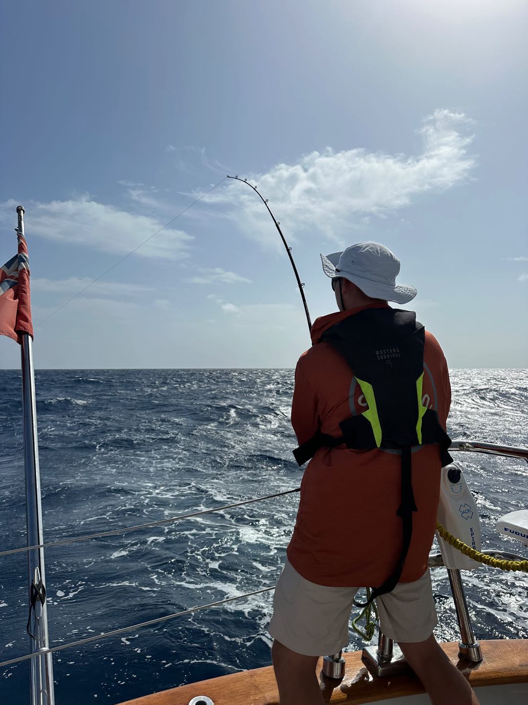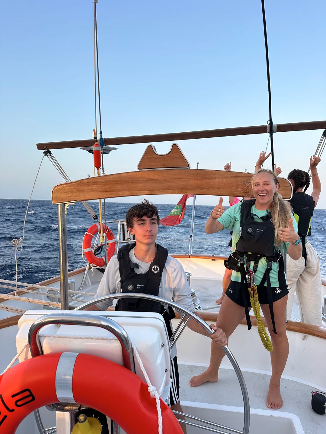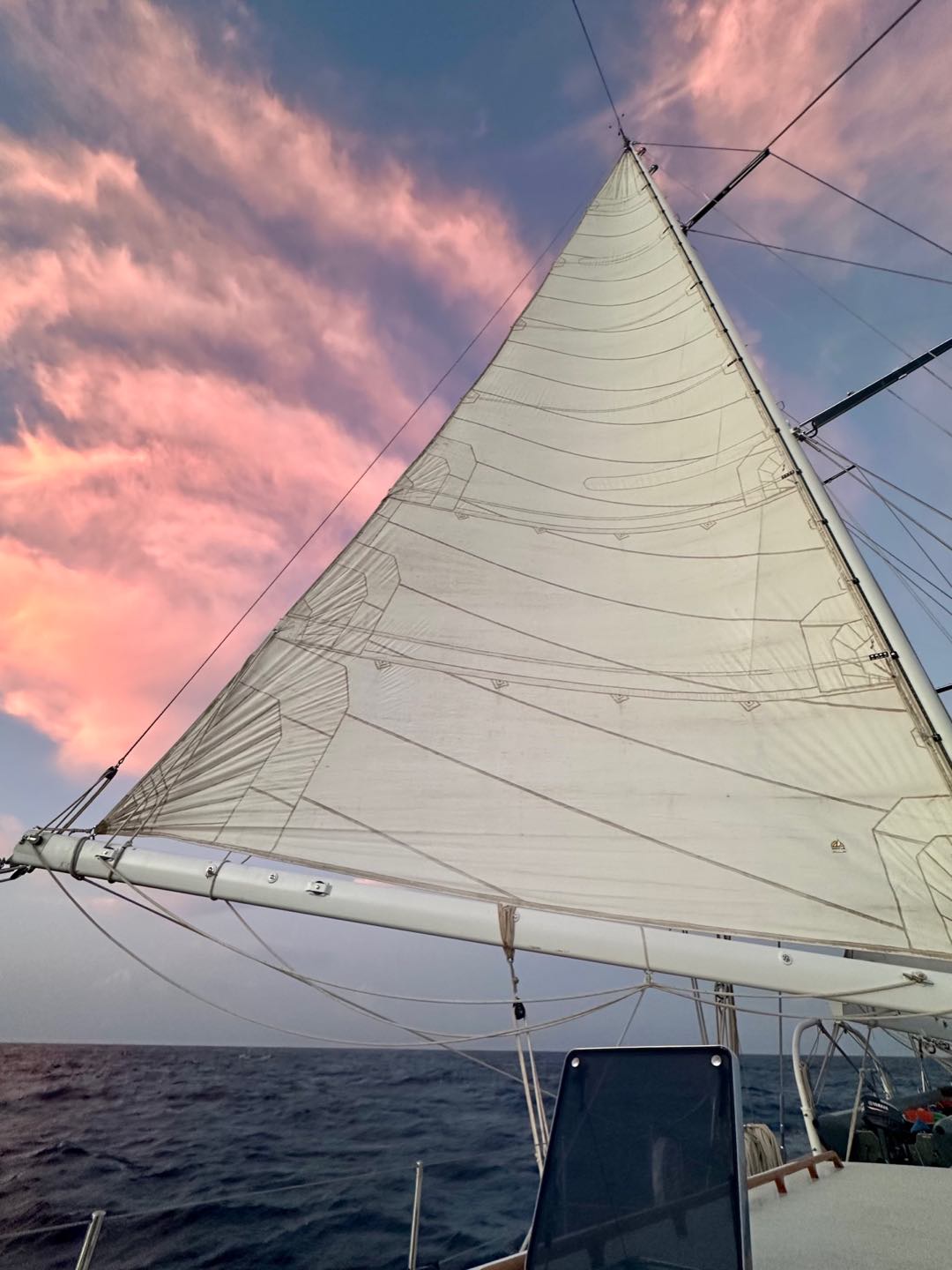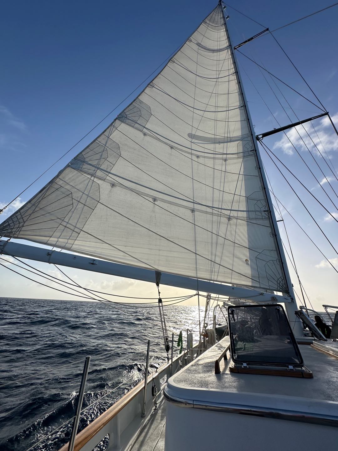 Barreling down toward Bonaire under just the main, forward staysail and jib. The fore staysail and flying jib await repair in Bonaire. In the meantime, the main staysail was reefed and moved forward to be bent onto the forward stay. The reason is that with the full main up and only a jib left up forward, if we were to raise the main staysail as usual, we would be fighting incredible amounts of weather helm with so much sail area aft. With the main staysail up forward tucked behind the jib and the full main aft, we were speedily slipping through the water towards Bonaire. We left with plenty of time from Dominica to add in some bonus sail training. When we were about a day out of Bonaire we practiced heaving to and tacking. Most of us enjoyed the extra bit of sail training while others were trying to wrap their heads around moving away from our destination. The day was capped off by one last tack at midnight before we set our last course for Bonaire to make it to the dock on time. What a day! Until next time.