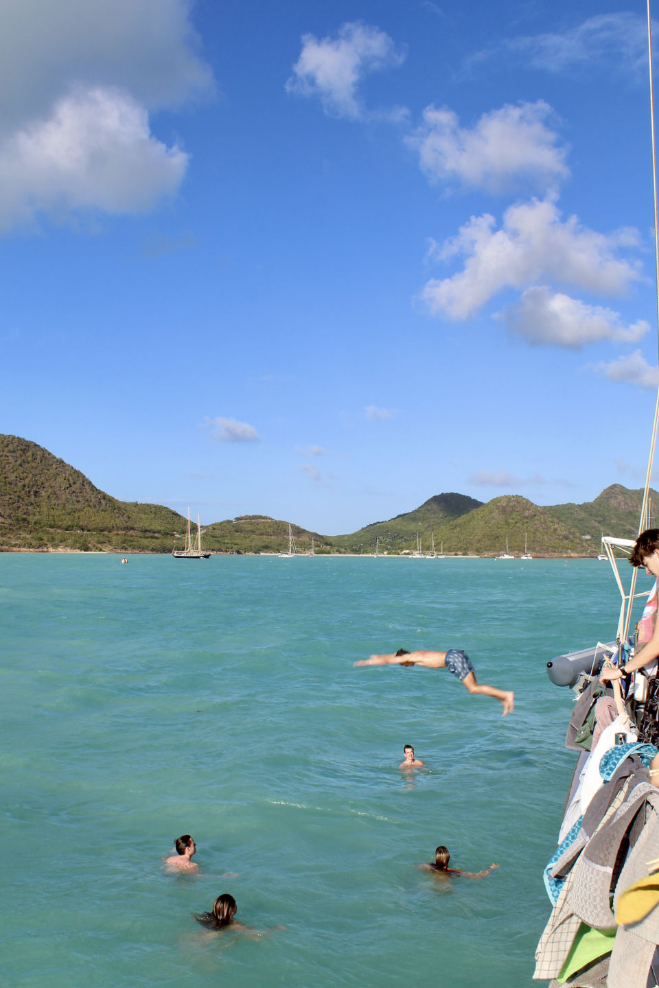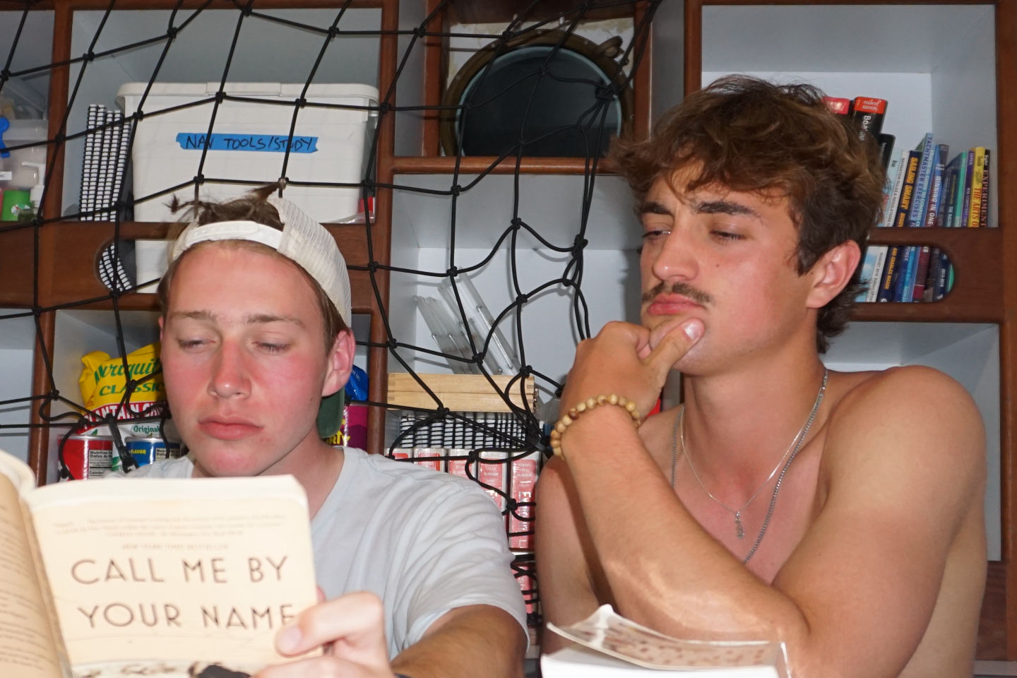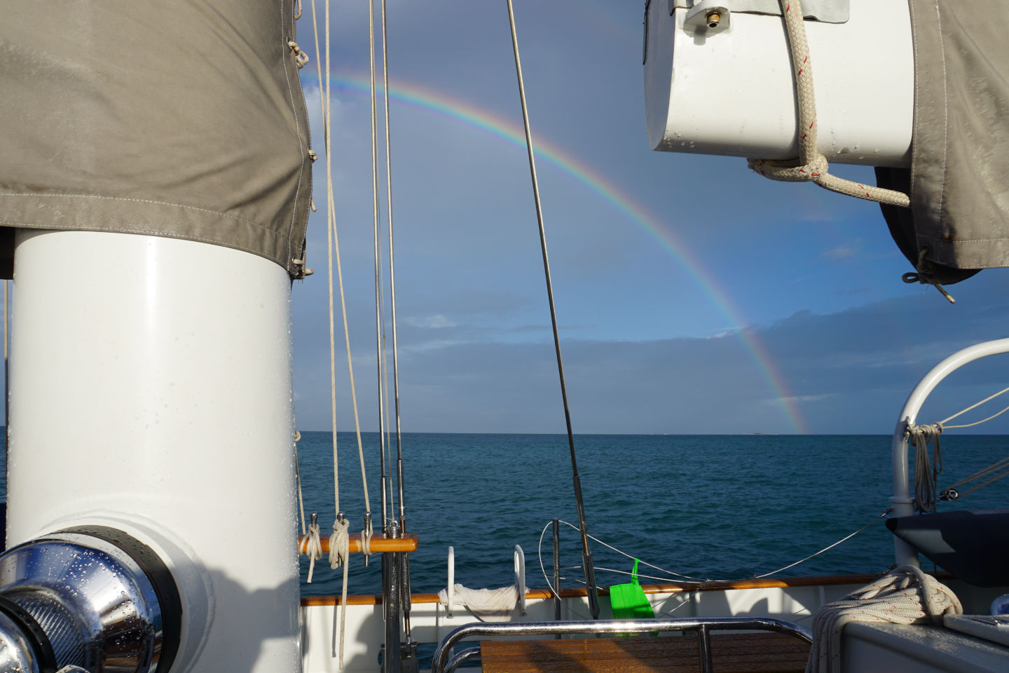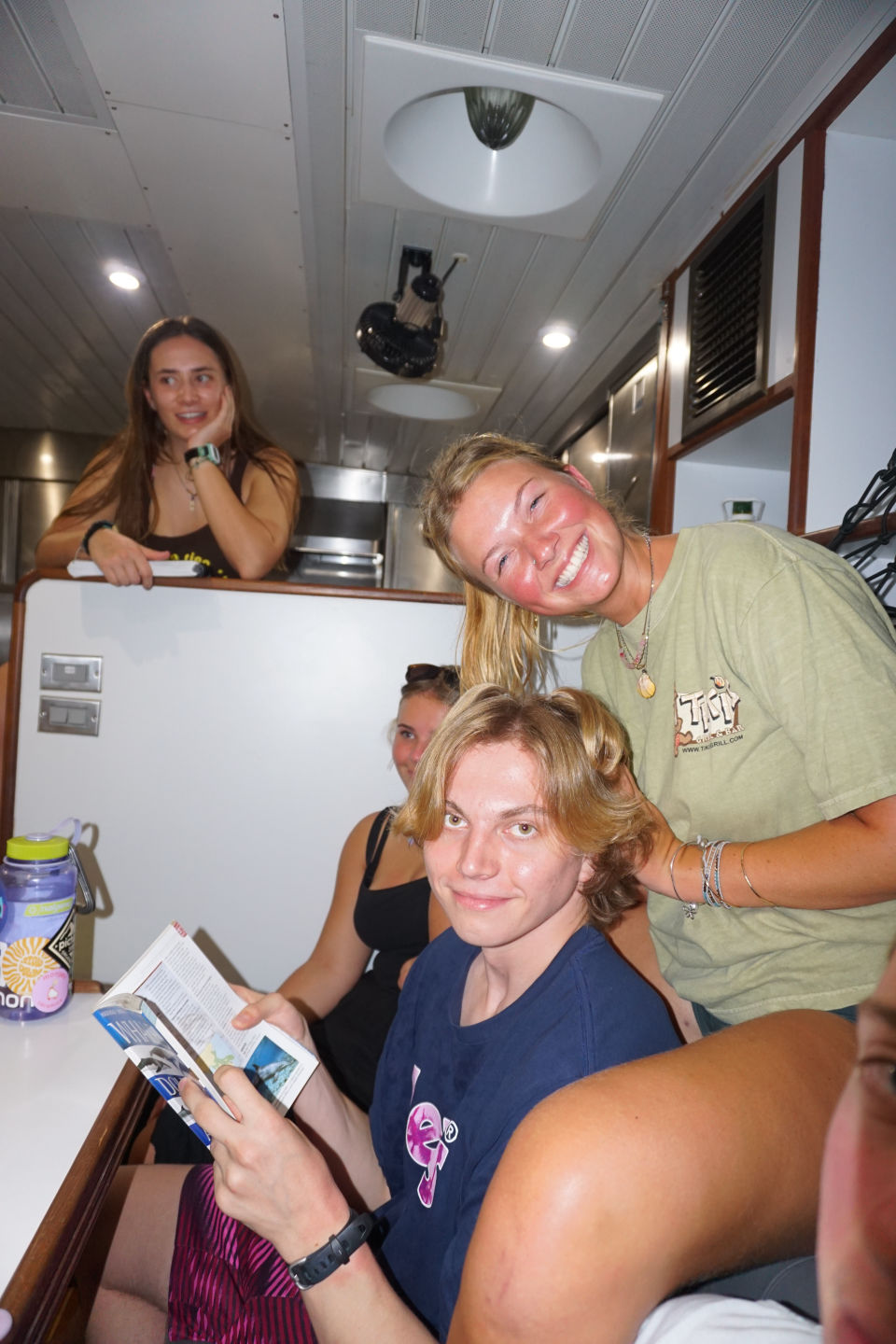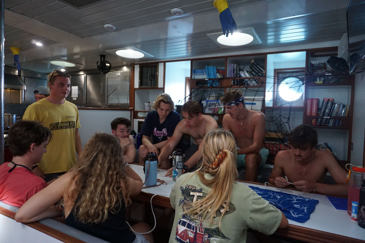 Day 5 on Vela started with delicious bagels, jam, peanut butter, and another beautiful rainbow. I then happily announced the plan for the day, which included diving in the morning for the ones that needed to get certified and confined water practices in the afternoon, but none of this was followed due to bad weather conditions (strong wind and frequent rain). The Crew easily adapted, and we instead had our first Marine Biology lesson this morning, given by Dylan. However, this introduction was soon interrupted when the whole class started crying because Matt was cutting onions for lunch nearby. After this Onion alert, we finished the class and then learned with Allie and Drew how to do knots like real sailors and coiling too. We then got ready for lunch, pumpkin soup with rice. As a skipper, it was my duty to interrupt Fargo’s peaceful nap so that all of us could be there. Our lunch, which, like all meals, takes place on deck, was also interrupted by a sudden pouring rain and strong winds, forcing us to find shelter in the saloon. The plan for the afternoon was also changed so that we could stay dry inside. It began with some free time, during which we all started thinking about the delicious dishes we would be cooking when it was our turn to be chef. Afterward, we had our first sailing class with Drew, who taught us how to read the coordinates (latitude and longitude) and how to calculate distance on a chart (don’t call that a map!!). The weather had greatly improved (although still very windy), so we enjoyed the pre-dinner time jumping off the boat and having fun on deck. I personally decided to be prudent and avoided going into the water as I had mild ear pain last night, which thankfully has fully passed by now. For dinner, we ate pasta with a yummy cheesy sauce. I asked the group the question, “If you had the ability to turn and turn back at will into any sea creature, which one would you want it to be?”. I went for a killer-whale, overall dolphins and seals were the most popular options, while Ted chose to be a Seahorse because these keep the same partner their whole lifetime (awwww); Carla wished she could turn into a crab, and Smash said without any hesitation that she would be a sea cucumber. Finally, after dinner, we did the only thing of the day that was actually planned since the beginning, we had a very important chat with Tom, who gave us our watch team groups for future passages and explained to us how to react in case of an emergency like a fire or a man overboard. All in all, so many things happened today, and we are really excited about what’s to come!