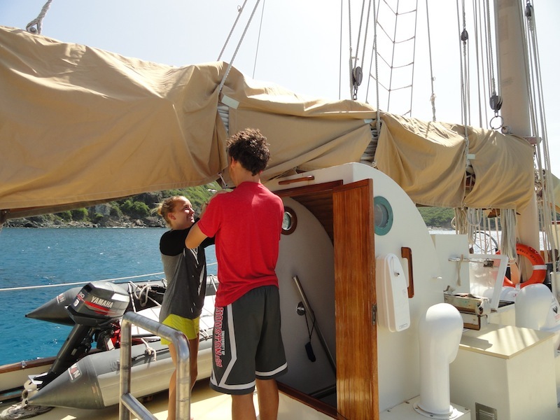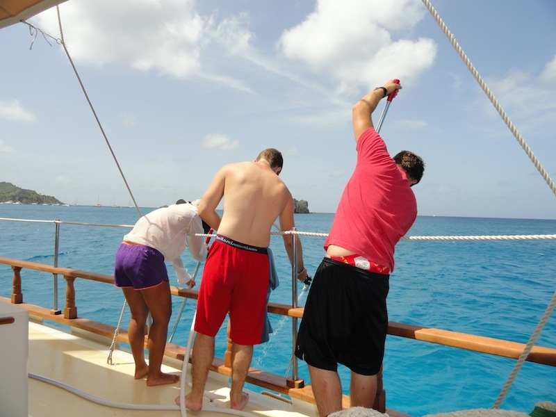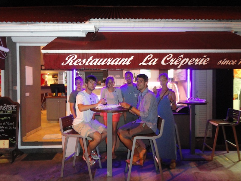 Today was a very successful and eventful day. We arrived in St. Barths a little after sunrise after having great wind and having a great time. After putting down the sails and setting the anchor, we had a much-needed nap until around 8:30, when we awoke and had some breakfast. Kris went off to clear us through customs while the rest of the crew gave Ocean Star the tender love and care she deserved after our voyage up here. Once we cleared customs and moved to the dock, we had lunch, followed by sailing class and shore time. We walked around the beautiful city, but most of the stores were closed in the mid-afternoon. Instead of shopping, we all had a little happy hour consisting of ice-cold sodas and water, a delicacy most of us miss while living aboard Ocean Star. After soaking up the combined French and Caribbean culture, we headed back for a real shower onshore to get ready for our dinner plans. We went to Le Select, the inspiration for Jimmy Buffett’s song, Cheeseburger in Paradise, followed by a delicious crepe at a creperie up the street. All in all, it was a great first day in St. Barths.
