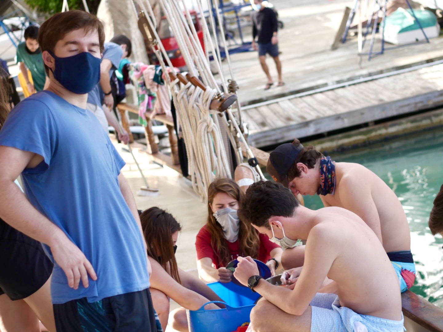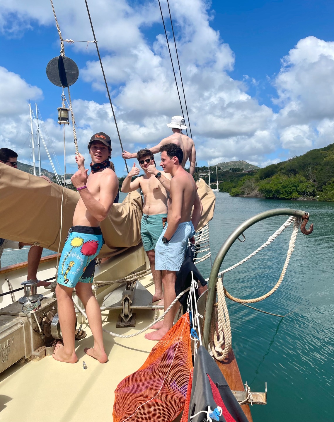 Rather than waking up to the smell of sausage or bacon this morning, the crew was awakened by an apparent DJ battle as the skipper and galley crew fought over which songs were played in the AM. There was a mixture of old country and new age rap flooding the saloon, effectively waking the remaining sleepy sailors but definitely causing some headaches. Chocolate chip pancakes cleared any remaining confusion and caused quite a bit of silence as we stuffed our faces. After breakfast, Brahm filled us in on “Intro to Seamanship” and really started to dive deep on the rigging, attributes, and necessary information on sailing the vessel. Everyone practiced diving today; the certified divers had their check-out dive where a large eagle ray was spotted among the sea turtles. New divers continued training and watching what seemed like hours of PADI dive videos. Dive teams parted ways and got wet as we descended from the dinghies and got a bit more practice in. Everyone was able to complete the necessary exercises with relative ease while enjoying some time with the sea urchins. There was a bit of free time spent up on the bow where many of us soaked up the rays to get that perfect Caribbean tan. Dinner snuck up fast, and we feasted on soft shell tacos courtesy of the galley crew; after clean up, Sam briefed us on our “Oceanography” course.