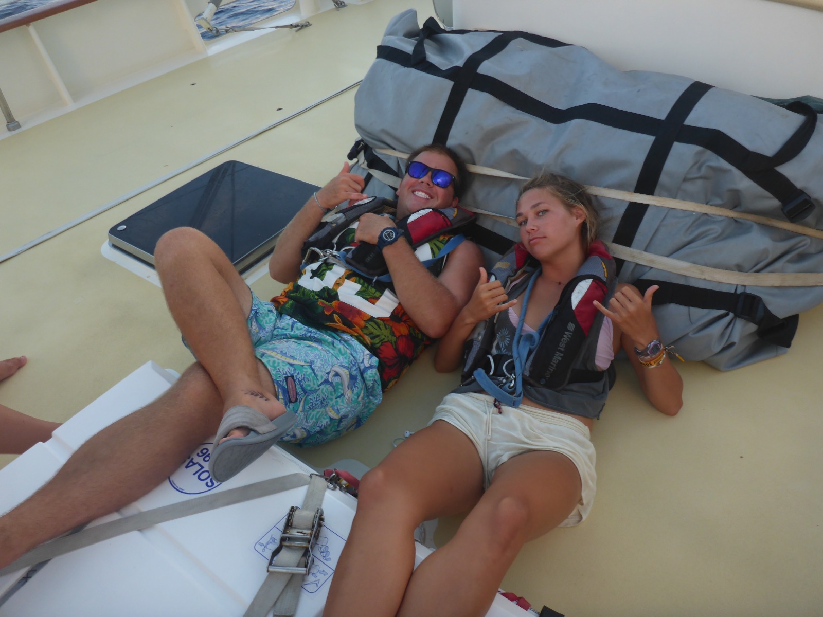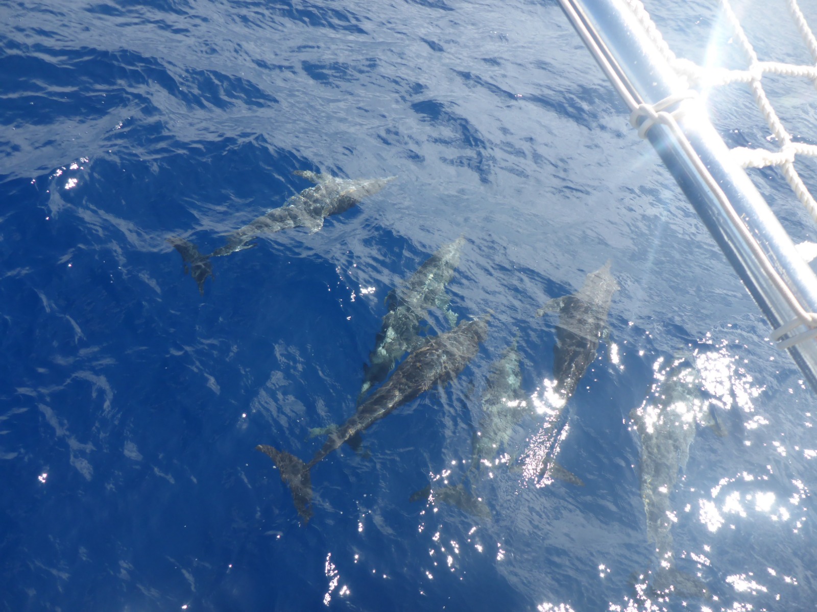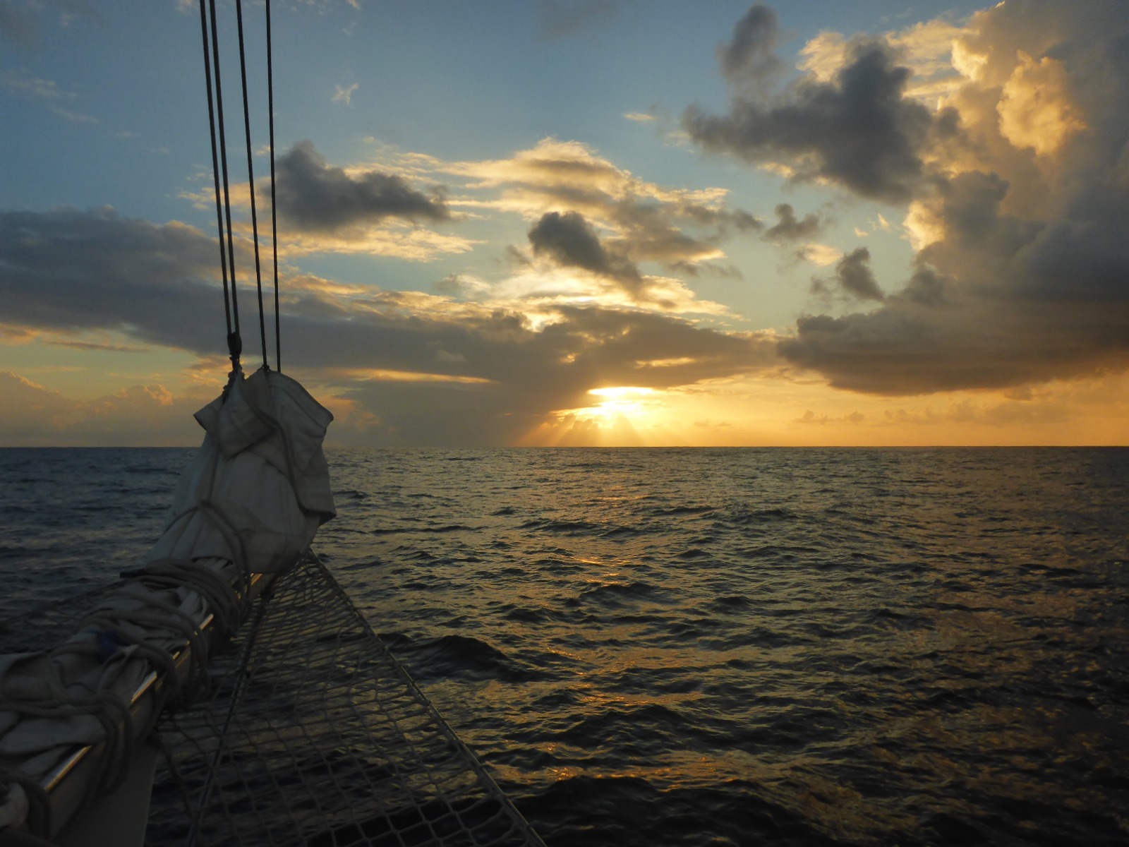 Today started just like any other day, with a magnificent mid-ocean sunrise. We’ve all come to learn that 17 days at sea will force you to find new forms of entertainment, such as partaking in an Irish jig when cleaning the galley, chess wars, cloud watching, stalking your fellow shipmates as they clean their bunks, throwing buckets of water on people, and cockpit gym hour. After a wonderful lunch of rice and curry, we finished our lecture on deep-sea ecosystems, started our lecture on coral reefs, and had our final review before our navigation exam on Monday. Lots of studying for the upcoming marine law exam (for PSCT folk) and the rescue diver test was happening between class and dinner; however, all that was abruptly interrupted when five rough-toothed dolphins started playing at the bow! Today’s chefs (Rob. Nova and Princess) made chicken cordon bleu (and tofu for us non-meat eaters) for dinner, which turned out to be quite a hit. The day ended as usual, with the whole crew coming together for a great meal, a bit of cleaning up, and a gorgeous sunset.