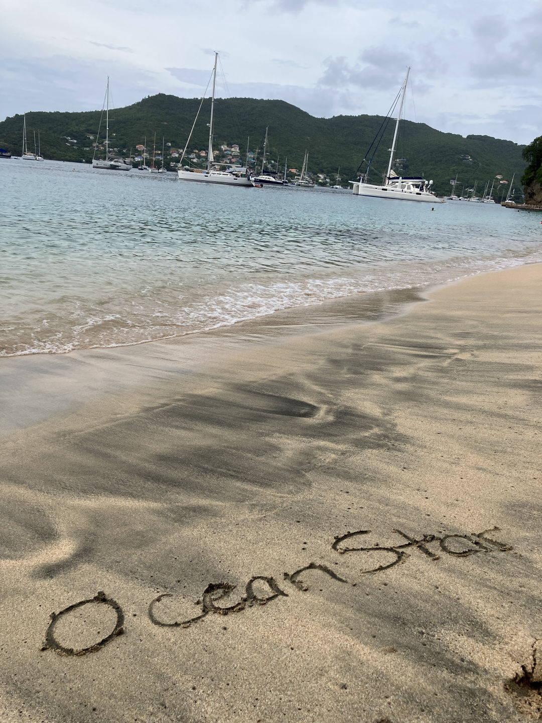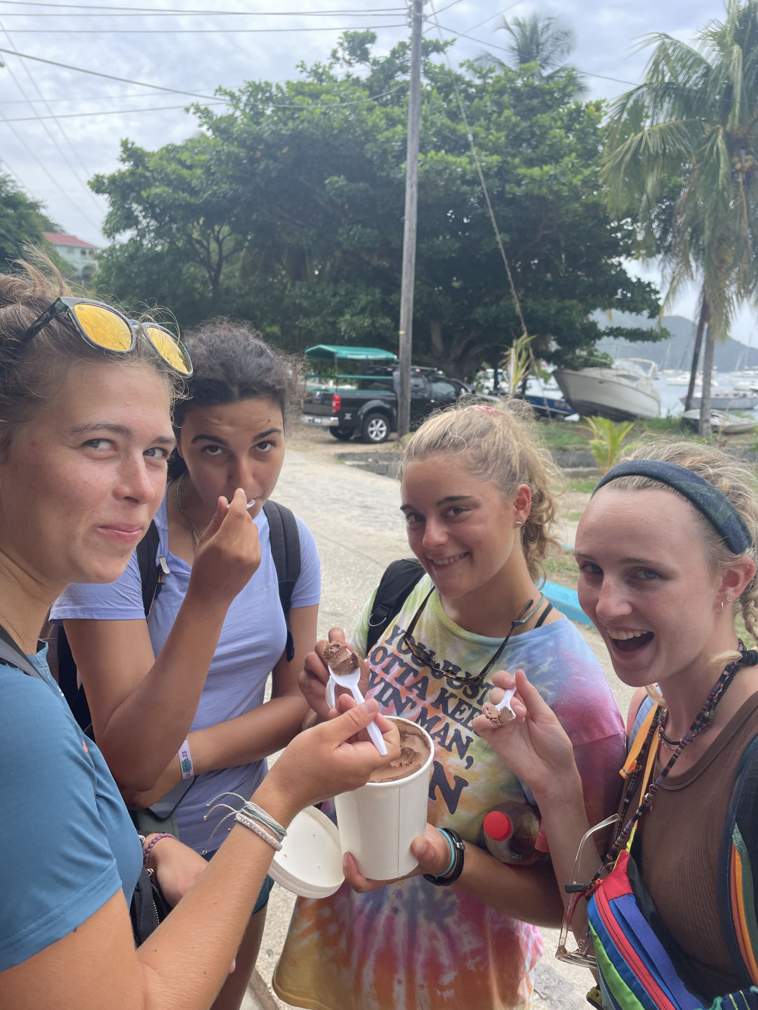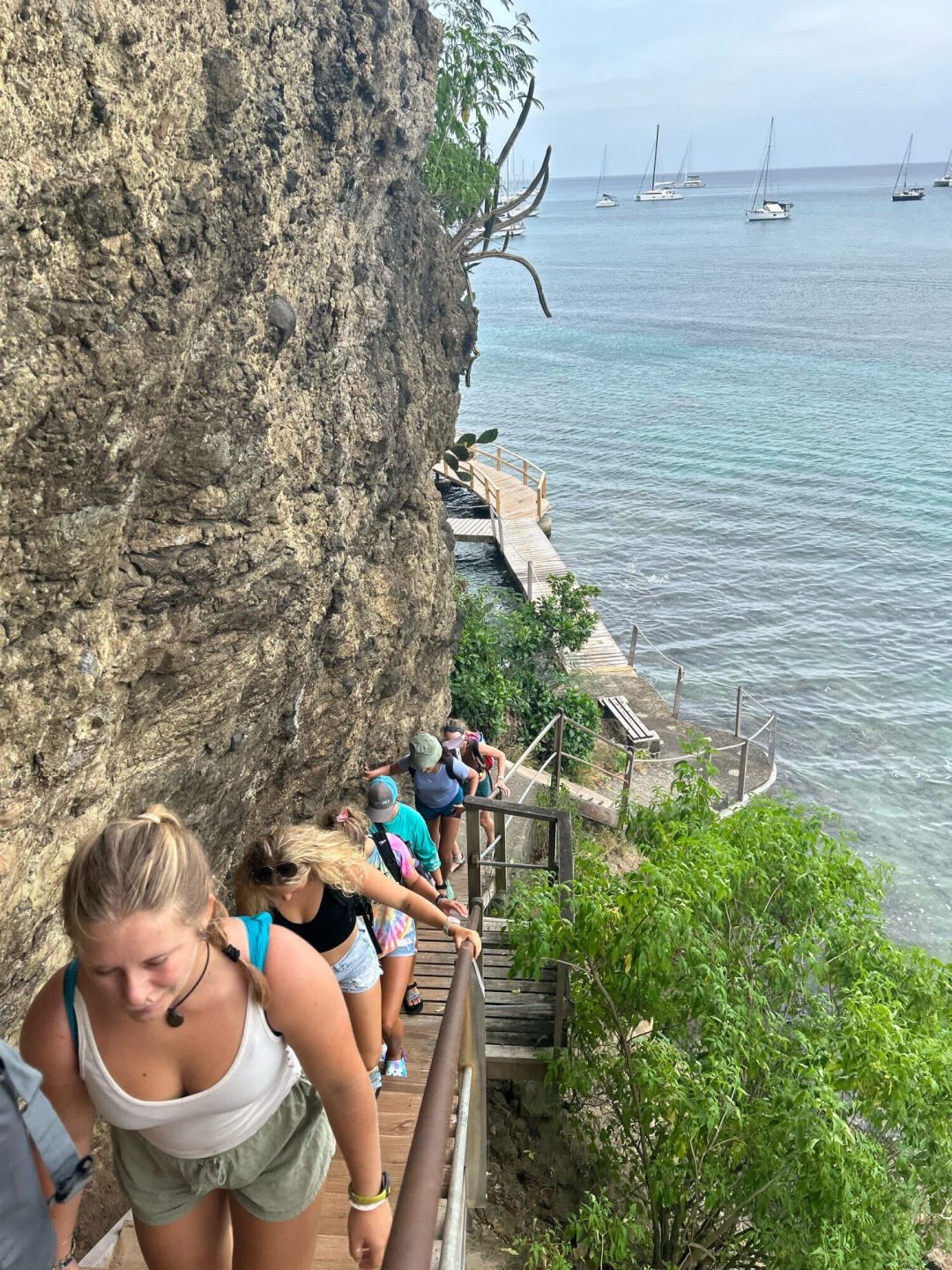 Today started off with breakfast and class right off the bat. Marine bio – an estuary lecture today. Right after, we zoomed into some much-awaited shore time on the island of Bequia, three dinghy rides in, and everyone had their feet planted on a dock right by a very fun-looking hotel/restaurant-type place and a walkway curving around the rocks. Right away, the four boys disappeared, leaving a patently waiting Selin on the dock. After the rest of us washed up on shore, the seven girls and Meg started our walk around the cliffs on a wooden walkway, up and over some cliffs on a crazy cool stairway, and then descended down onto the streets of Bequia. Again, we lost the boys, so their day is more of a mystery, but the rest of us started off our shore time with a trip to the pharmacy, where some with infections picked up their antibiotics and other various prescriptions. Then we headed to a grocery store to stock up on snacks, which we had been running very low on after a group snack fiasco on the last grocery store run. This stop also resulted in the purchase of an entire carton of ice cream and seven spoons, which we used to devour the carton as we walked down the street. Wandering around a bit, we went into a shop or two and listened to the church groups singing. Being a Sunday it was pretty quiet and most things were closed but overall we came to the consensus that Bequia was very cute. Our last stop on the way to the beach/boat was a cafe that had the MOST delicious baked goods and smoothies. There was some carrot cake, lemon tarts, cookies, and a caramel fudge brownie consumed. Then we proceeded back to the beach by the boat dock and swam and swam and ate some of our packed lunches and awaited the dingy. After getting back, we had seamanship class, showers, dinner, and now some studying and bed!