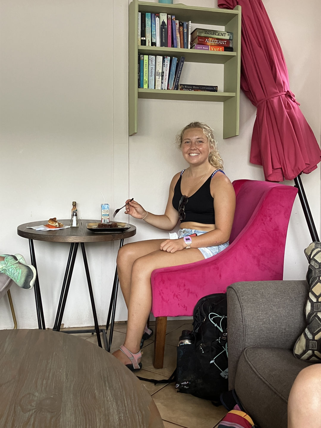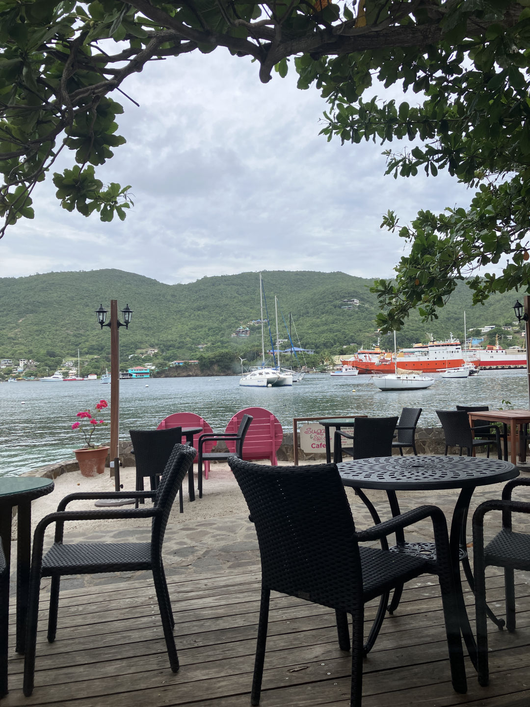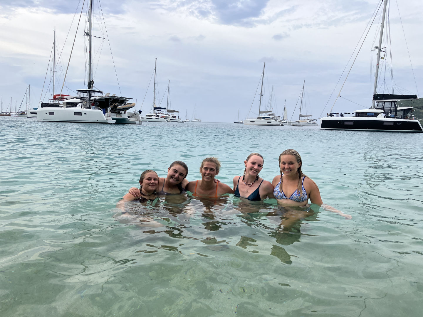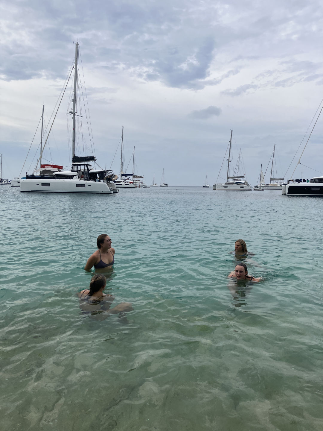 Today started off with breakfast and class right off the bat. Marine bio – an estuary lecture today. Right after, we zoomed into some much-awaited shore time on the island of Bequia, three dinghy rides in, and everyone had their feet planted on a dock right by a very fun-looking hotel/restaurant-type place and a walkway curving around the rocks. Right away, the four boys disappeared, leaving a patently waiting Selin on the dock. After the rest of us washed up on shore, the seven girls and Meg started our walk around the cliffs on a wooden walkway, up and over some cliffs on a crazy cool stairway, and then descended down onto the streets of Bequia. Again, we lost the boys, so their day is more of a mystery, but the rest of us started off our shore time with a trip to the pharmacy, where some with infections picked up their antibiotics and other various prescriptions. Then we headed to a grocery store to stock up on snacks, which we had been running very low on after a group snack fiasco on the last grocery store run. This stop also resulted in the purchase of an entire carton of ice cream and seven spoons, which we used to devour the carton as we walked down the street. Wandering around a bit, we went into a shop or two and listened to the church groups singing. Being a Sunday it was pretty quiet and most things were closed but overall we came to the consensus that Bequia was very cute. Our last stop on the way to the beach/boat was a cafe that had the MOST delicious baked goods and smoothies. There was some carrot cake, lemon tarts, cookies, and a caramel fudge brownie consumed. Then we proceeded back to the beach by the boat dock and swam and swam and ate some of our packed lunches and awaited the dingy. After getting back, we had seamanship class, showers, dinner, and now some studying and bed!