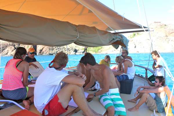 Good morning from the crew of Ocean Star! After a marvelous Thanksgiving evening, everyone rose with good spirits and genuine excitement for what a new day would bring on board. We gobbled down breakfast, moved right into passage prep, and ran those last few minute errands that are crucial when you leave port for a few days. Today, we headed for Ile Fourche and the Bay of Confusion. This place was only a short motor Northeast of St. Barth’s and is named for its shifty winds and obscure topography. Upon arriving and throwing down hook-like pros, the crew had a delectable lunch of sausage sandwiches prepared by JP and Van. With full bellies and cheerful spirits, the crew moved on to Marine Bio class with Matty Rob, which was held under the sea today. Students were required to make observations of different fish and characteristics of their daily habits. As the scholars returned from class, I saw nothing but smiles and heard a number of conversations involving such things as caudal and pectoral fins. Needless to say, they immensely enjoyed the experiential learning. With the couple hours we had left before dinner, the Rescue class tested off the first half of their emergency scenarios, creating search patterns to find missing divers and then bringing them safely to the surface. Everyone did very well; Laurie and I are extremely confident in the skills they have learned. Up next on the docket is dinner, followed by an Oceanography class on fisheries with Laurie, who I’m sure will prove to be just as enlightening. Then it’s into our bunks early tonight as a few have chosen to do a sunrise hike to the highest point on the island.