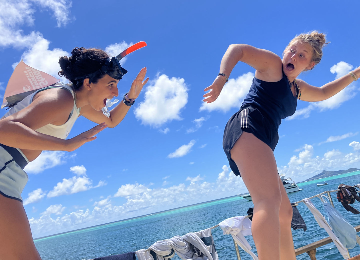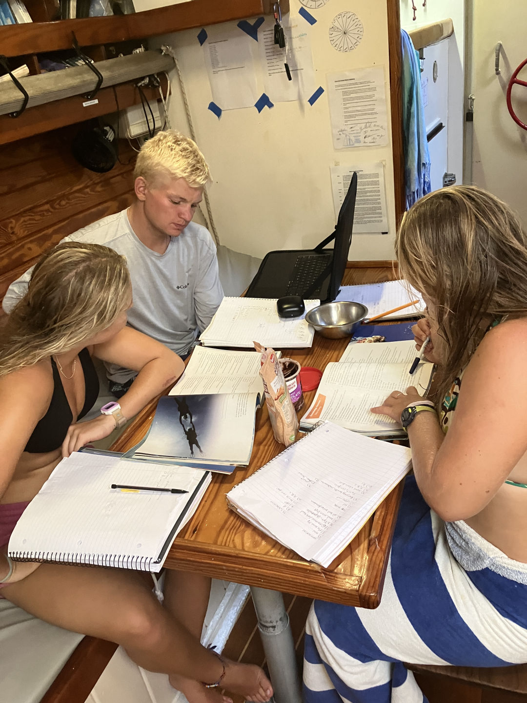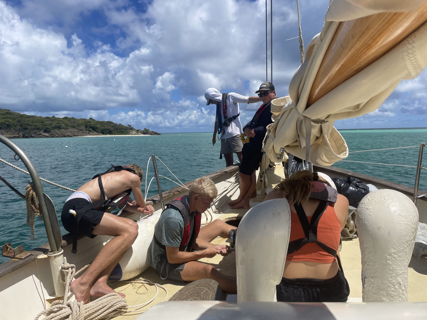 Hello everyone at home, and welcome to day 26 on Ocean Star! Today, we started off the morning with a delicious sausage egg casserole made by Head Chef Alaina James. Afterward, we had our presentations for our literature reviews in Oceanography and learned about some very interesting topics. We had some fun with them as anyone who wore something “out of the ordinary” and ocean-themed got a bonus point. During the presentations, we enjoyed something we haven’t had in weeks: cold juice! Then, we picked up the anchor and departed from the Tobago Cays. We had sandwiches for lunch on our short passage to Saline Bay in Mayreau, then dropped anchor. In the afternoon, we had a leadership presentation from Thomas, causing some exciting discussions on philosophy and ethics. We got some free time in the afternoon and spent it swimming around the boat, diving off the bow, and snorkeling. After that, we did some work in preparation for our upcoming scuba diving advanced open water course. We did our boat showers with a beautiful sunset while blasting some 2010s pop music. Dinner was an amazing pasta chicken dish, and we ended squeeze with the question, “Would you rather fight a lion once a year for the rest of your life or have a rattlesnake in your bed every time you go to sleep?” We had a very eventful cleanup as we saw many spotted eagle rays, sea snakes looking like mystery creatures (because the marine scientists taught us sea snakes don’t live in the Caribbean), squid, and other fish off the side of the boat. We got out some dive lights, went night swimming, and saw some fascinating creatures. After cleanup, we all hung out in the saloon and did some work. Then we watched Pirates of the Caribbean and had popcorn! Stay tuned for a fun and out-of-routine day tomorrow! Signing off. – Corinne