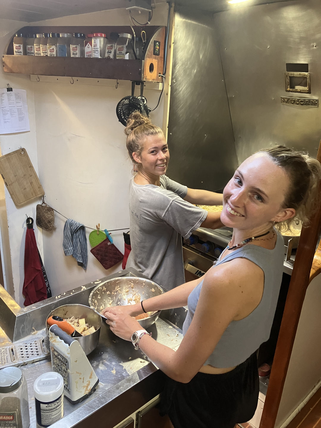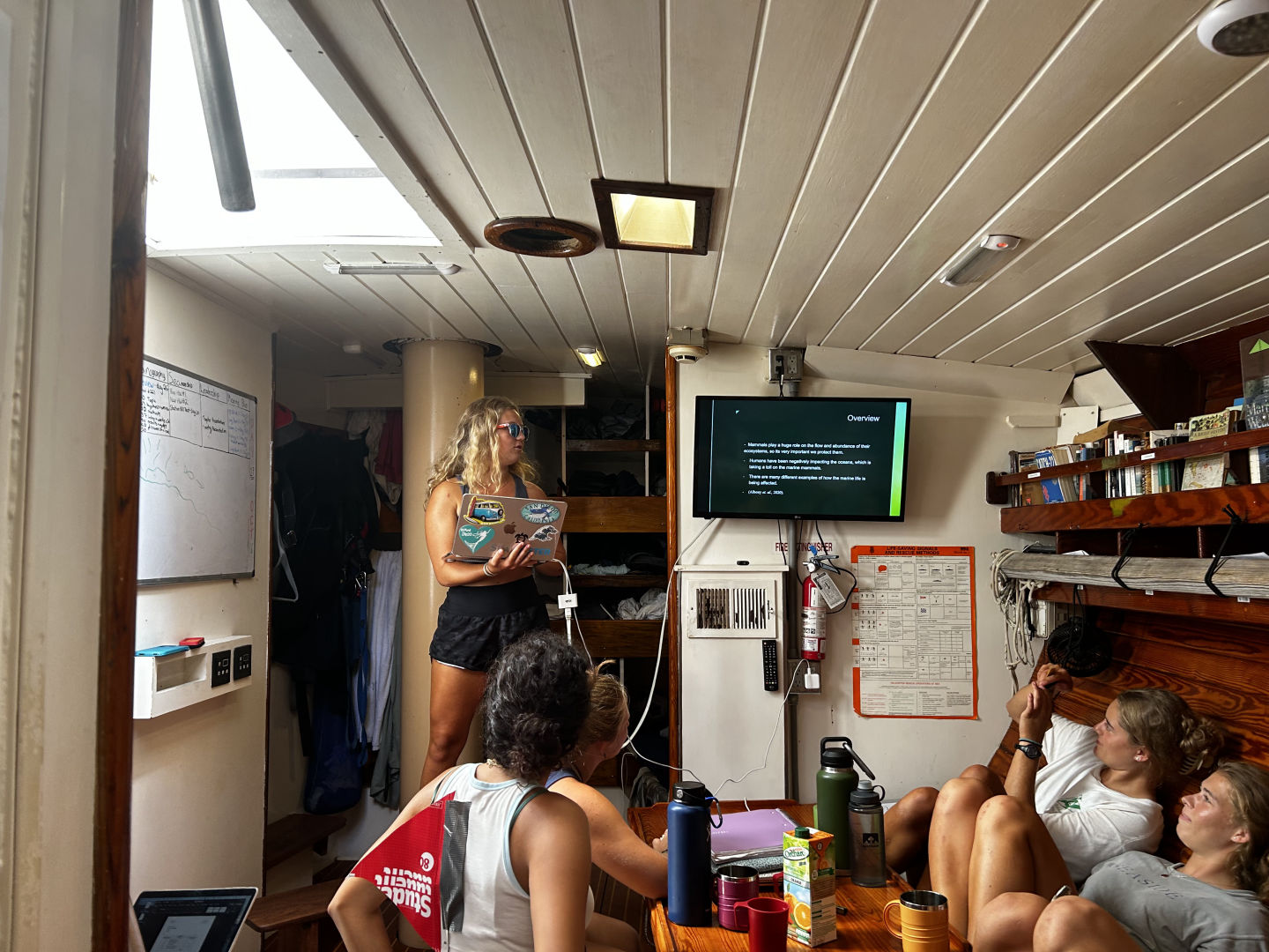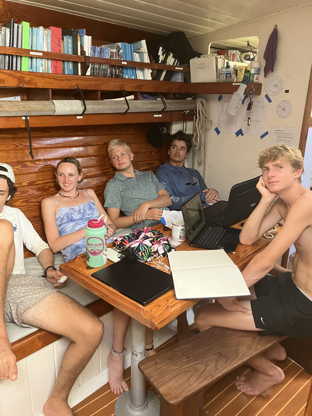 Hello everyone at home, and welcome to day 26 on Ocean Star! Today, we started off the morning with a delicious sausage egg casserole made by Head Chef Alaina James. Afterward, we had our presentations for our literature reviews in Oceanography and learned about some very interesting topics. We had some fun with them as anyone who wore something “out of the ordinary” and ocean-themed got a bonus point. During the presentations, we enjoyed something we haven’t had in weeks: cold juice! Then, we picked up the anchor and departed from the Tobago Cays. We had sandwiches for lunch on our short passage to Saline Bay in Mayreau, then dropped anchor. In the afternoon, we had a leadership presentation from Thomas, causing some exciting discussions on philosophy and ethics. We got some free time in the afternoon and spent it swimming around the boat, diving off the bow, and snorkeling. After that, we did some work in preparation for our upcoming scuba diving advanced open water course. We did our boat showers with a beautiful sunset while blasting some 2010s pop music. Dinner was an amazing pasta chicken dish, and we ended squeeze with the question, “Would you rather fight a lion once a year for the rest of your life or have a rattlesnake in your bed every time you go to sleep?” We had a very eventful cleanup as we saw many spotted eagle rays, sea snakes looking like mystery creatures (because the marine scientists taught us sea snakes don’t live in the Caribbean), squid, and other fish off the side of the boat. We got out some dive lights, went night swimming, and saw some fascinating creatures. After cleanup, we all hung out in the saloon and did some work. Then we watched Pirates of the Caribbean and had popcorn! Stay tuned for a fun and out-of-routine day tomorrow! Signing off. – Corinne