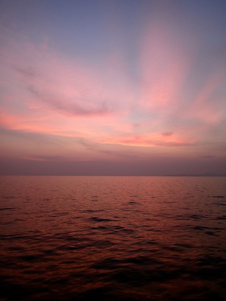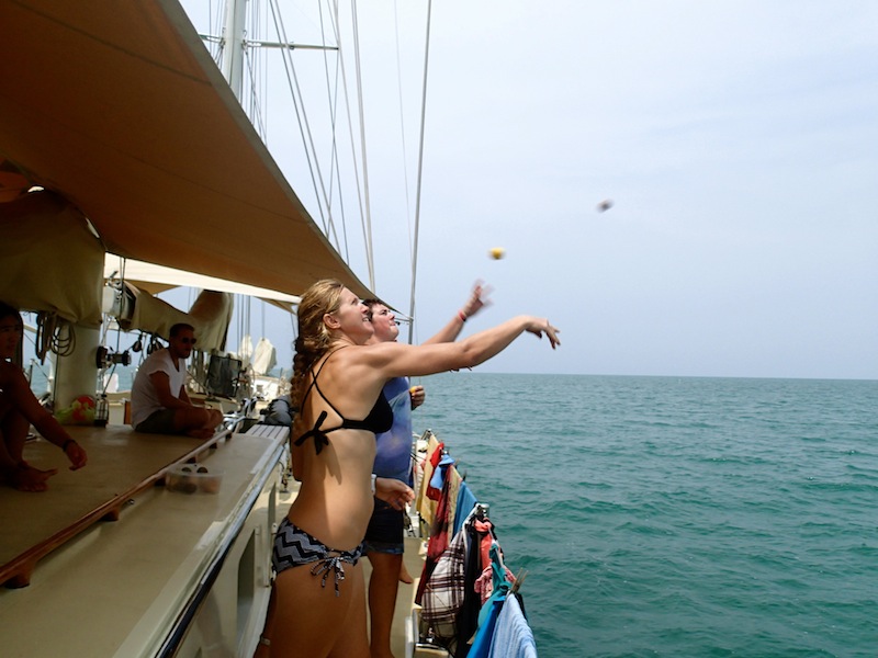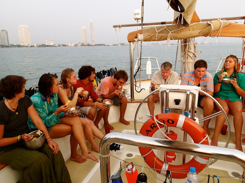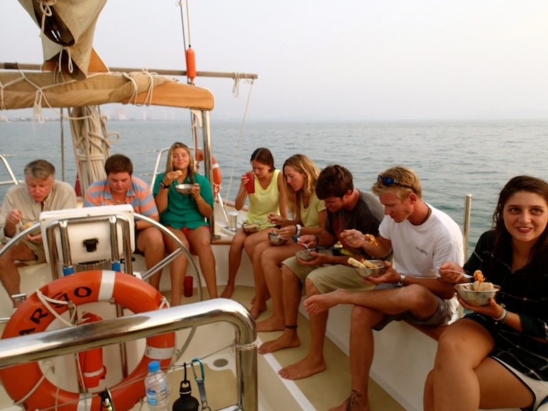 We arrived in Pattaya with the sunrise early this morning after our short and sweet (and final) passage from Koh Chang. It was bittersweet to be flaking our sails one final time. The crew was kept busy all day with an extensive down below BA. We cleaned every nook and cranny, recovering flash drives and squished Mentos from underneath our mattresses. We pulled our suitcases out of the bilges where they had lived for the past 88 days and packed up our cabins. Many of us donated various clothing, toiletries, and school supplies in order to make room for the elephant pants and traditional Indonesian spears we are bringing home. We got a glimpse of shore time this afternoon in which many of us were soaked by water guns as part of a Thai New Year celebration taking place in Pattaya right now. Shannon, Anna, and Katie had their feet nibbled on by little tiny fish. Apparently, it tickled a lot because none of them could sit still. In other news, Mandy did her first backflip off the boat during showers!