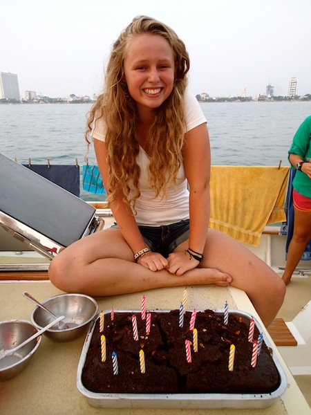 It was a pleasure to have Jim join us for a squeeze and dinner. We ate a delicious chocolate cake to celebrate Desiree’s 19th birthday. Happy birthday, sweet Des! As part of our closing ceremony, we watched a video made by Carolyn showcasing how far we’ve come these past three months. It is slightly embarrassing to see how pale we used to be and how long it took us to raise the sails. Currently, everyone has sprinkled themselves around the boat to write letters to one another as part of the Seamester tradition. The 19 of us have spent an amazing three months doing and seeing things I never imagined. Thank you, Argo, for carrying us safely through the Indian Ocean. Through Thailand, Malaysia, Indonesia, Singapore, and the Maldives. I’ve lived some of the best memories on board, moments I will never forget.
