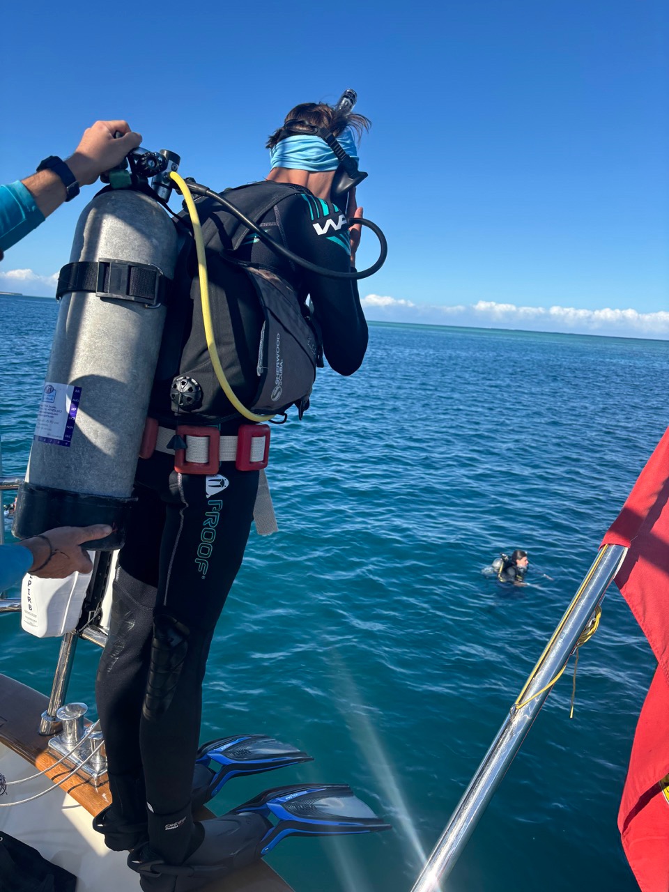 Today, we had banana and cheese French toast for breakfast. After breakfast, those working on their PADI open water diver certification went out to do more diving. Those who were already certified learned how to drive the dinghies. For lunch, Tomer made stuffed bell peppers, salad, and little penguins out of olives. After lunch, we started intro to marine biology and had our first lab. For the lab, we swam to the nearby sandbar and collected pictures and drawings of marine life. We saw a stingray, and small octopus, hermit crabs, and much more. After the lab, we returned to Argo and started preparing to move to a floating restaurant for dinner.