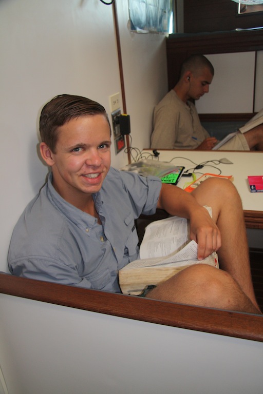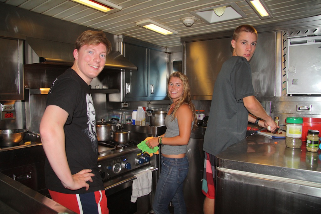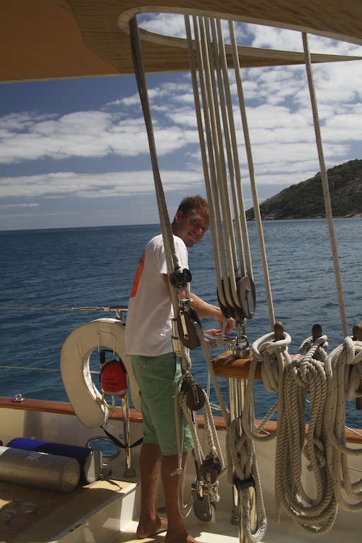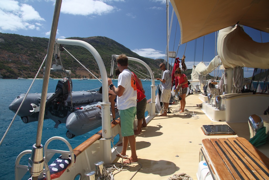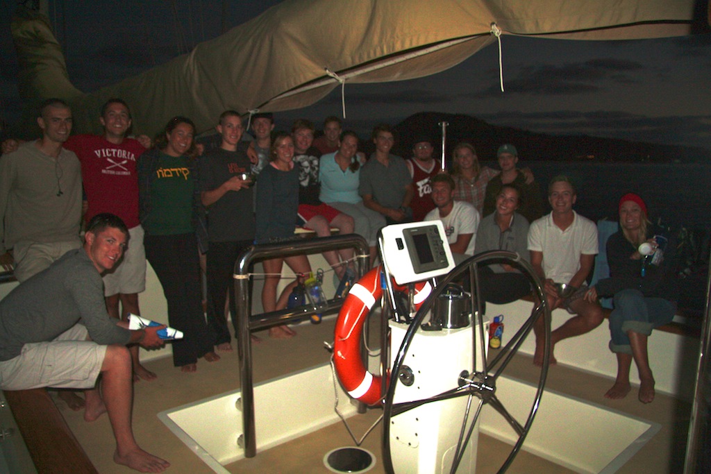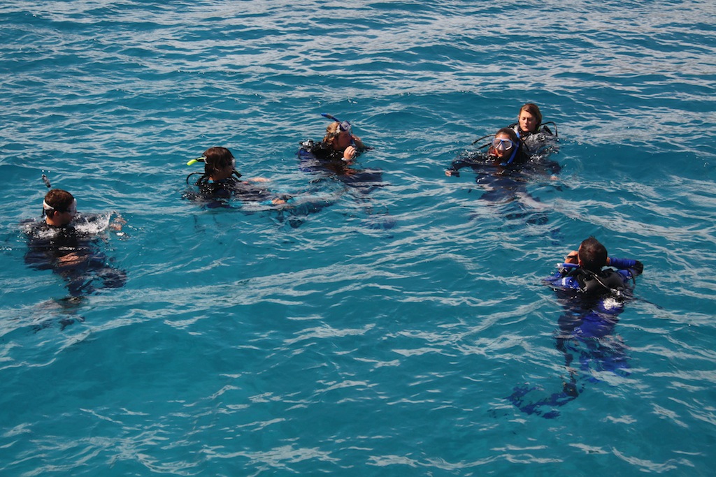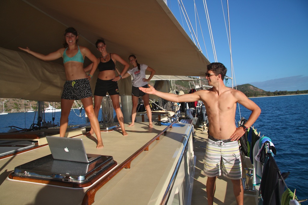Well, we are halfway through our second week – part of me feels like it has been a lot longer already since everyone has started to get really comfortable with each other, and at the same time, I can’t believe it has been that long already. The program has been going great so far. We have a great crew on board, the weather has been awesome, and the islands of Australia we have been to have been beautiful. We are currently anchored in a bay on Lizard Island, which is one of the best-known islands on the Great Barrier Reef. And what better place than the middle of the Great Barrier Reef to learn about coral? This morning, after breakfast, we had an OCB class, in which I taught about the phylum cnidaria, which includes jellyfish and corals. Everyone has been working hard on their species ID logs, going through all of the books we have onboard Argo to identify the species of fish, invertebrates, and corals that they have been seeing on their dives so far. Ya,y science! Today was also another day full of diving – the students working on their Open Water certification had their fourth and final dive in the morning. In the afternoon, the Advanced Open Water students did their navigation dive. The Open Water students also took their final exam in the afternoon. So now everyone onboard Argo is a certified diver (and there is currently cake baking in the oven for a celebration!) There are many ways to enjoy the beautiful scenery here. Although I did not get in the water with the rest of the divers today, I enjoyed it by going for a paddle around the bay on my inflatable stand-up paddleboard. Upon my return, I kept the endorphins flowing by leading a Zumba class on top of the deck. It was a small but committed group (Zoe, Annie S, Alec, and I), and we had a lot of fun dancing around. I think we provided a bit of entertainment for the rest of the crew. The day concluded with once again a brilliantly colored sky at sunset, always one of my favorite parts of the day.