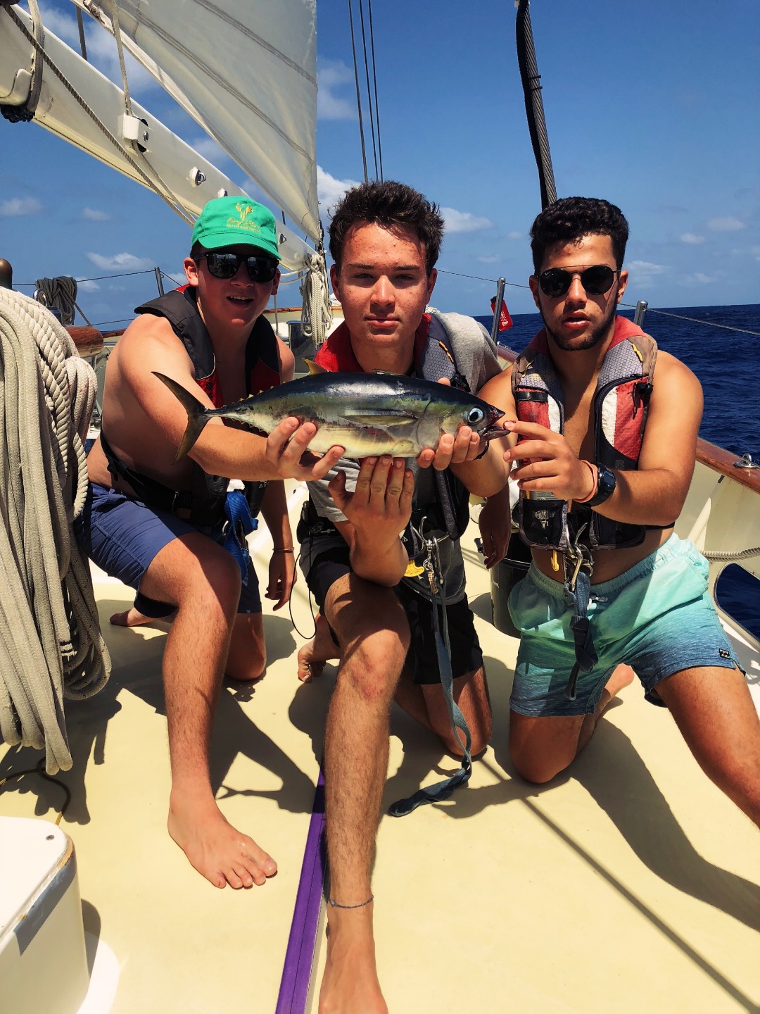 Yesterday merged into today as watch team one took the 4-8 am shift, and they were instantly tasked with finding the bearings for a ship off our starboard side. Once the ship, the Torm Mary, was close enough, we were allowed to contact them on the VHF and learned that they were also crossing the Atlantic, but they were coming from Argentina and heading to Morocco. Later, while some people were frantically working on their oceanography papers, others were on deck completing plankton tows and reeling in what might be the smallest tuna. After seamanship class and a study hall, we took refreshing showers and continued to frantically finish our papers. When we finally turned them in, we were rewarded with a delicious dinner of hamburgers, coleslaw, green beans, and fries while Ben raised the courtesy flag of Brazil. We are now going to bed, relieved that our next paper isnt due for another five days, and excited about the fact that we are going to get to see land again tomorrow.
