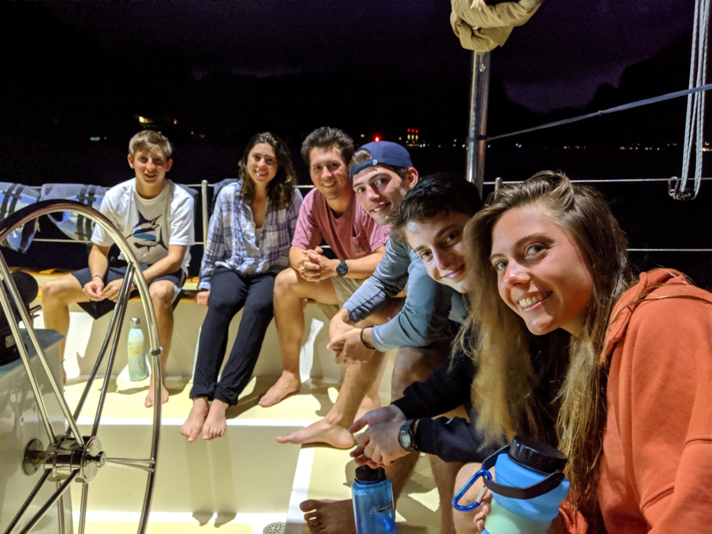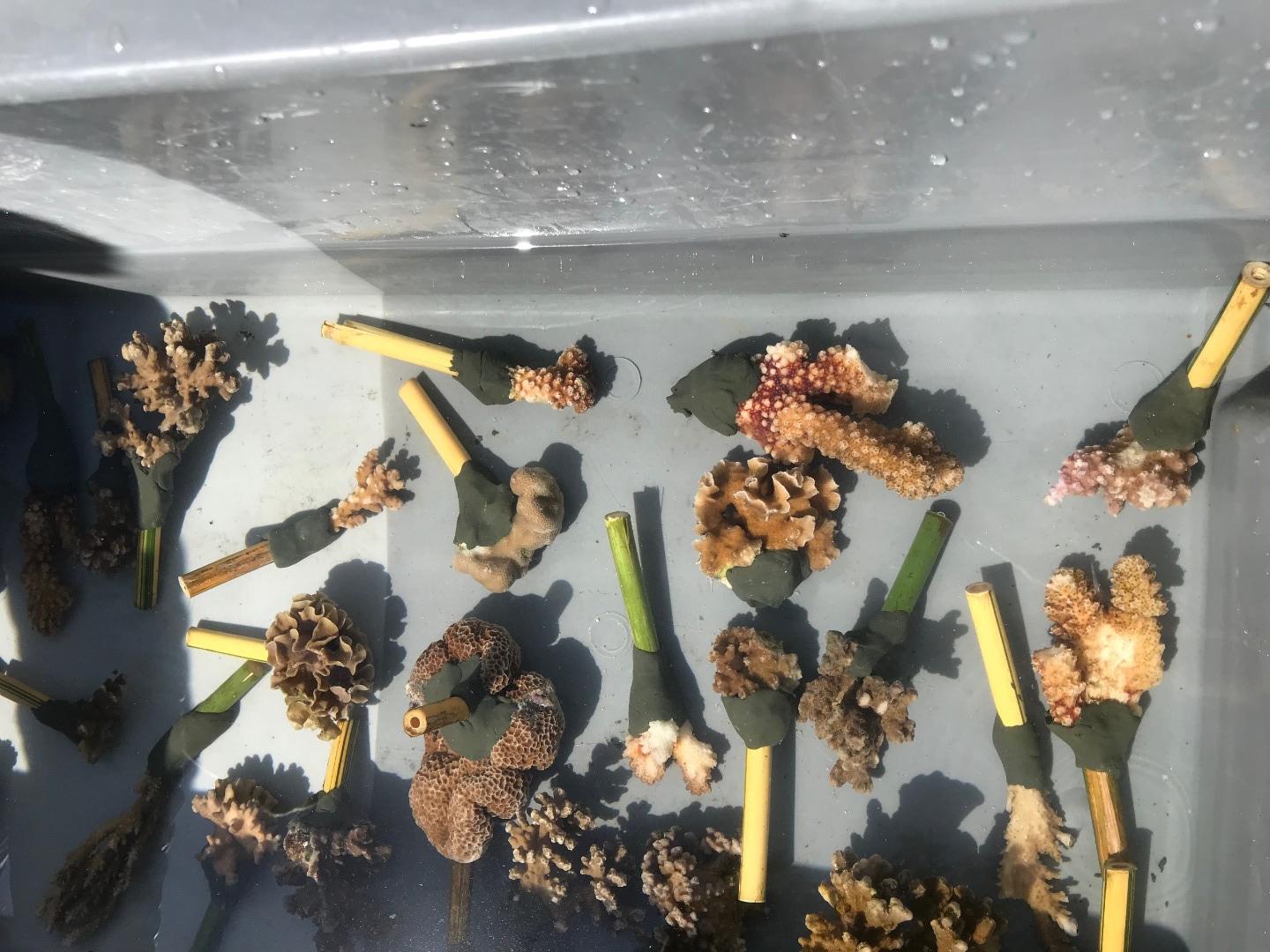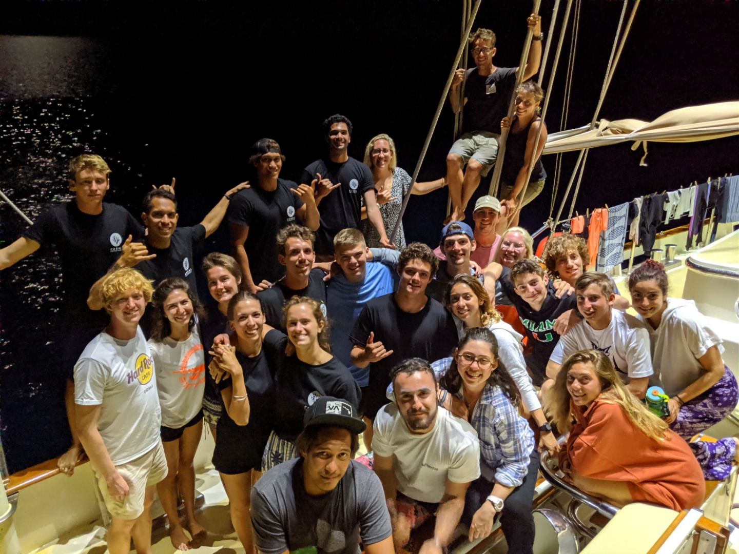 Pictured: View from the Coral Gardeners headquarters; students gathered around to learn about coral transplanting; baby coral fragments; attaching coral fragments to bamboo sticks for transplantation; Garrison and Frank in their war paint/reef-safe sunscreen; Argo from afar; sunset panorama while open water students worked on their confined water skills; scuba with a view for Amanda, Garrison, and Kari; Sam, Maddy, and Ryan on deck for sunset; Danny, Maddy, Sam, Ryan, Evan, and Cat in the cockpit before dinner; Argo crew with our Coral Gardeners visitors; group photo with the Coral Gardeners.