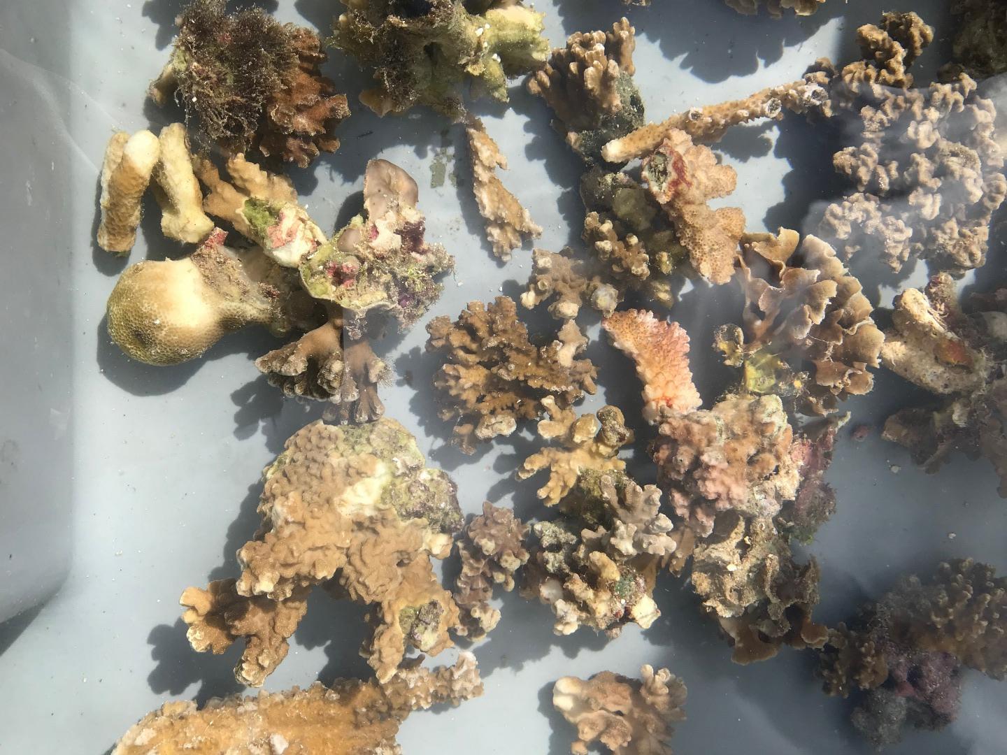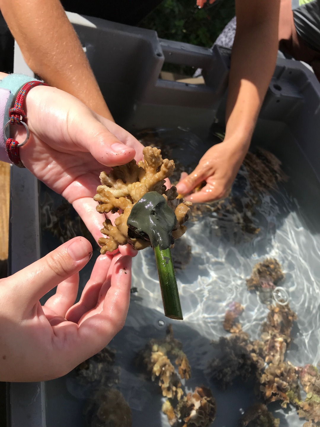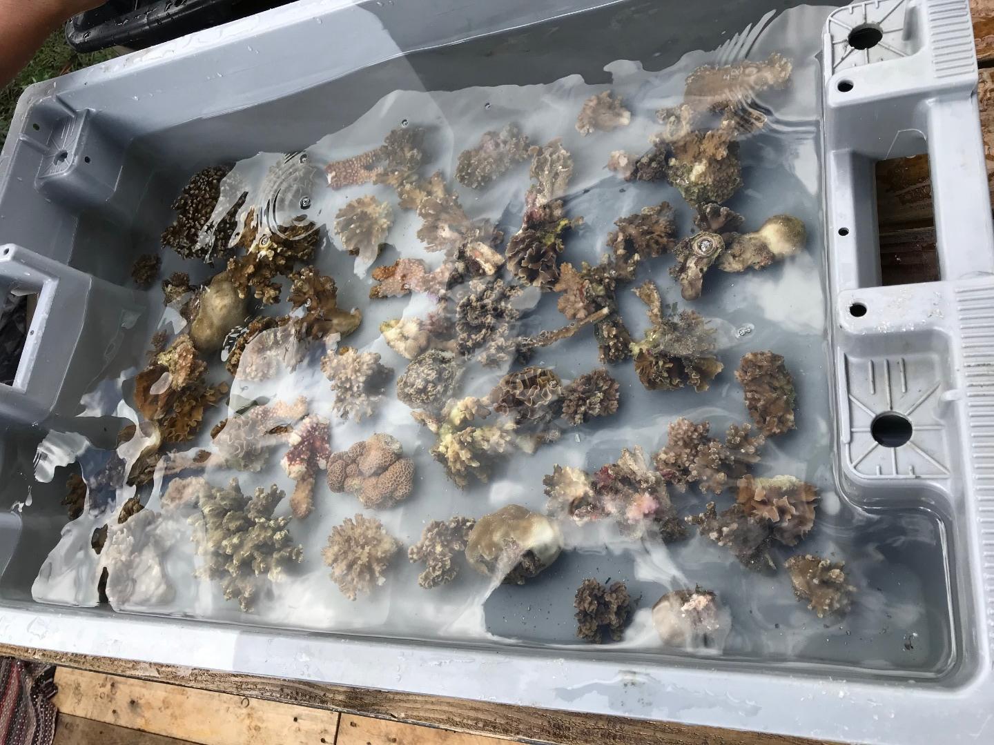 Pictured: View from the Coral Gardeners headquarters; students gathered around to learn about coral transplanting; baby coral fragments; attaching coral fragments to bamboo sticks for transplantation; Garrison and Frank in their war paint/reef-safe sunscreen; Argo from afar; sunset panorama while open water students worked on their confined water skills; scuba with a view for Amanda, Garrison, and Kari; Sam, Maddy, and Ryan on deck for sunset; Danny, Maddy, Sam, Ryan, Evan, and Cat in the cockpit before dinner; Argo crew with our Coral Gardeners visitors; group photo with the Coral Gardeners.