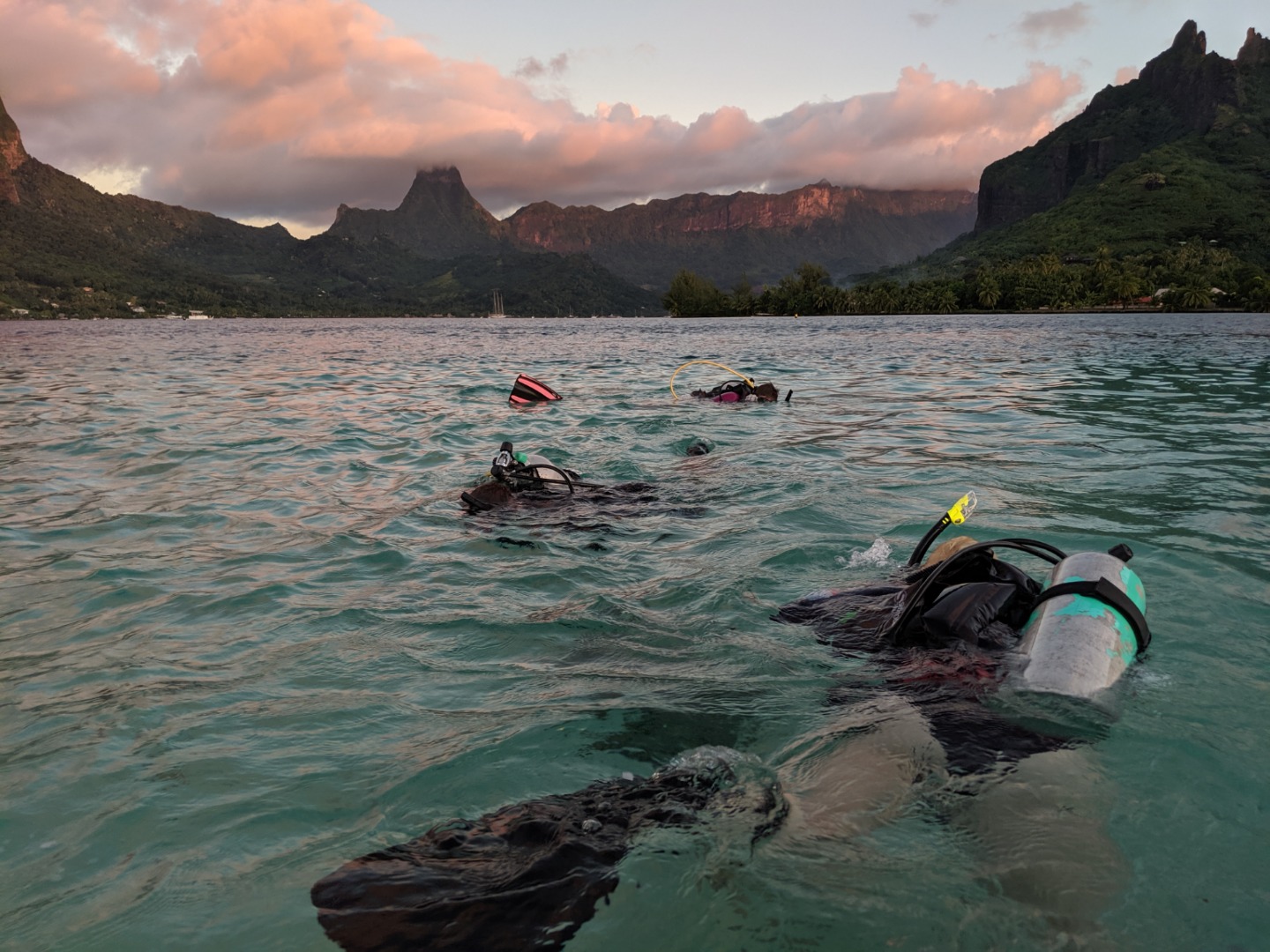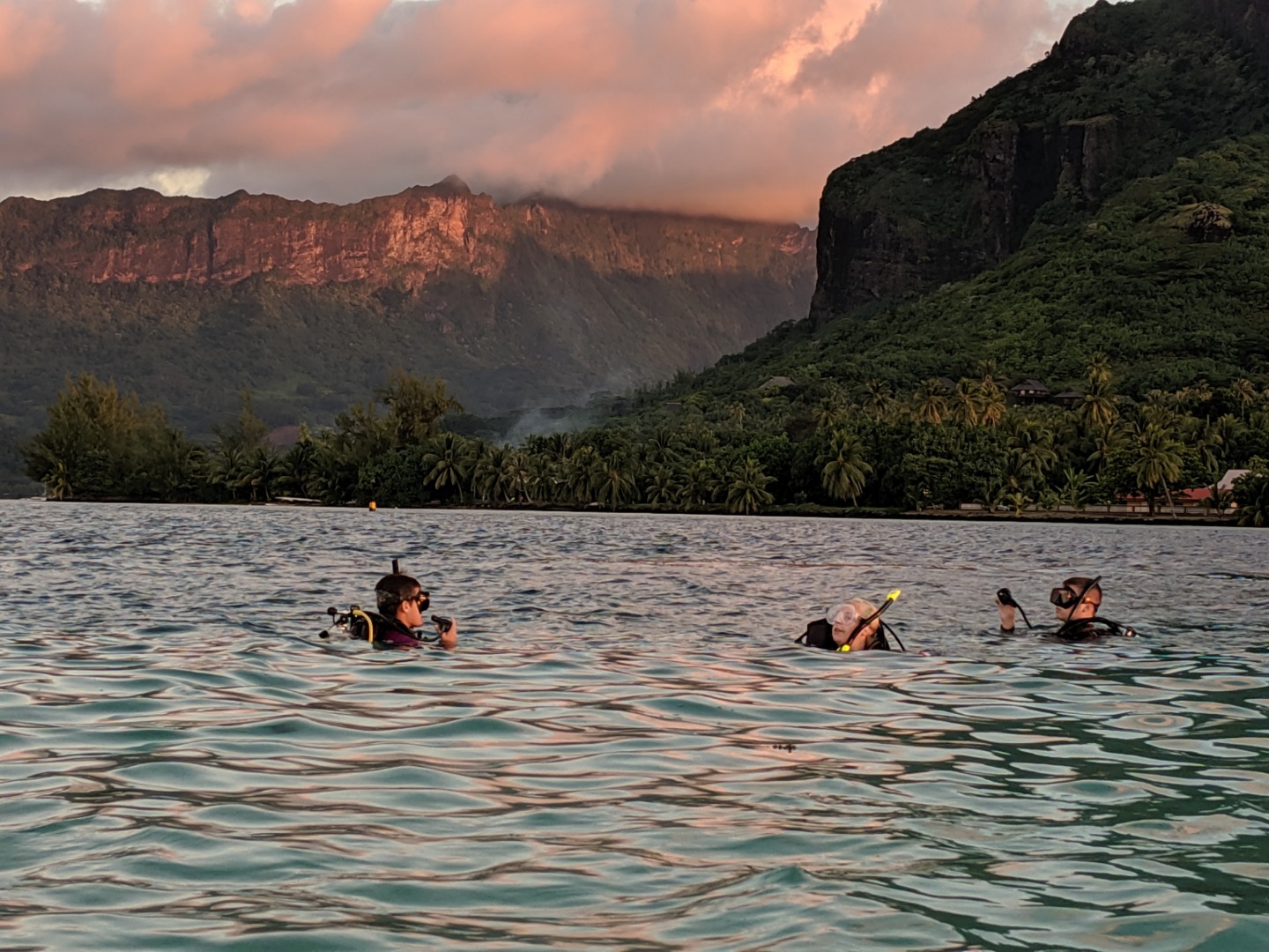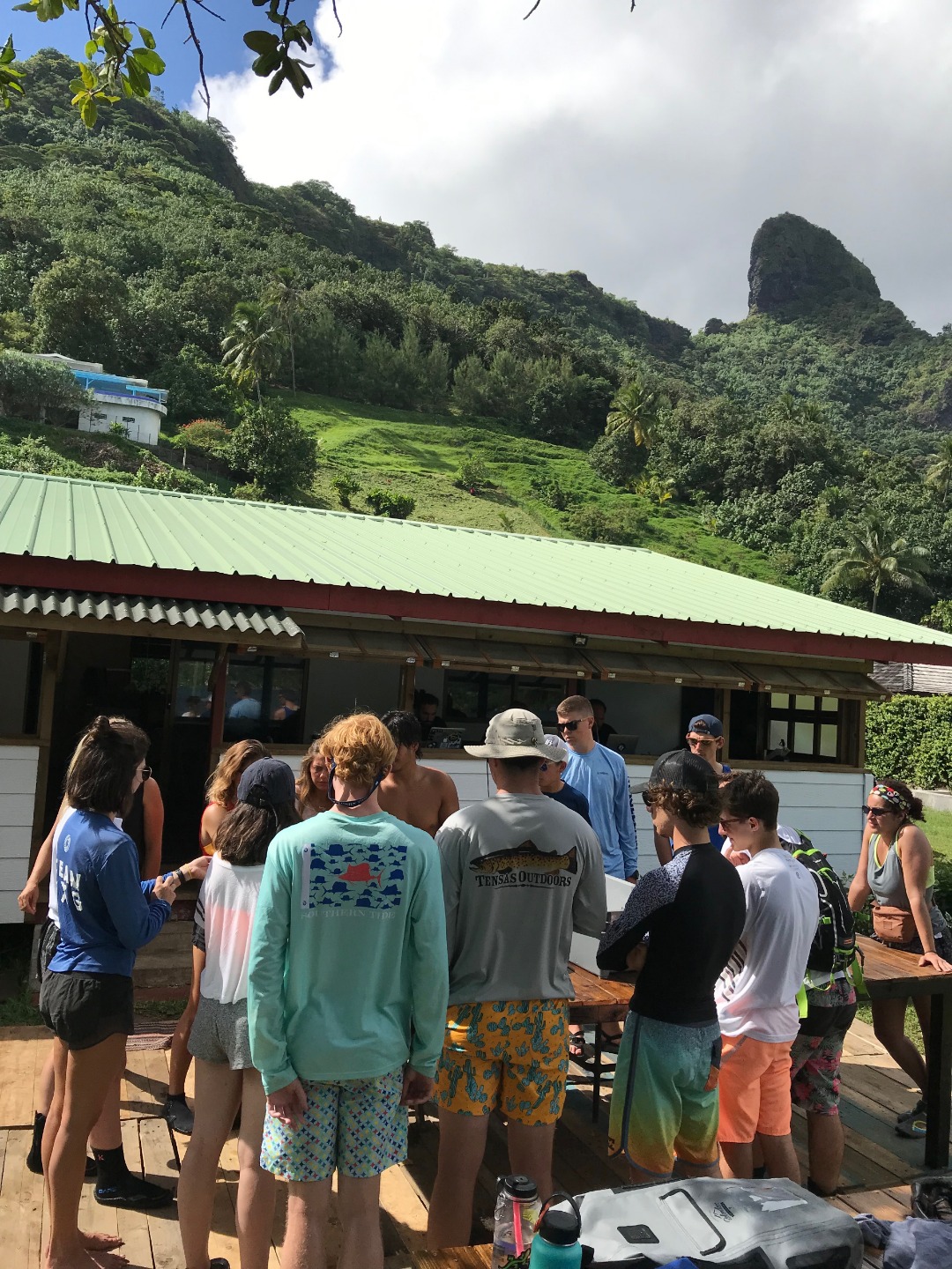 What a beautiful sunrise we all woke up to! Last night was the first time we ever rotated through anchor watch during the night, so a couple of crewmates were slow getting up. We had breakfast and took down the dinghies for the first time to land at the local dock and walk on the main road of Moorea to see the Coral Gardeners, a coral reef restoration establishment created by young locals. While we were there, we were educated on the purpose of coral reefs and their relations to the ecosystems around them. We learned that these special young influencers are 85-90% successful in their restoration of coral reefs. Even Jack Johnson wore their merch at his concert in Tahiti! After the presentation, we restored coral reefs by attaching bamboo sticks with a natural epoxy to the fragmented corals. The group split in half, and one group went out to the coral tables to pick out a coral, name it, and then plant it in the “potato corals” while the other group played chicken fight in the water. The potato corals have holes that are drilled into them that the bamboo with the epoxy and fragmented coral piece fit into perfectly. After we planted our corals, we were able to adopt our coral with complete certification then optionally. Then it was time to go, and we all thanked the Coral Gardeners staff for their time with us, and we headed back to Argo for lunch then some diving! The open water class went in for their first confined open water sessions to learn and practice skills, and the already certified divers went for a checkout dive. After the open water dives, we prepared the boat for our guests from the Coral Gardeners crew to have dinner on Argo with us. We were able to interact with the locals some more and learn some unique traditions these people have been passing down from generation to generation, such as reading the stars and navigating from Tahiti to Hawaii with just the palm of your hand. All in all, today was great!