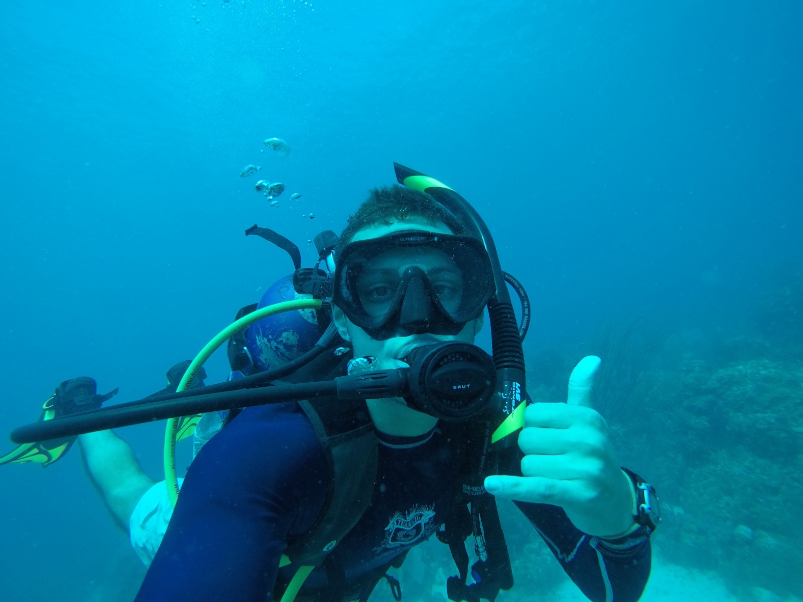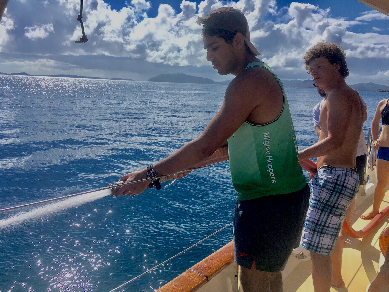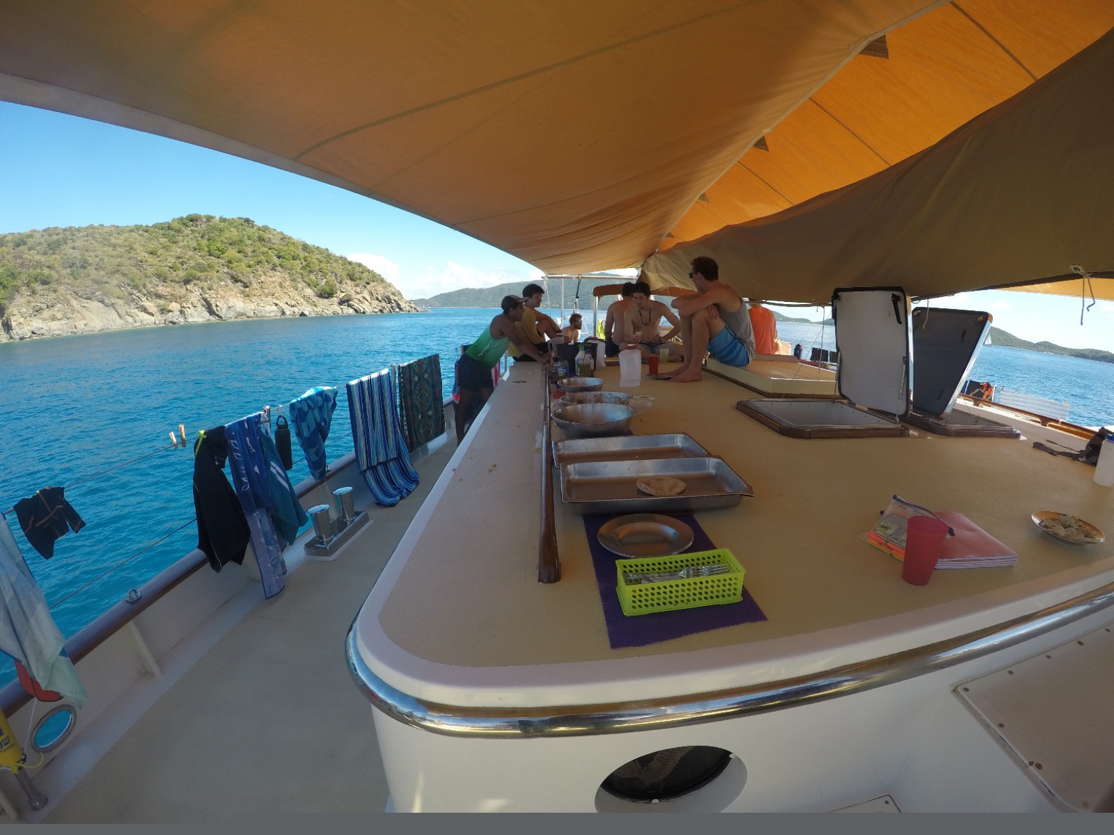 It is day seven for the crew abroad, the Argo, and everyone is enjoying our current tropical lifestyle. After serving a late watch from 6-7 AM, I woke the crew using the same music I use to wake up my seven y/o campers at summer camp. The crew enjoyed Cap’t Ben’s (not me) delicious chocolate muffin breakfast. “Muffin” is a loose term here, apparently – I could get used to brownies for breakfast! After breakfast, we suited up in wetsuits and SCUBA gear in preparation for a dive on “Coral Gardens.” Hopping directly off the boat, we descended 50 feet through crystal blue water towards the main attraction – the broken fuselage of a downed airplane. The dive went great for everybody, and I was able to see the vibrantly decorated Stoplight Parrotfish and Blue-headed Wrasse, the odd trunkfish, and a huge four-foot barracuda. After spending 40 minutes at depth, we returned to Argo for a delicious lunch of hummus and tuna pita pockets. After lunch, the crew ran through a fire drill, learning protocol and how to operate fire hoses and life rafts. After drills, we prepared Argo to get underway and cruised to our current anchorage of Great Harbor, off of Peter Island. I spent the time before dinner working on illustrations for my Fish I.D. book and sorting through all the pictures; I took for the trip log today. I hope you enjoy the pictures I’ve chosen! If you look carefully, you should be able to spot a barracuda, an eel, and me. After dinner, I wrote this blog and will shortly sit for our first Leadership lecture. The weather has been perfect, the views picturesque, and the crew has truly started to get to know one another. I’m excited for the adventures to come, from exploring new South American countries to our first overnight passage. Life is Great!