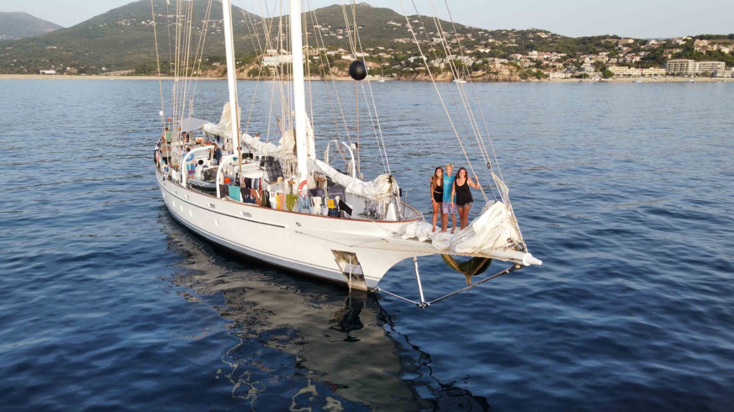 Picture 1- Courtney, Fitz, and Savannah on the bowsprit of Vela