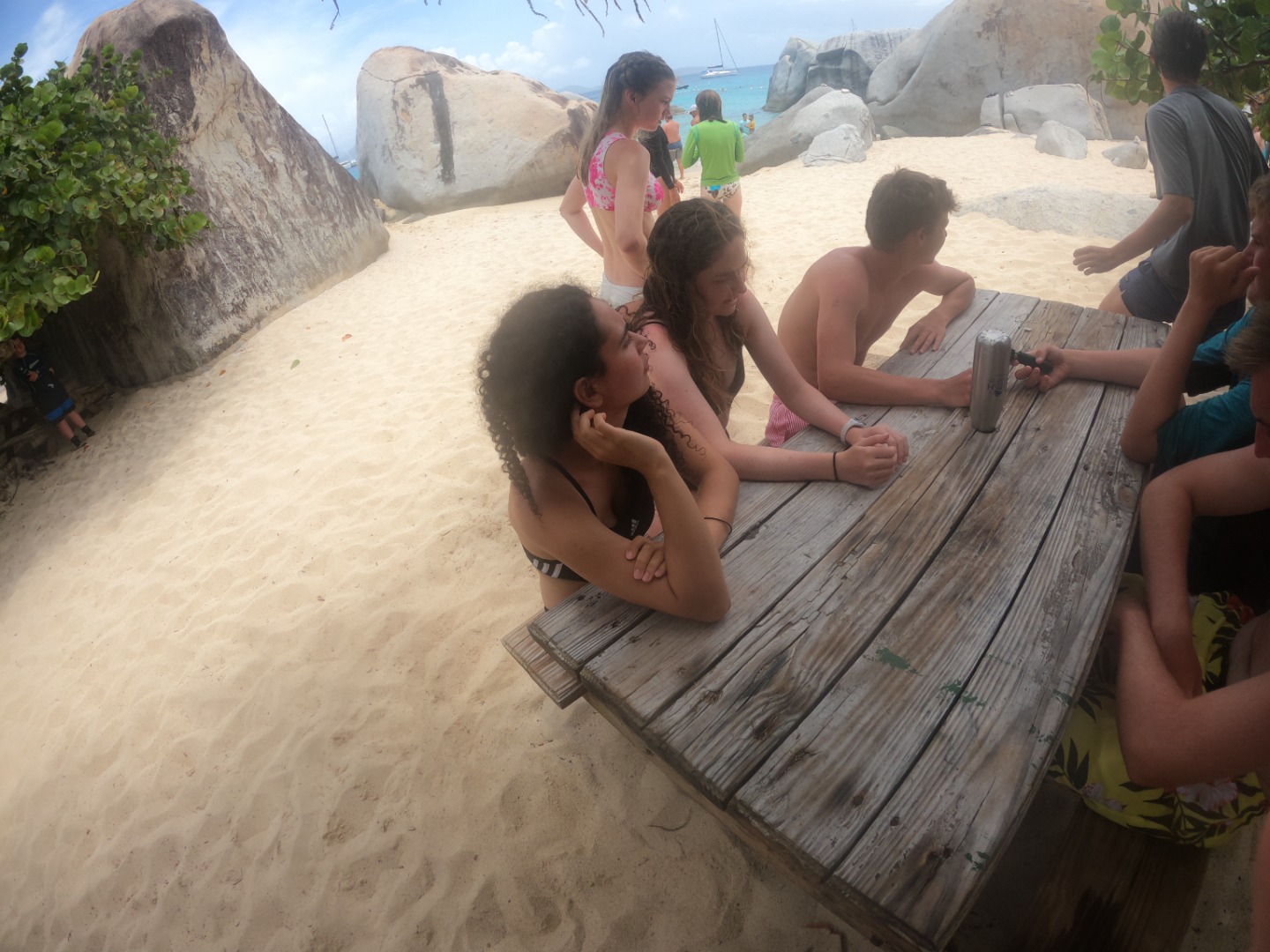 The morning started in Savannah Bay, a picturesque start to a great day. We got an early start as we headed for the baths for a full morning of climbing, exploring, jumping, and a touch of spelunking. There was something for everyone as parts of our group caught the sun on the beach, others summited boulders, and some spent hours diving off the rocks. Calum was a mountain goat and Paige (after some time) perfected the dive, while James was just trying to make it out in one piece. Everyone regrouped, and we had a quick jet over to Spanish Town, where everyone got ashore. We had great eats and shopping, interrupted by a few nasty squalls. After our return to Vela, we cheffed up some wicked tacos before everyone sprinted to their fowlies to avoid yet another squall to cap off the day. A peaceful night concluded the day with everyone working on their own stuff, whether it be essays or just some card games, while getting stoked for an awesome wreck dive tomorrow. If there is one lesson to be learned from today, I would tell you: wear sunscreen no matter how overcast it may look.