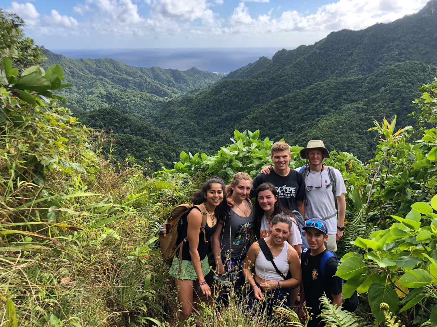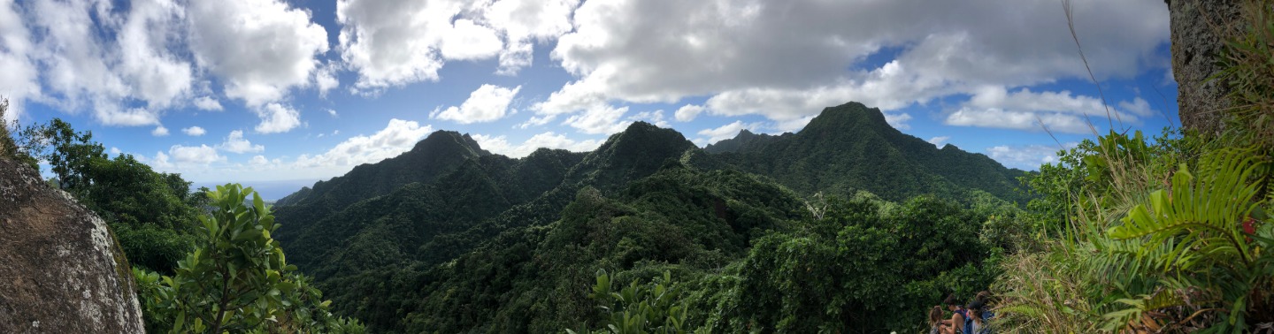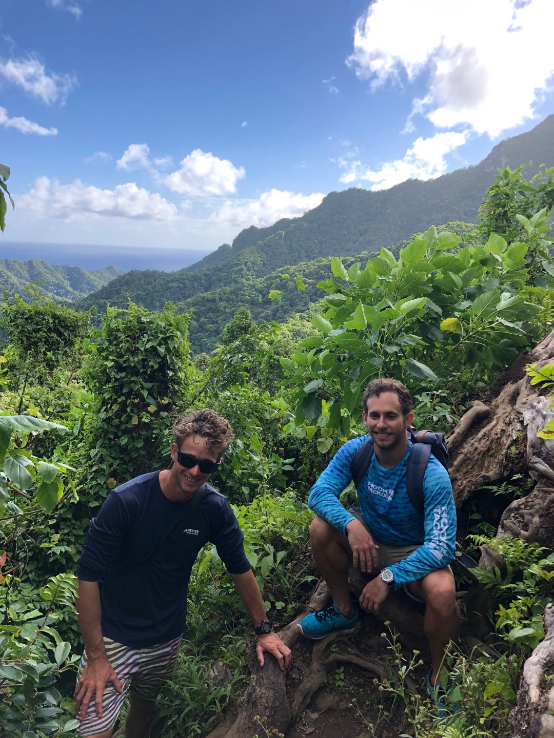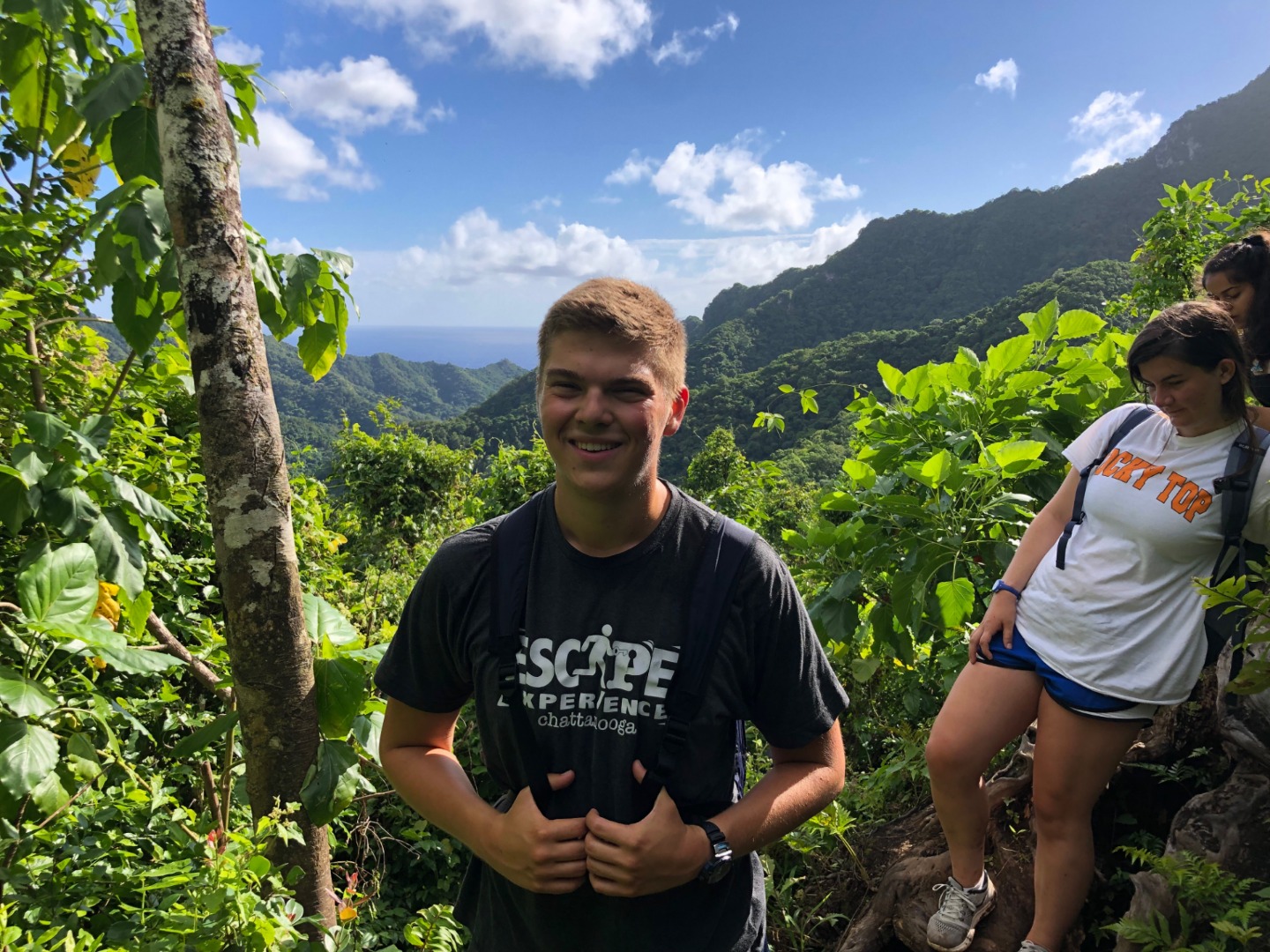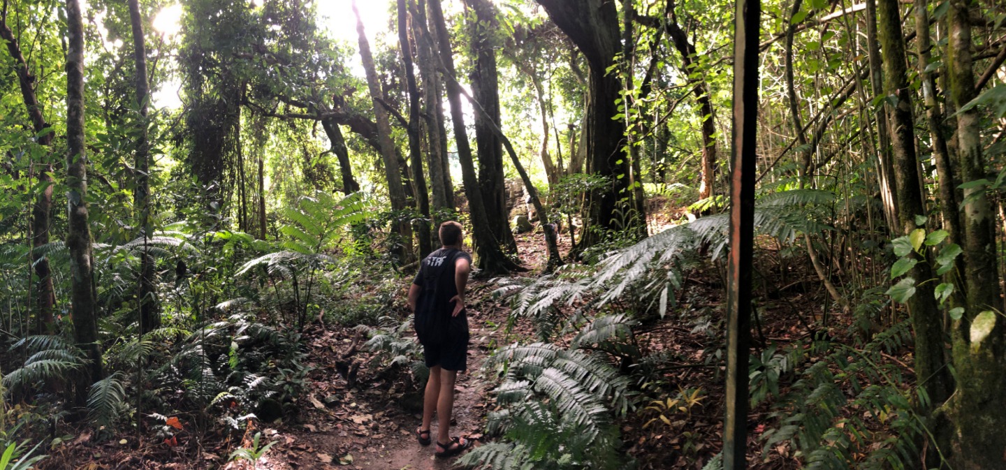 Today we stepped foot off the ship and headed for the forest. After a coffee cake breakfast prepared by head chef Garrison, the crew and staff members Tim, Amanda, and James prepared for a several-hour hike across the island. We began sometime around 9 am and made our way to the trail through the city and different work sites that laid before its entrance. After we reached the entrance, the terrain began to slope upwards and fast. A thick canopy covered the trail for the next few hours with very few openings, and the ground was muddy, rocky, and rooted. Around midday, we made it to the top, where a large rock structure called the Needle stood towering over the island. It stood several hundred feet into the air with a small pathway that led only a small distance up it. We took two small groups separately along the side of the rock face trail, holding onto chains and rope drilled into the rock to stabilize ourselves. The view from the vantage point was shared with a lonesome chicken and an interesting tattooed man named Rah. Not very many hikes could equal the one today. The trail proved to be challenging, beautiful, and long. The trip ended around 2:30 on the south side of the island with a view of the ocean, and we eventually made our way along the roadside to a burger joint Tim told us we needed to try out. Tim once again did not lead us astray. The burgers hit the spot. We ventured back to the boat on a local bus and began the final study sessions for our first marine bio test tonight after dinner. During our free time, our friend Jack, the tour guide from the other night, brought us boxes of passion fruit. We parted ways with grateful goodbyes and a new friend. Tonight’s dinner, prepared by Garrison, was chicken with oven-baked potatoes, beets, steamed broccoli, and some killer leftovers. We closed dinner with a “happy birthday” for Evan, who turned 17 today. Happy birthday buddy. Tomorrow, we beach!