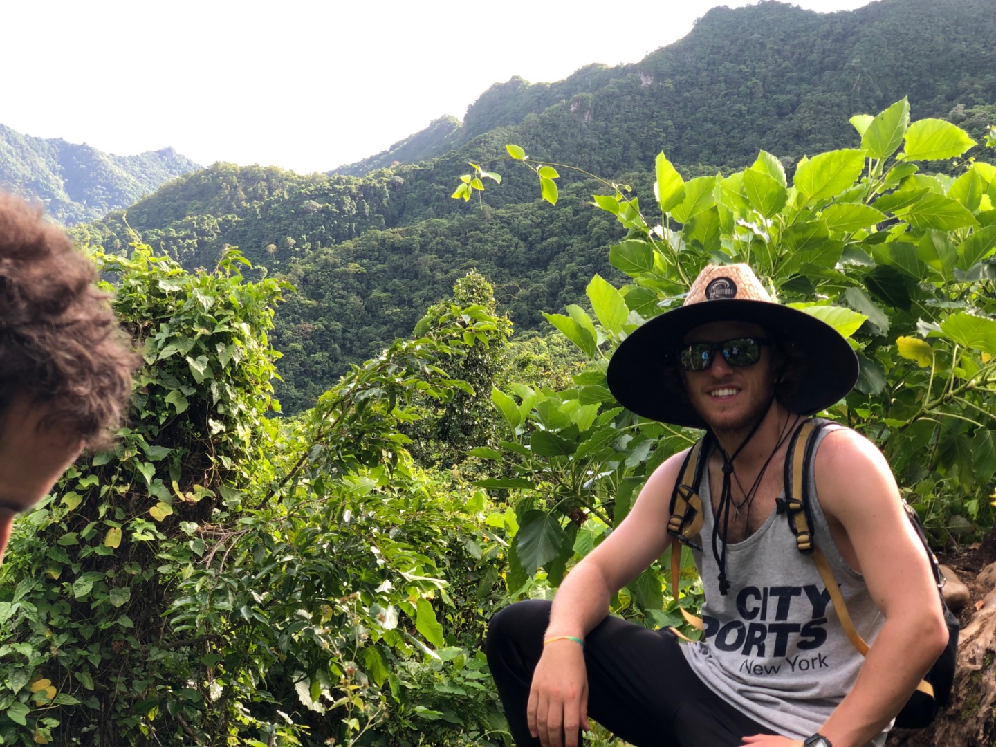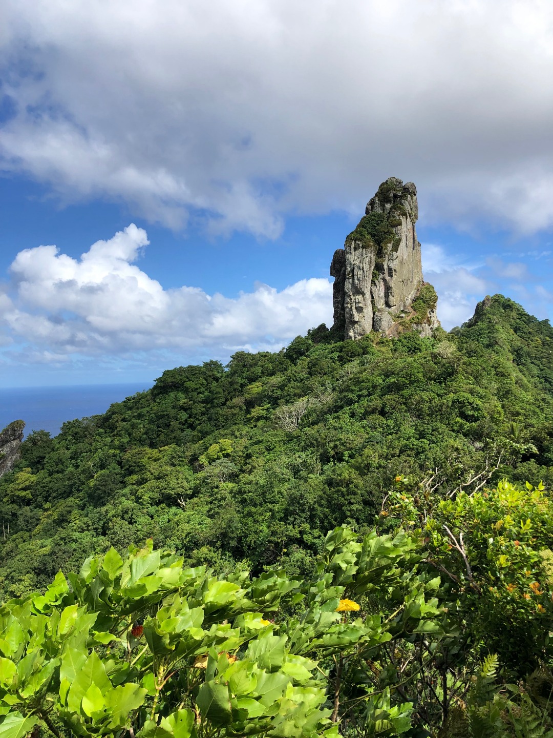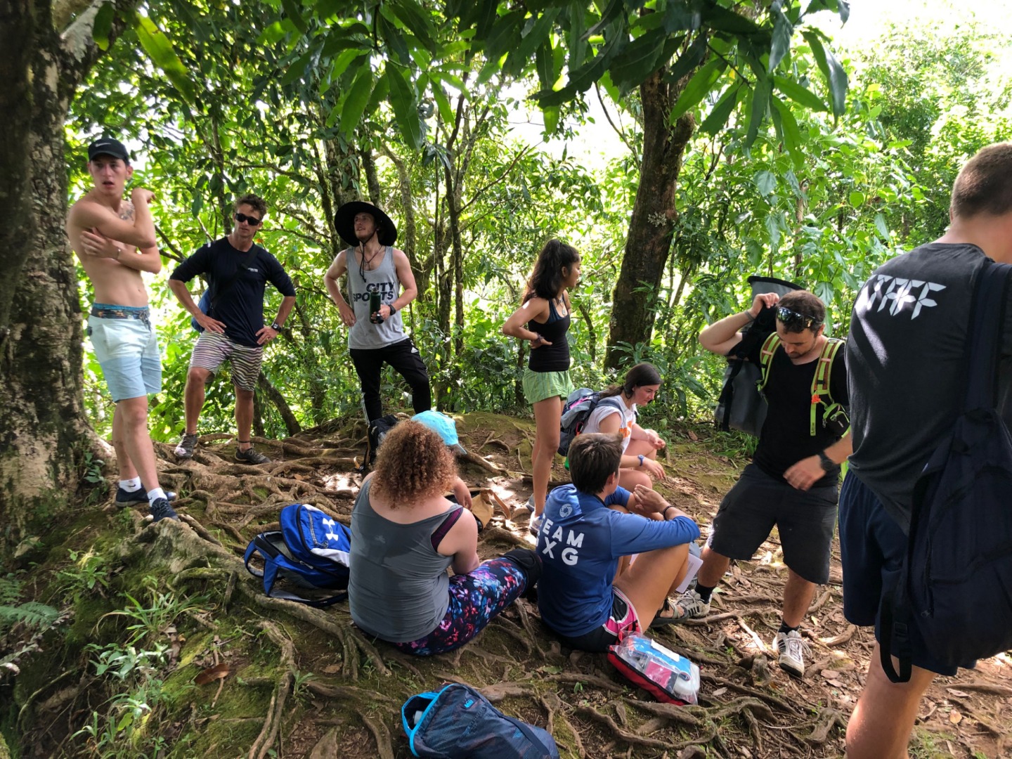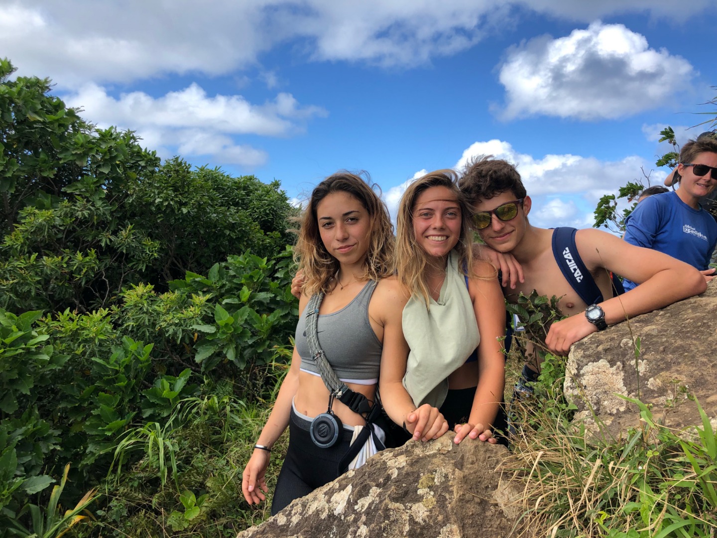 Today we stepped foot off the ship and headed for the forest. After a coffee cake breakfast prepared by head chef Garrison, the crew and staff members Tim, Amanda, and James prepared for a several-hour hike across the island. We began sometime around 9 am and made our way to the trail through the city and different work sites that laid before its entrance. After we reached the entrance, the terrain began to slope upwards and fast. A thick canopy covered the trail for the next few hours with very few openings, and the ground was muddy, rocky, and rooted. Around midday, we made it to the top, where a large rock structure called the Needle stood towering over the island. It stood several hundred feet into the air with a small pathway that led only a small distance up it. We took two small groups separately along the side of the rock face trail, holding onto chains and rope drilled into the rock to stabilize ourselves. The view from the vantage point was shared with a lonesome chicken and an interesting tattooed man named Rah. Not very many hikes could equal the one today. The trail proved to be challenging, beautiful, and long. The trip ended around 2:30 on the south side of the island with a view of the ocean, and we eventually made our way along the roadside to a burger joint Tim told us we needed to try out. Tim once again did not lead us astray. The burgers hit the spot. We ventured back to the boat on a local bus and began the final study sessions for our first marine bio test tonight after dinner. During our free time, our friend Jack, the tour guide from the other night, brought us boxes of passion fruit. We parted ways with grateful goodbyes and a new friend. Tonight’s dinner, prepared by Garrison, was chicken with oven-baked potatoes, beets, steamed broccoli, and some killer leftovers. We closed dinner with a “happy birthday” for Evan, who turned 17 today. Happy birthday buddy. Tomorrow, we beach!