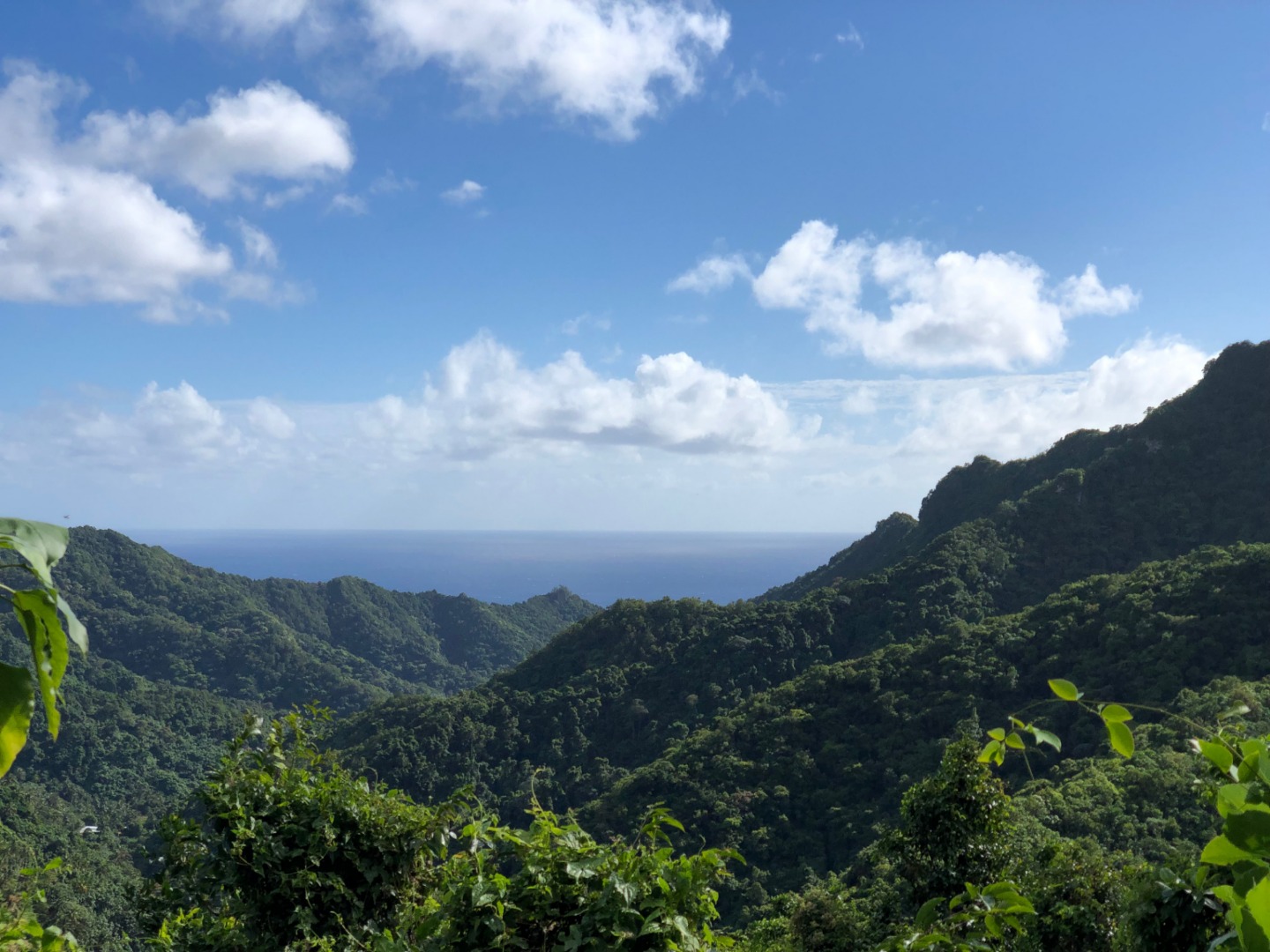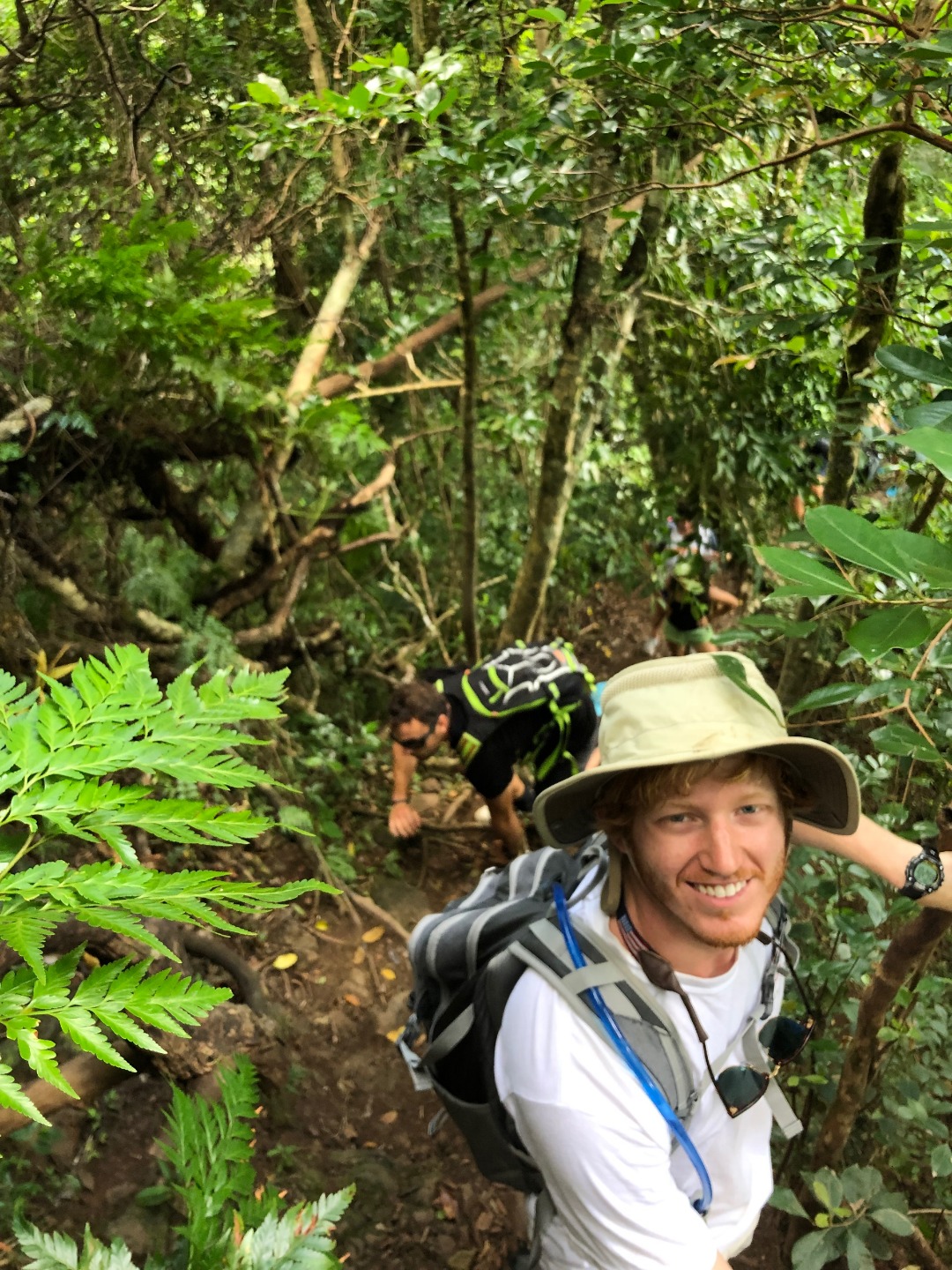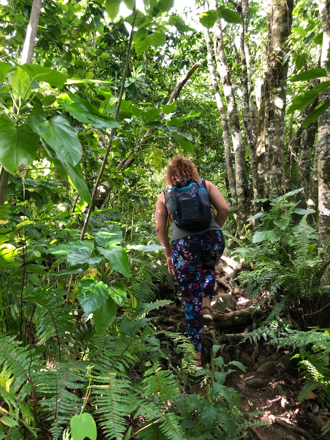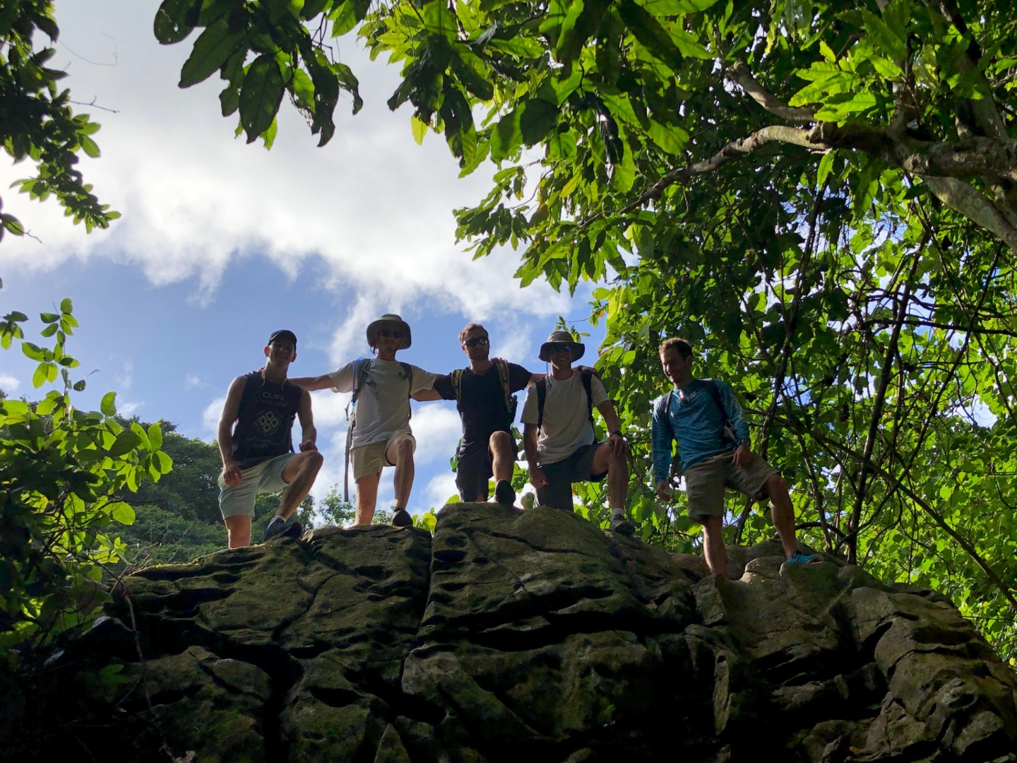 Today we stepped foot off the ship and headed for the forest. After a coffee cake breakfast prepared by head chef Garrison, the crew and staff members Tim, Amanda, and James prepared for a several-hour hike across the island. We began sometime around 9 am and made our way to the trail through the city and different work sites that laid before its entrance. After we reached the entrance, the terrain began to slope upwards and fast. A thick canopy covered the trail for the next few hours with very few openings, and the ground was muddy, rocky, and rooted. Around midday, we made it to the top, where a large rock structure called the Needle stood towering over the island. It stood several hundred feet into the air with a small pathway that led only a small distance up it. We took two small groups separately along the side of the rock face trail, holding onto chains and rope drilled into the rock to stabilize ourselves. The view from the vantage point was shared with a lonesome chicken and an interesting tattooed man named Rah. Not very many hikes could equal the one today. The trail proved to be challenging, beautiful, and long. The trip ended around 2:30 on the south side of the island with a view of the ocean, and we eventually made our way along the roadside to a burger joint Tim told us we needed to try out. Tim once again did not lead us astray. The burgers hit the spot. We ventured back to the boat on a local bus and began the final study sessions for our first marine bio test tonight after dinner. During our free time, our friend Jack, the tour guide from the other night, brought us boxes of passion fruit. We parted ways with grateful goodbyes and a new friend. Tonight’s dinner, prepared by Garrison, was chicken with oven-baked potatoes, beets, steamed broccoli, and some killer leftovers. We closed dinner with a “happy birthday” for Evan, who turned 17 today. Happy birthday buddy. Tomorrow, we beach!