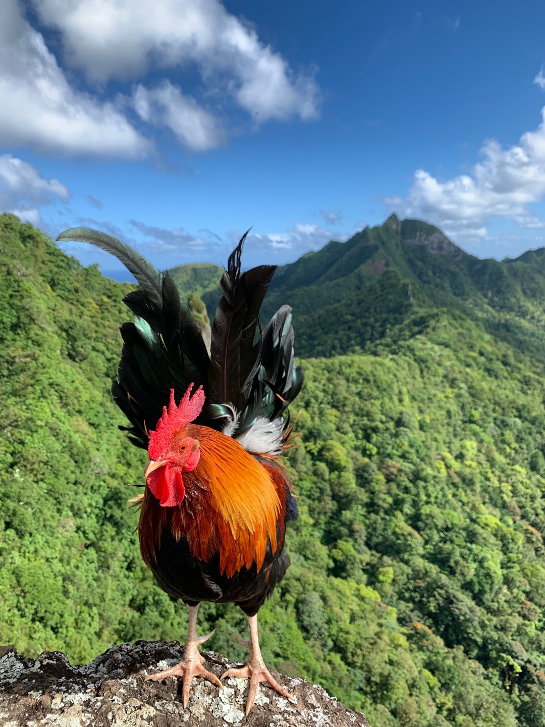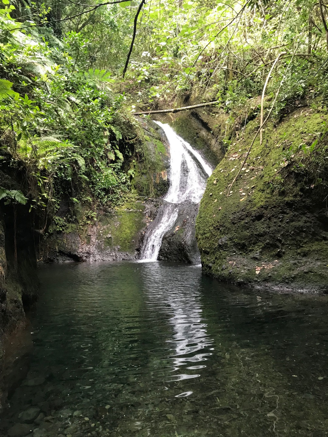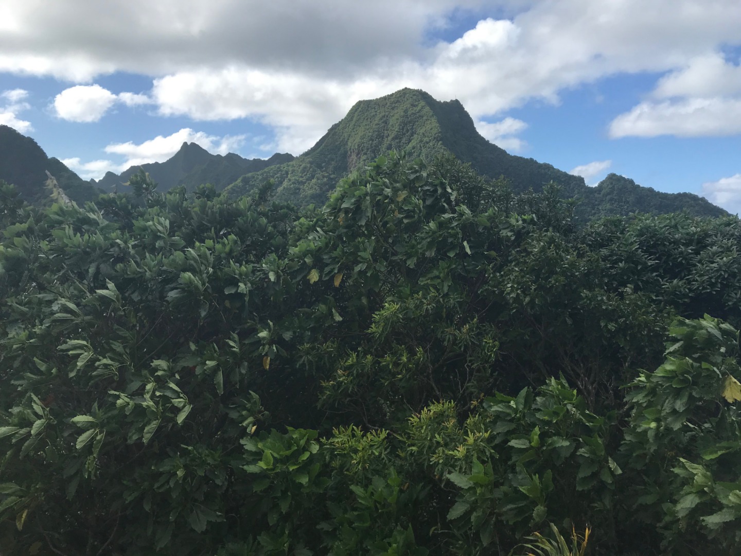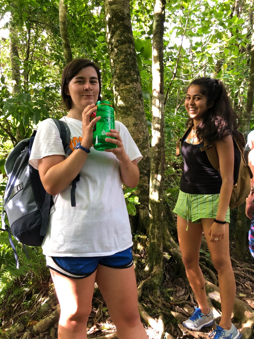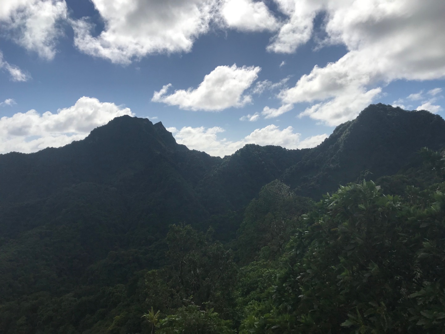 Today we stepped foot off the ship and headed for the forest. After a coffee cake breakfast prepared by head chef Garrison, the crew and staff members Tim, Amanda, and James prepared for a several-hour hike across the island. We began sometime around 9 am and made our way to the trail through the city and different work sites that laid before its entrance. After we reached the entrance, the terrain began to slope upwards and fast. A thick canopy covered the trail for the next few hours with very few openings, and the ground was muddy, rocky, and rooted. Around midday, we made it to the top, where a large rock structure called the Needle stood towering over the island. It stood several hundred feet into the air with a small pathway that led only a small distance up it. We took two small groups separately along the side of the rock face trail, holding onto chains and rope drilled into the rock to stabilize ourselves. The view from the vantage point was shared with a lonesome chicken and an interesting tattooed man named Rah. Not very many hikes could equal the one today. The trail proved to be challenging, beautiful, and long. The trip ended around 2:30 on the south side of the island with a view of the ocean, and we eventually made our way along the roadside to a burger joint Tim told us we needed to try out. Tim once again did not lead us astray. The burgers hit the spot. We ventured back to the boat on a local bus and began the final study sessions for our first marine bio test tonight after dinner. During our free time, our friend Jack, the tour guide from the other night, brought us boxes of passion fruit. We parted ways with grateful goodbyes and a new friend. Tonight’s dinner, prepared by Garrison, was chicken with oven-baked potatoes, beets, steamed broccoli, and some killer leftovers. We closed dinner with a “happy birthday” for Evan, who turned 17 today. Happy birthday buddy. Tomorrow, we beach!