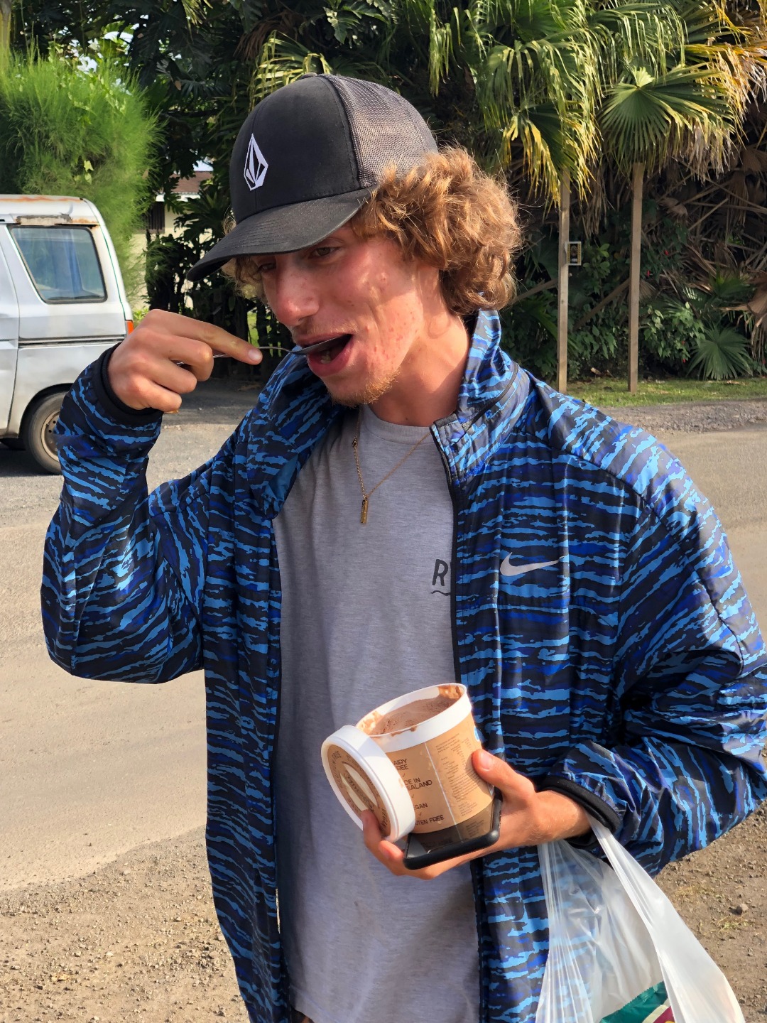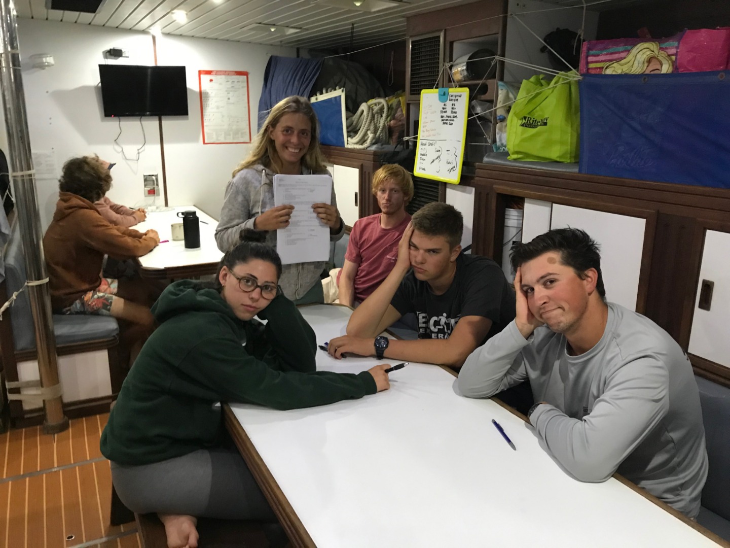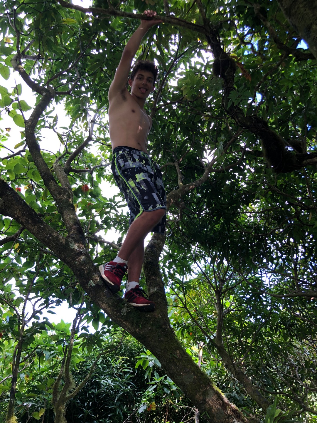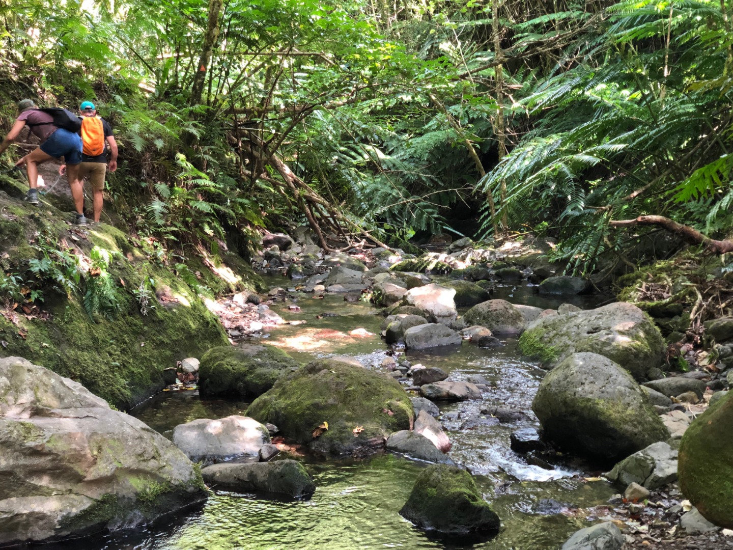 Today we stepped foot off the ship and headed for the forest. After a coffee cake breakfast prepared by head chef Garrison, the crew and staff members Tim, Amanda, and James prepared for a several-hour hike across the island. We began sometime around 9 am and made our way to the trail through the city and different work sites that laid before its entrance. After we reached the entrance, the terrain began to slope upwards and fast. A thick canopy covered the trail for the next few hours with very few openings, and the ground was muddy, rocky, and rooted. Around midday, we made it to the top, where a large rock structure called the Needle stood towering over the island. It stood several hundred feet into the air with a small pathway that led only a small distance up it. We took two small groups separately along the side of the rock face trail, holding onto chains and rope drilled into the rock to stabilize ourselves. The view from the vantage point was shared with a lonesome chicken and an interesting tattooed man named Rah. Not very many hikes could equal the one today. The trail proved to be challenging, beautiful, and long. The trip ended around 2:30 on the south side of the island with a view of the ocean, and we eventually made our way along the roadside to a burger joint Tim told us we needed to try out. Tim once again did not lead us astray. The burgers hit the spot. We ventured back to the boat on a local bus and began the final study sessions for our first marine bio test tonight after dinner. During our free time, our friend Jack, the tour guide from the other night, brought us boxes of passion fruit. We parted ways with grateful goodbyes and a new friend. Tonight’s dinner, prepared by Garrison, was chicken with oven-baked potatoes, beets, steamed broccoli, and some killer leftovers. We closed dinner with a “happy birthday” for Evan, who turned 17 today. Happy birthday buddy. Tomorrow, we beach!