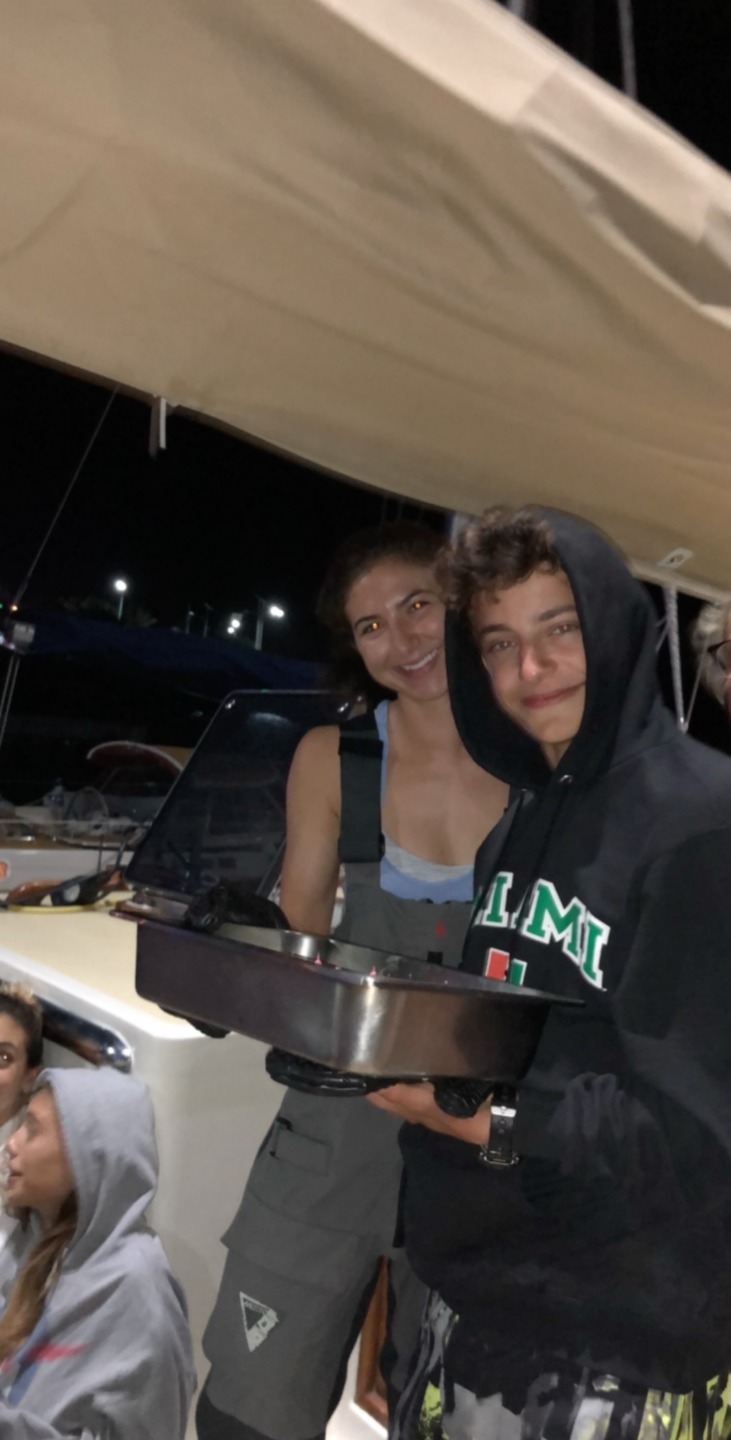 Pictured: Views from the cross-island hike; Panos enjoying his non-dairy ice cream from the shop at the end; Evan and his birthday dessert; Margaux excited but students sad to take the marine bio exam.