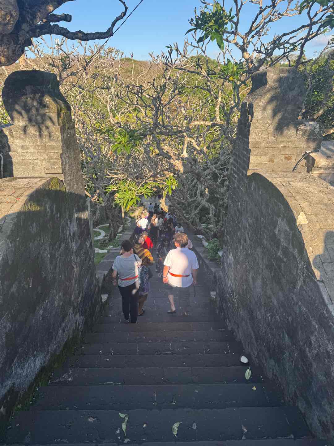 After a wonderful lunch of white bean soup with couscous prepared by Zoe, the team got ready to head out to Uluwatu, one of the most well-known and scenic temple sites in Bali. We met with our guide, Sudi, who had organized a bus to ferry us around Denpasar. Much to the enjoyment of all involved, the bus had unreal air conditioning and reclining seats, allowing for a pleasant ride in the midday heat. Below are some quotes from the team about this series of revelations.