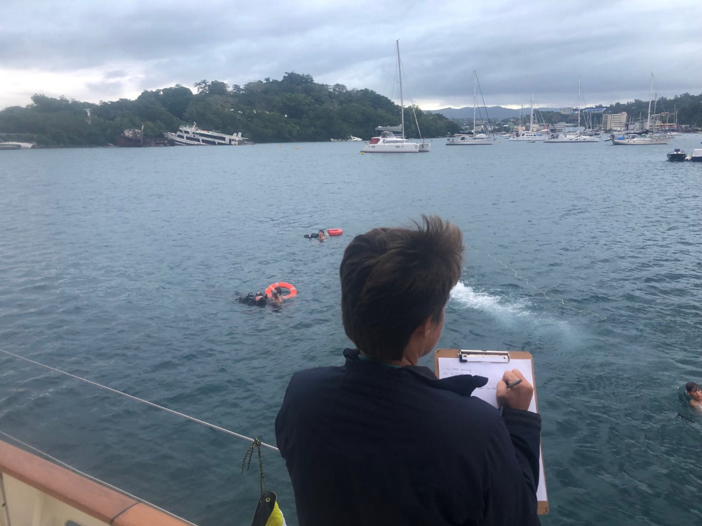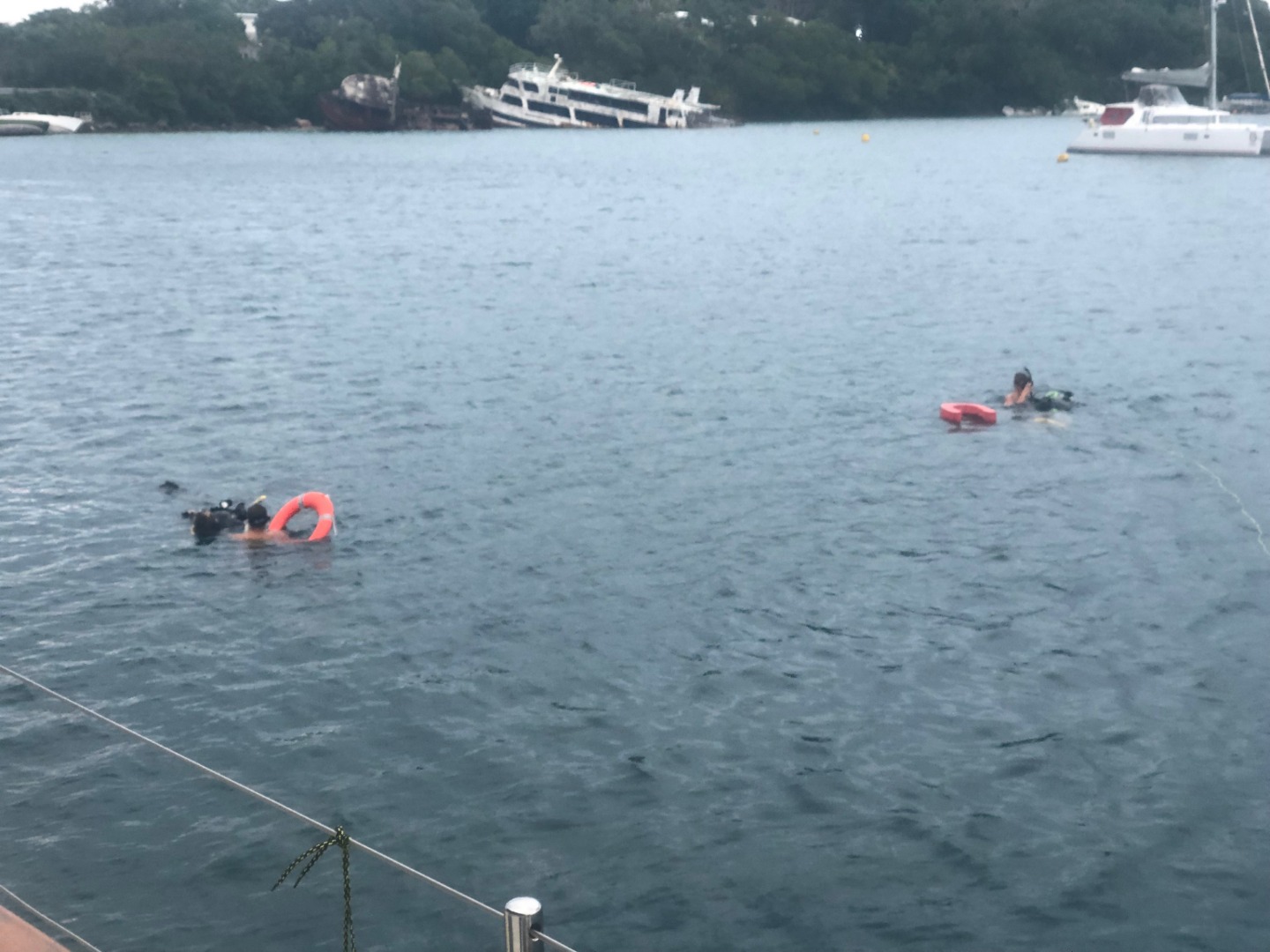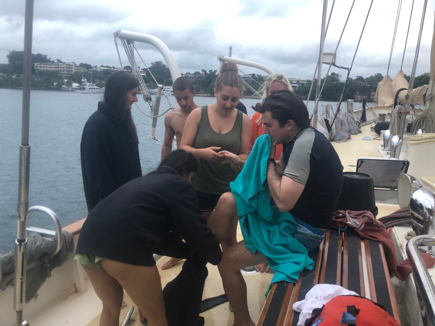 It came as a surprise when at 5 pm, Amanda called for help to rescue unconscious and panicked divers in the water. This was the first real rescue scenario for our rescue diver training. Tim and Ian, our actors, were first approached by Even and Garrison, who had been very prompt in jumping in the water to come to their aid. Frank and Danny followed closely to assist. Coral and Emily helped reassure Ian and stop him from getting hypothermia. Sam brilliantly pulled Tim out of the water into the dinghy in a flash. Anastacia and Maddie provided oxygen and CPR and managed to reanimate Tim, while Rhea and Kari managed the rescue logistics. As a team, they successfully rescued our captain and first mate. Felicitation!