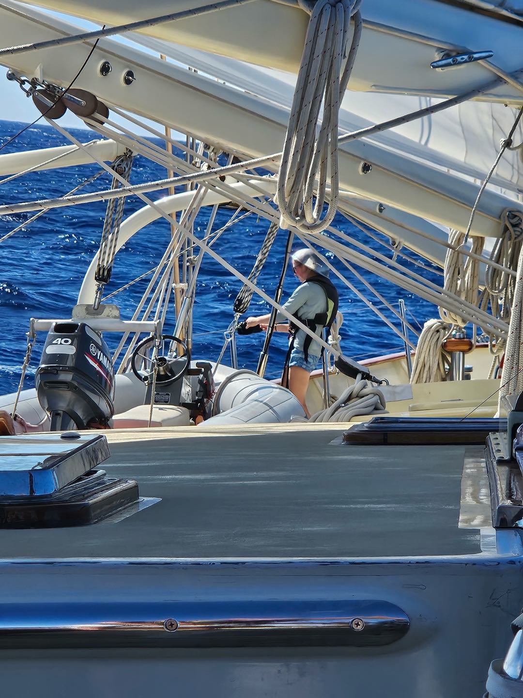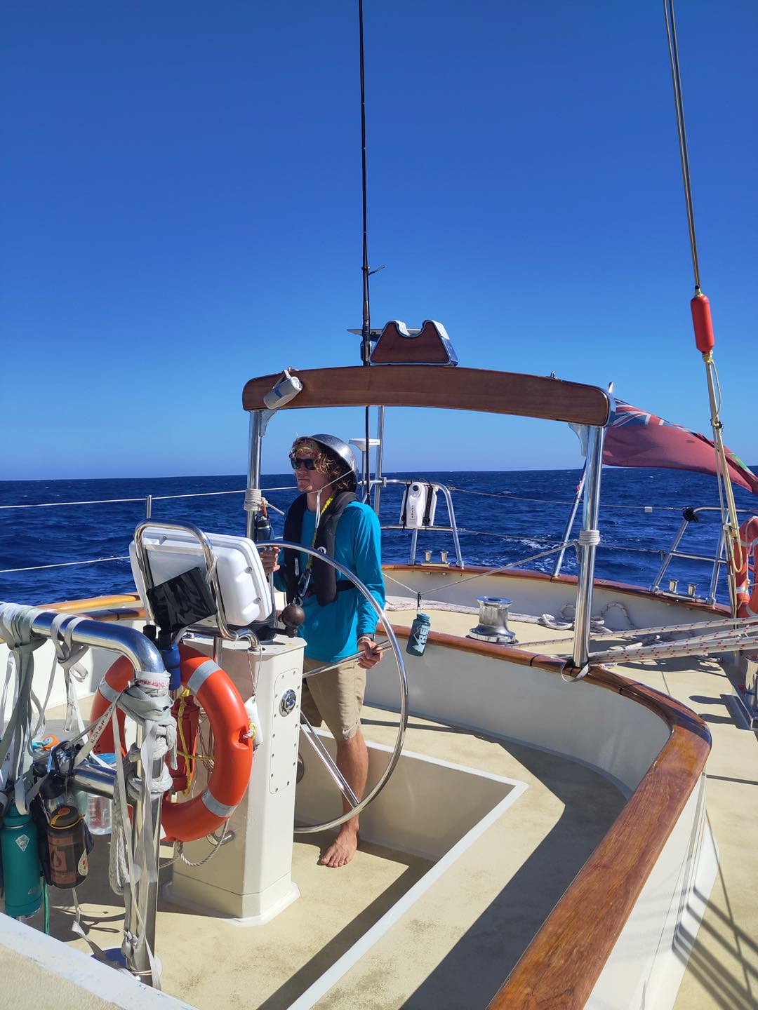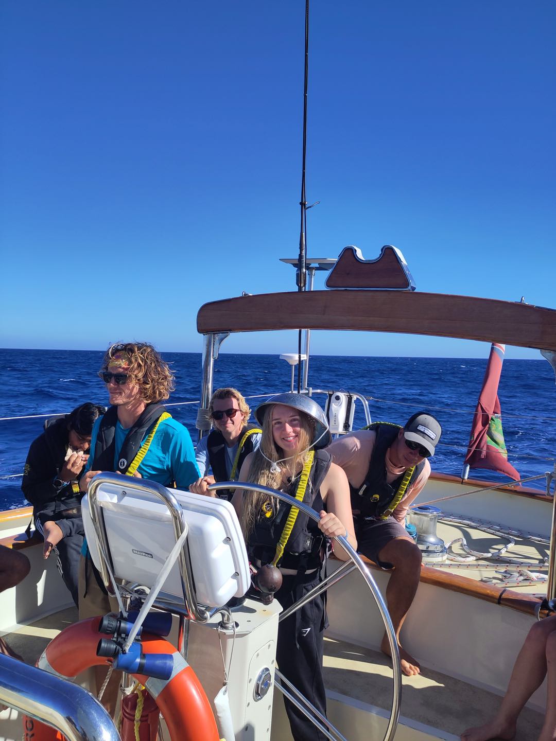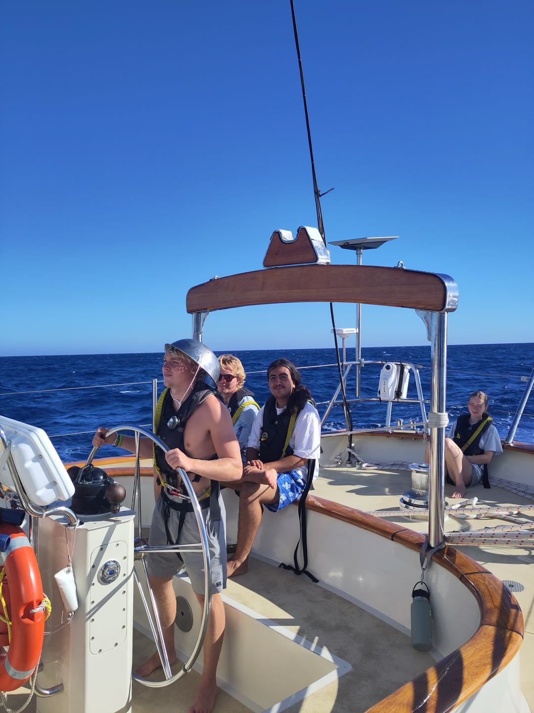 The morning started off early for watch team 2 (Meg, Aidan, Emily, Alexa, Liv, Sam, Jem, and Teo) on the 4-8 am watch. We spent most of the time solving riddles, such as what you can bring to the umbrella party or through the green glass door. The last hour, though, was spent coming up with the first prank of the program. As watch team 3 came up on watch, we told them an elaborate story about how our ‘radar reflector’ (this does not exist) fell off the mast, and we are now no longer visible on the radar to boats passing by. This means that part of the bow watch is also a radar watch. The person on the bow must wear the colander and point it in the direction of passing boats to ensure they see us on radar. The first person on watch team 3 to take on the task was Fish, who decided he wanted to go for his radar helmsona, Darth Radar. With Fish headed to the bow, the rest of watch team 3 came to the cockpit, where watch team 2 greeted them by singing happy birthday to Luca. Watch team 3 passed the time on watch by putting up the main sail and the jib. Nacho then taught Chloe, Sabrina, Matthew, Ben, and Maria how to put up the running back stays. This kept them busy until it was time for lunch. Teagan chefed up a delicious buffalo chickpea salad to help fuel us through our day. Much needed as the king of time made an appearance, and we are changing time zones, so the sun no longer rises at 9 am. The afternoon consisted of Marine Biology class, where I taught about estuaries and how they were formed. Then Shane took over and taught the estimated time of arrival for Navmaster.