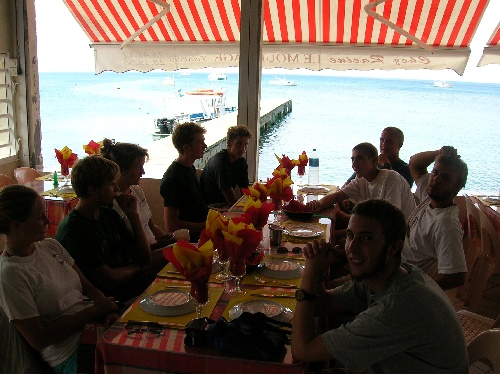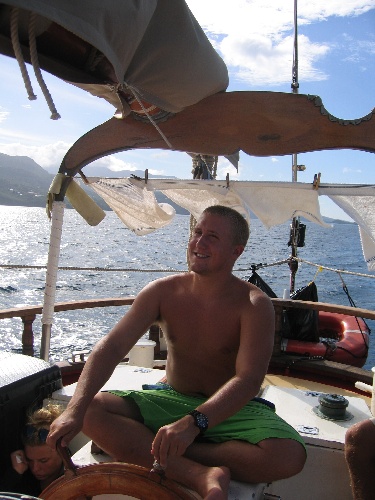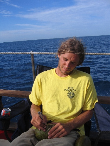 We rose at 04:30 to do our dawn dive at the Jacque Cousteau Marine Park on Julia’s birthday. It was an exciting dive, especially being underwater as the sun rose. When we returned, we ate a delicious breakfast of blintzes and motored to Deshaies, Nips, and Kevin worked on their craft work underway, carving coconut shells and calabash. We had some shore time in Deshaies and then a scheduling meeting. We enjoyed a delicious dinner of tropical chicken, pineapple rice, sweetcorn fritters, freshly baked bread, and flaming bananas, expertly prepared by Sarah and Drew. Then prepared the boat for a passage to Antigua and got some rest. Yipekaya.