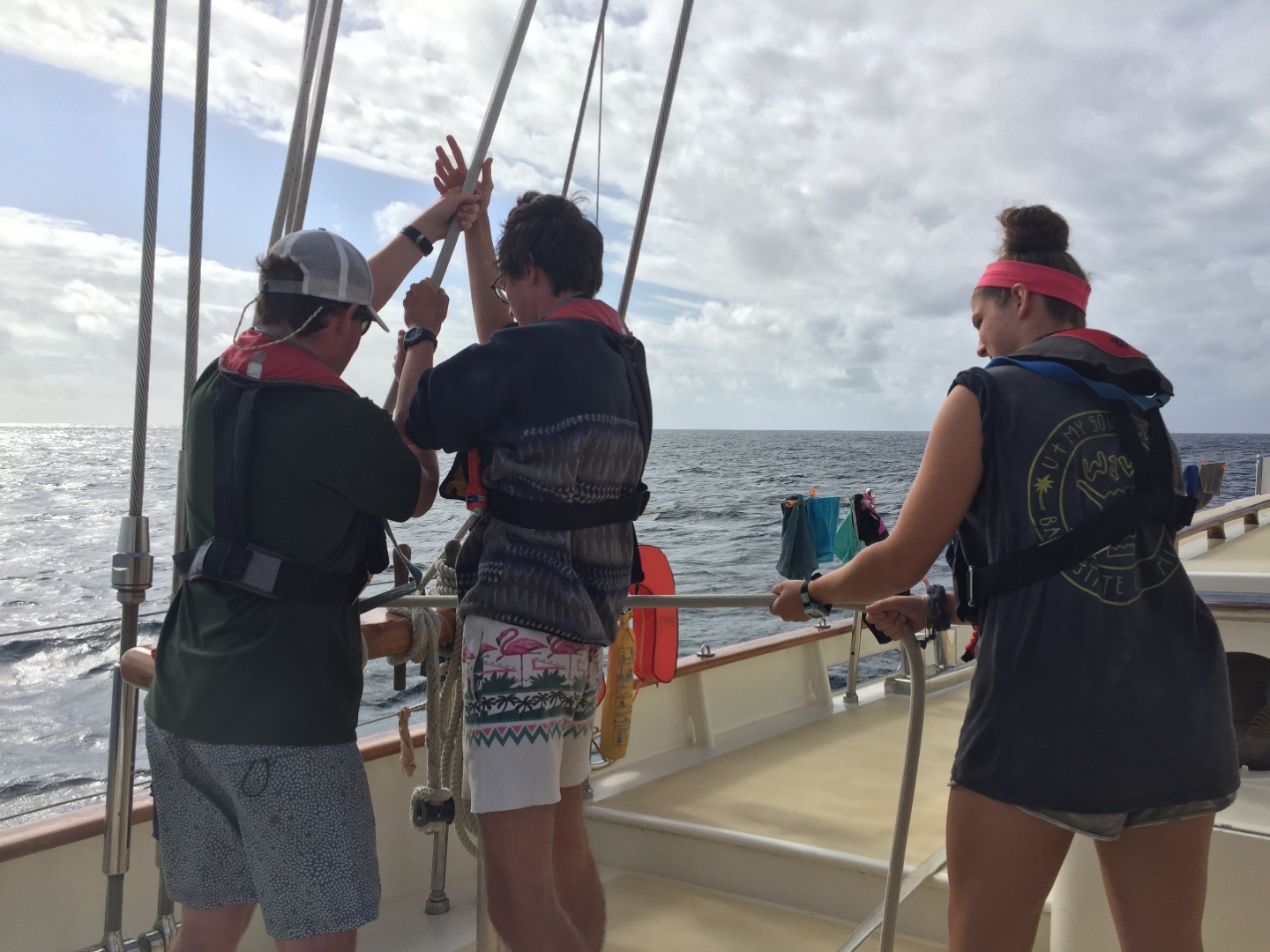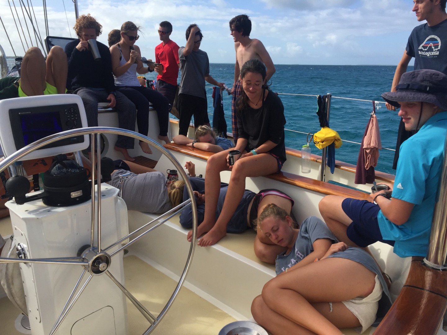 Going back to the crumb cake, since we were all in such major food comas, some of us decided to preemptively take Dramamine for the anticipated seasickness that would come about once we were underway. Little did we know, the Dramamine would cause some serious drowsiness, and that the drowsiness would come at the exact time we needed to raise three sails. We divided into watch teams: watch team one on the mainsail, watch team two on the anchor and forward staysail, and watch team three on the main staysail. At about 3:30 pm, half the crew was zonked on the deck, some even catching some shut-eye under the dinghy while waiting their turn to raise a sail. Despite most of us being sleepy, we managed to raise Argo’s sails to begin our voyage across the Indian Ocean!