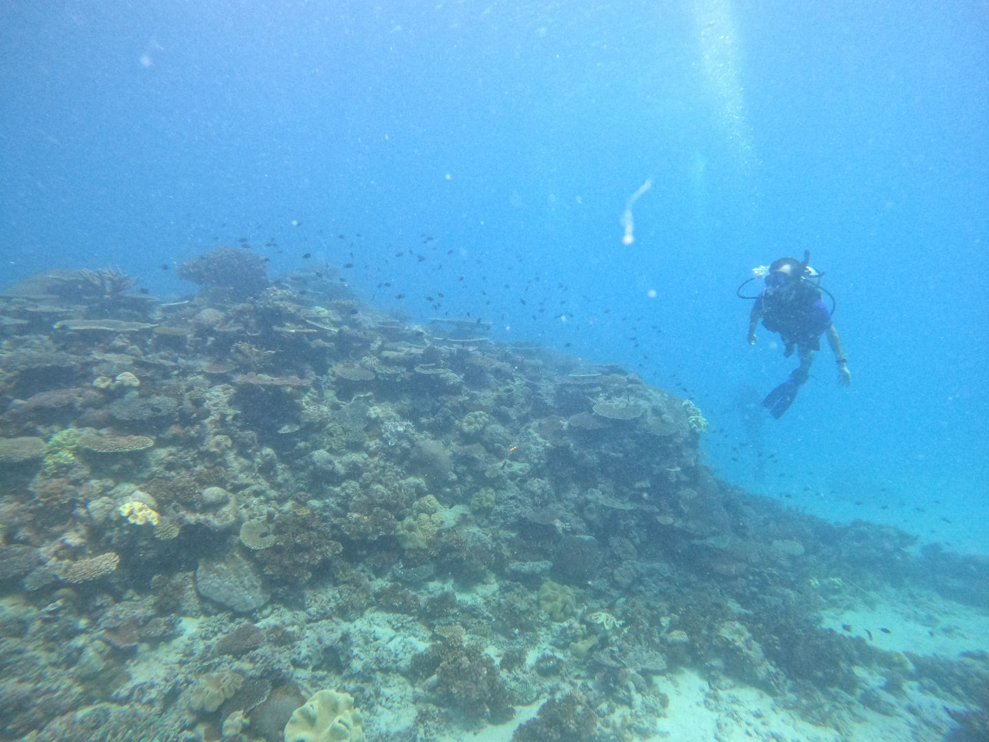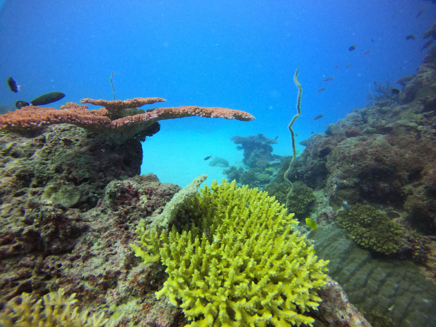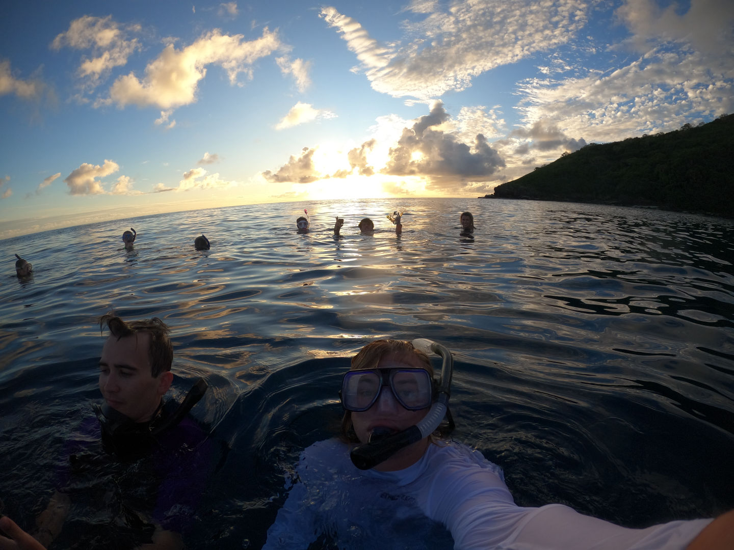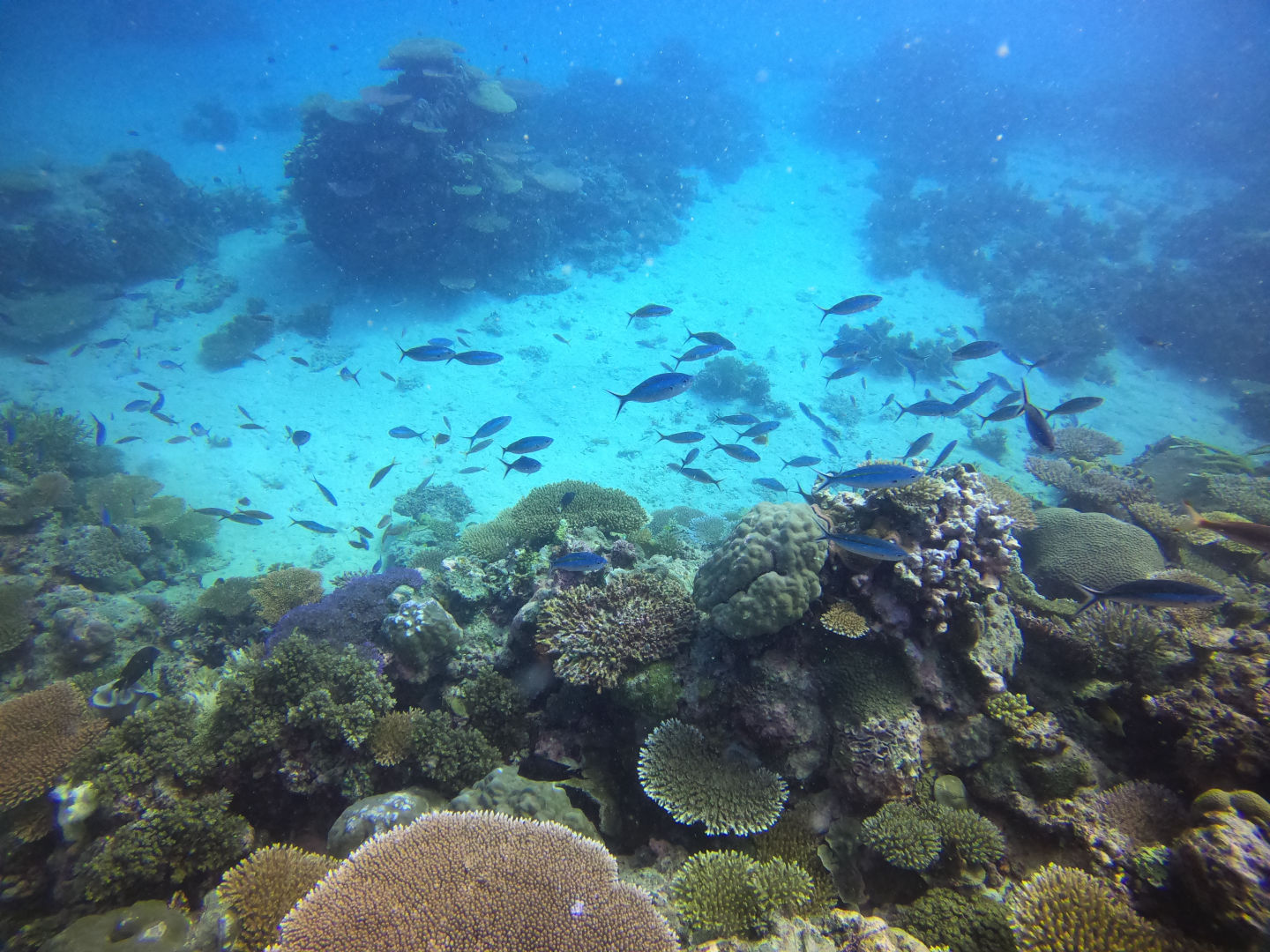 We got back to the boat and had a delicious lunch waiting for us. After breaking down our gear and cleaning up, we got ready to snorkel the manta pass. This is a shallow, narrow pass with a nutrient-rich current where mantas often come to feed. We were all really hoping to see a manta here, but unfortunately, today was not the day. We did, however, still have an incredible experience snorkeling the pass with all the incredible corals and, honestly, the biggest schools of reef fish I’ve ever seen. There was a good current kicking even as we entered the pass right around high tide. We all drifted along one by one, just watching all the fish dance along below us. Sierra and Dray had two cute little pilot fish decide to follow them along, which was adorable. Margaret was in the water near me and pointed out another white tip reef shark just peacefully cruising along the bottom. It sure is neat watching them glide around seemingly so effortlessly.